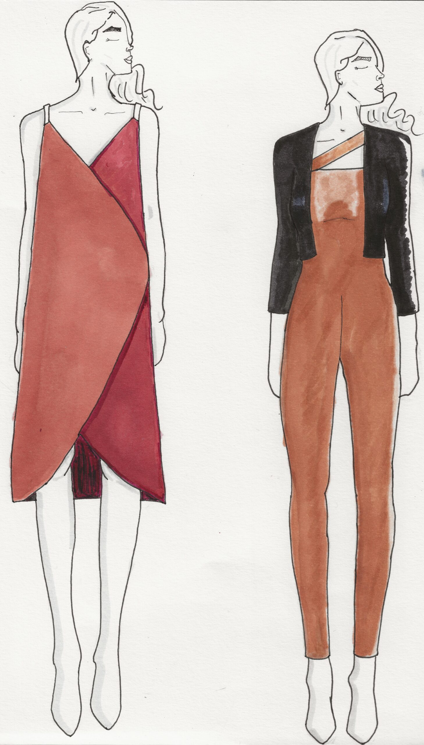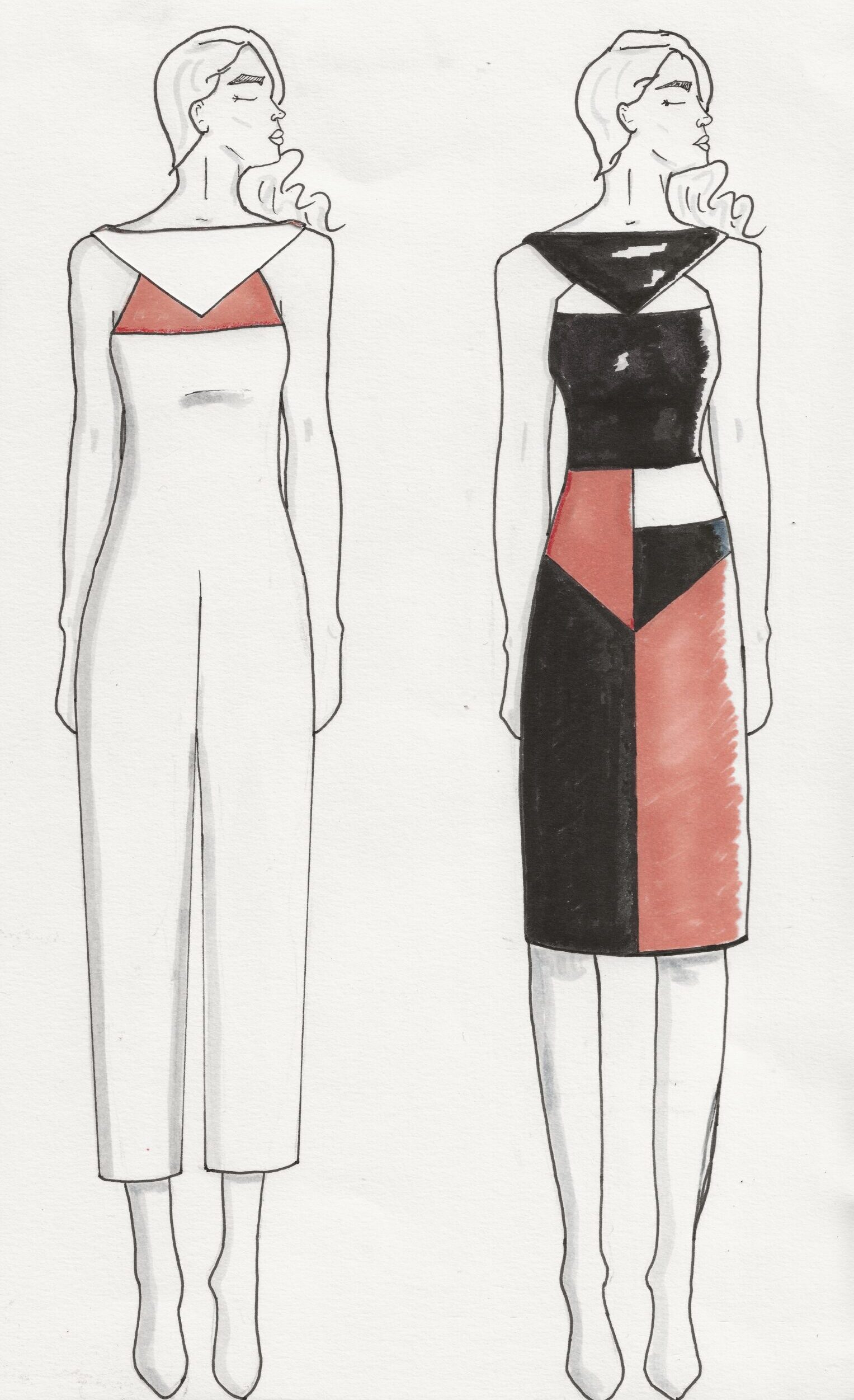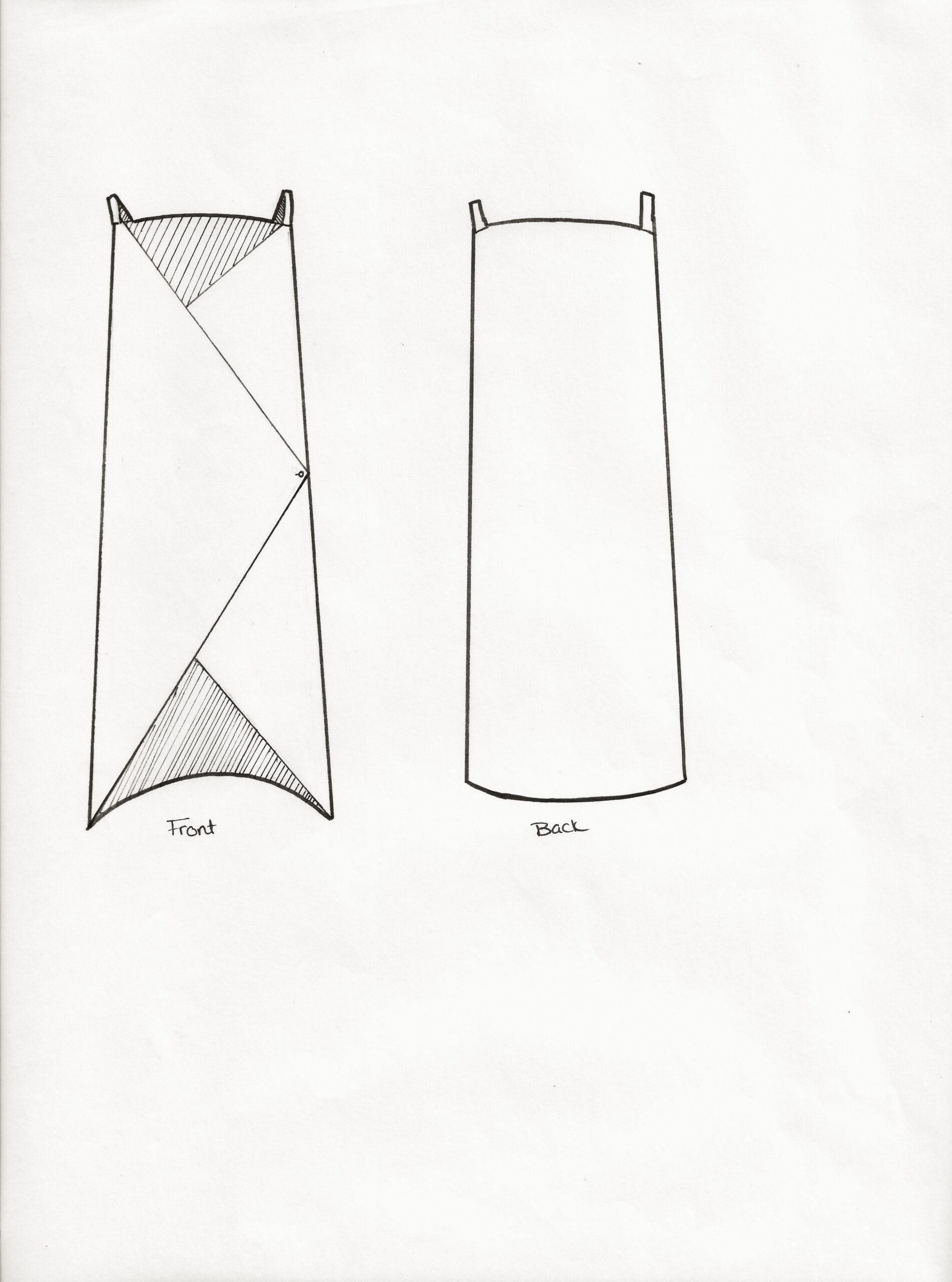 [ 02 ] Hand-drawn flat of a sleeveless, two-toned wrap dress that buttons on the side