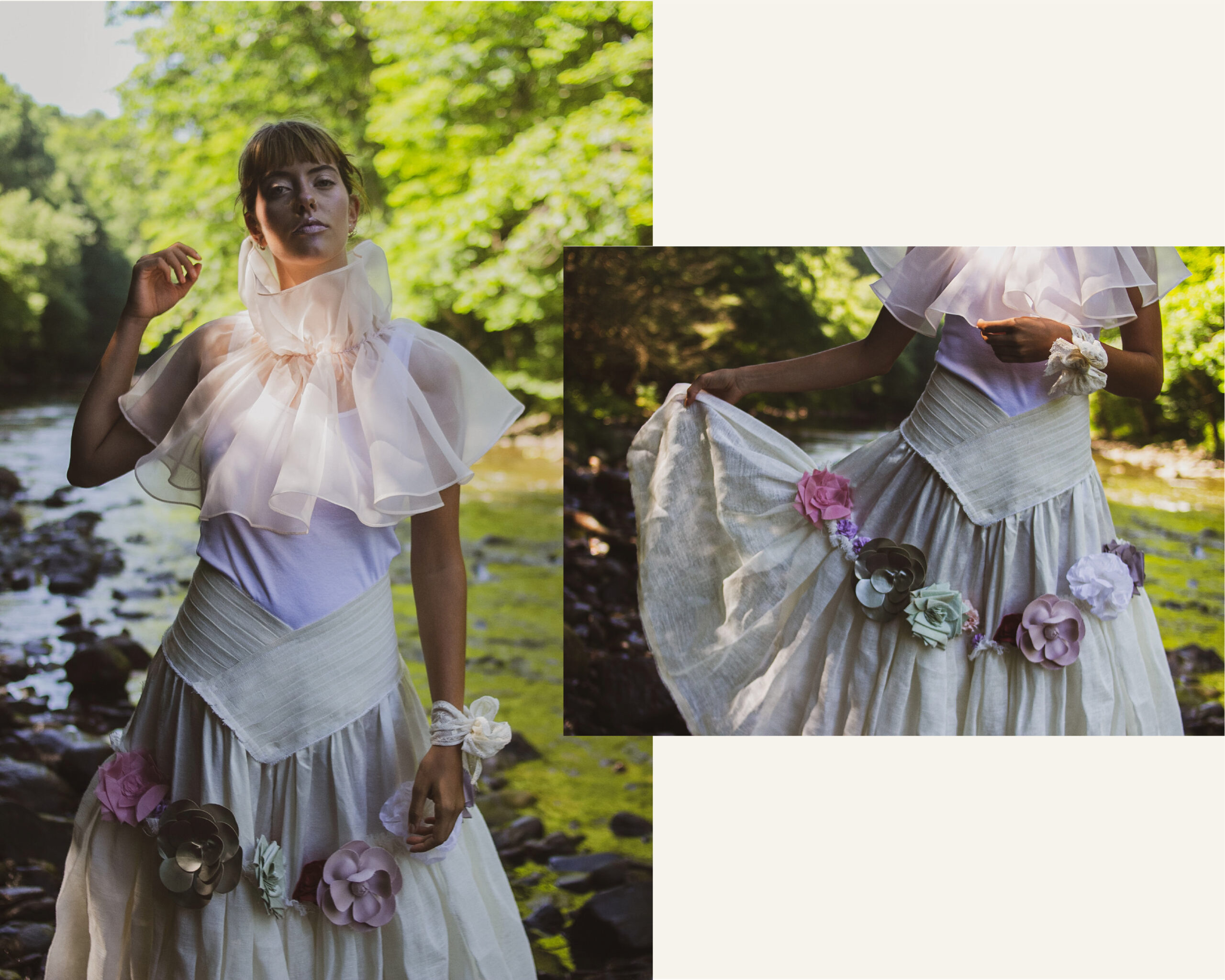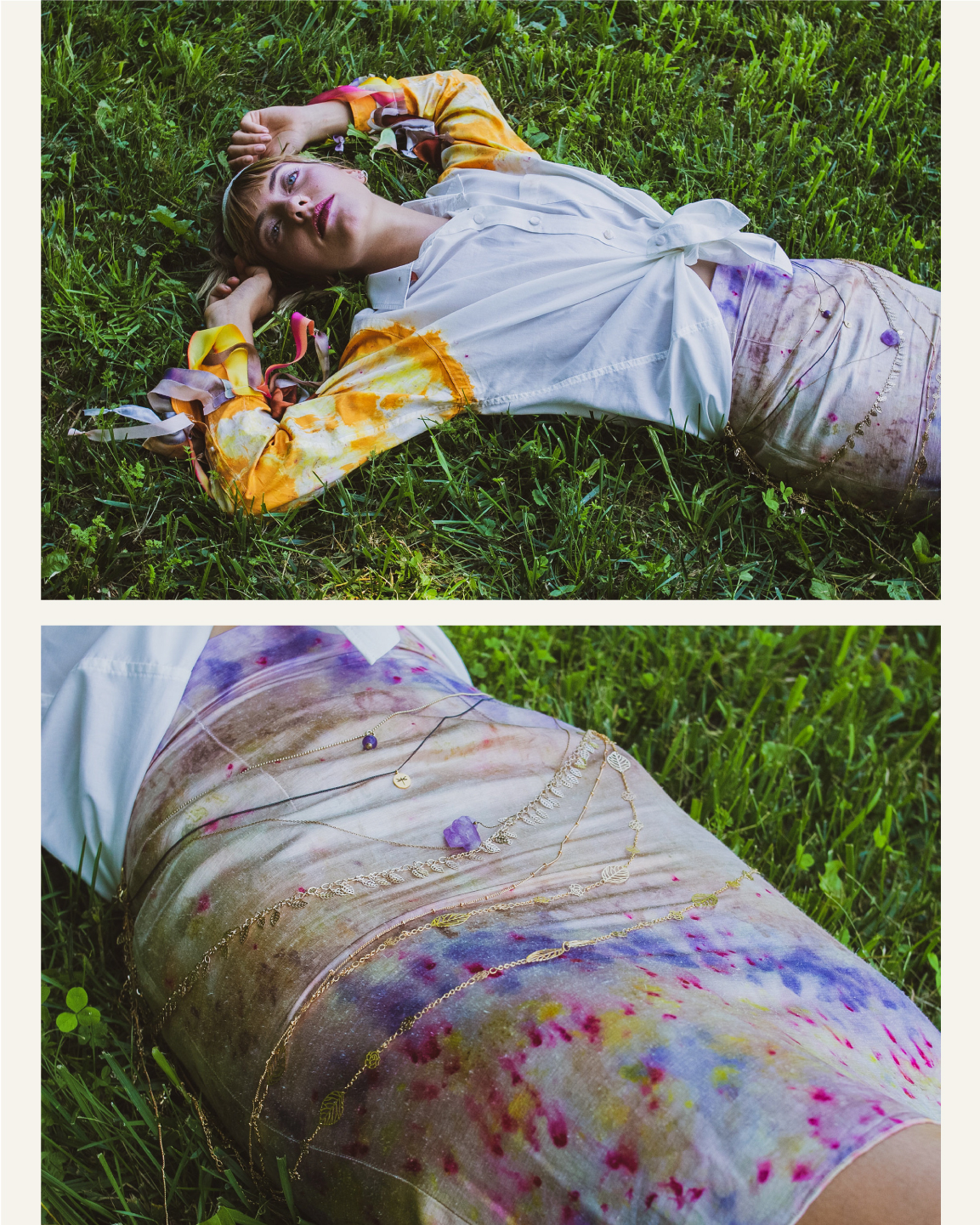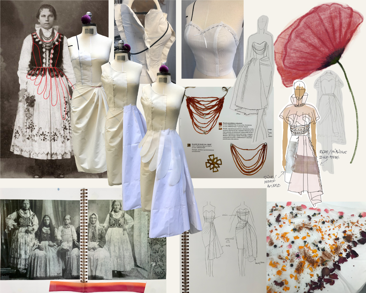 [ 03 ] Fabrication & Textile Manipulation I Including various methods of natural hand dyeing of silk satin, silk organza, and linen mesh; felted silk&hemp satin blend, cotton lace, wool threads, and beads in different variations; Polish vintage cotton needle lace from the 1930s