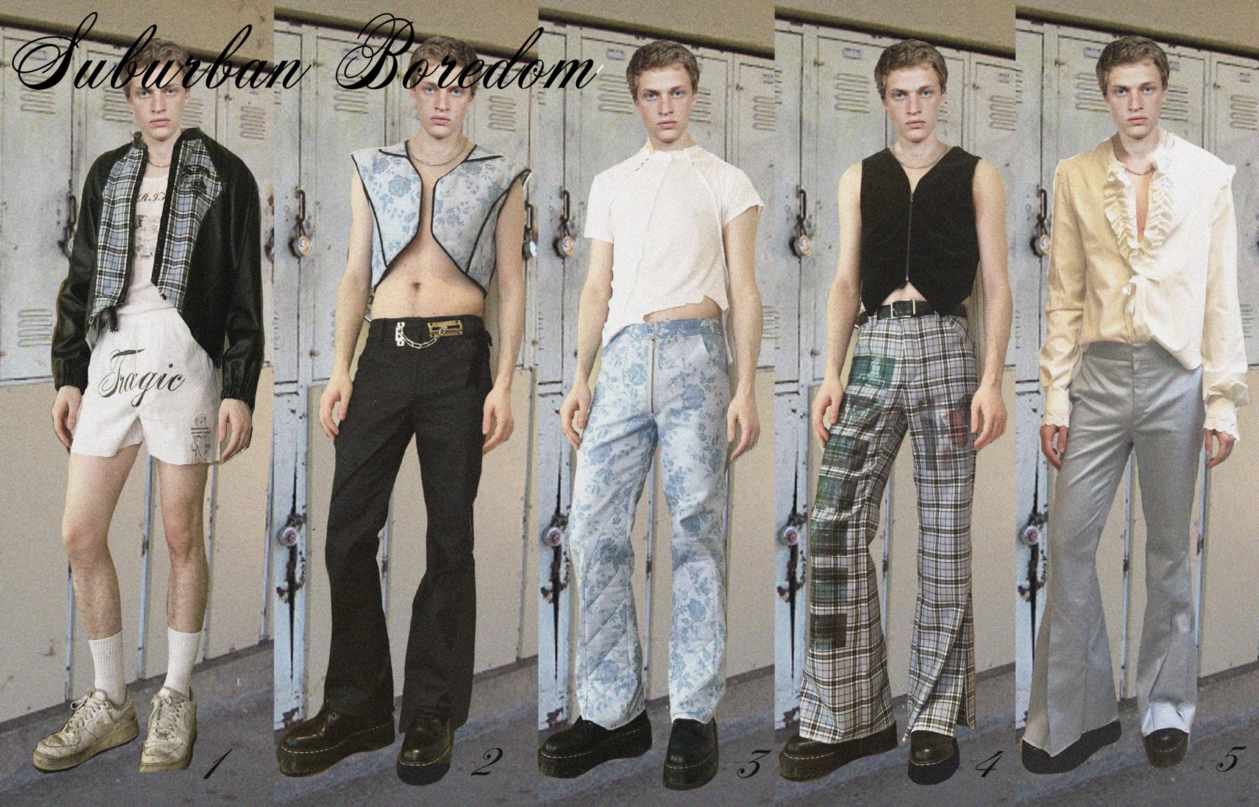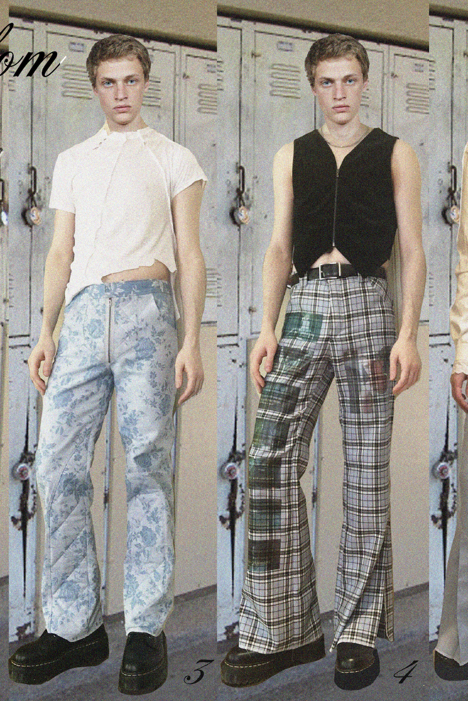 [ 08 ] [Left] Distressed tee over upholstered biker jeans; [Right] Velvet zip-up vest and printed plaid trousers