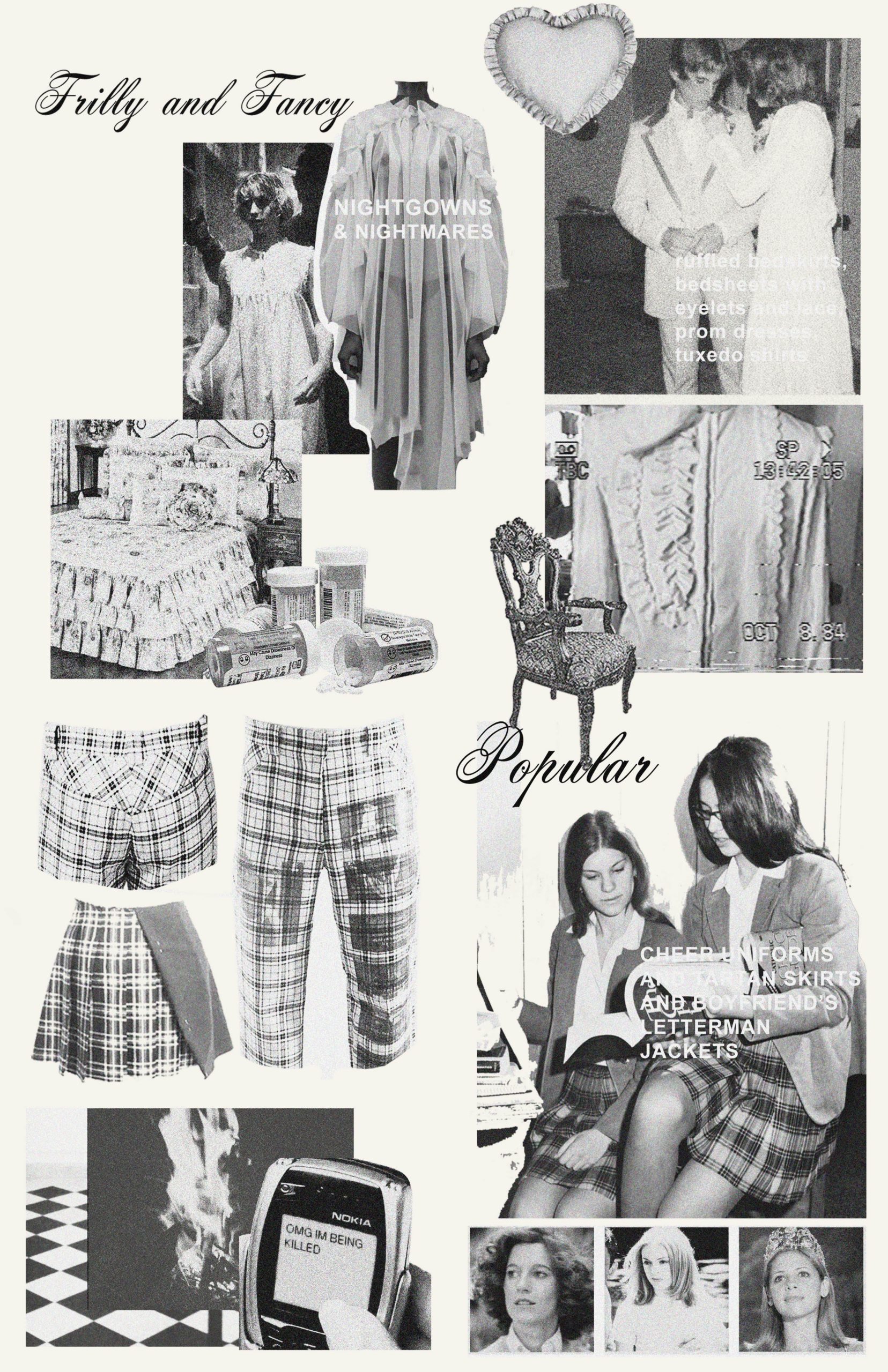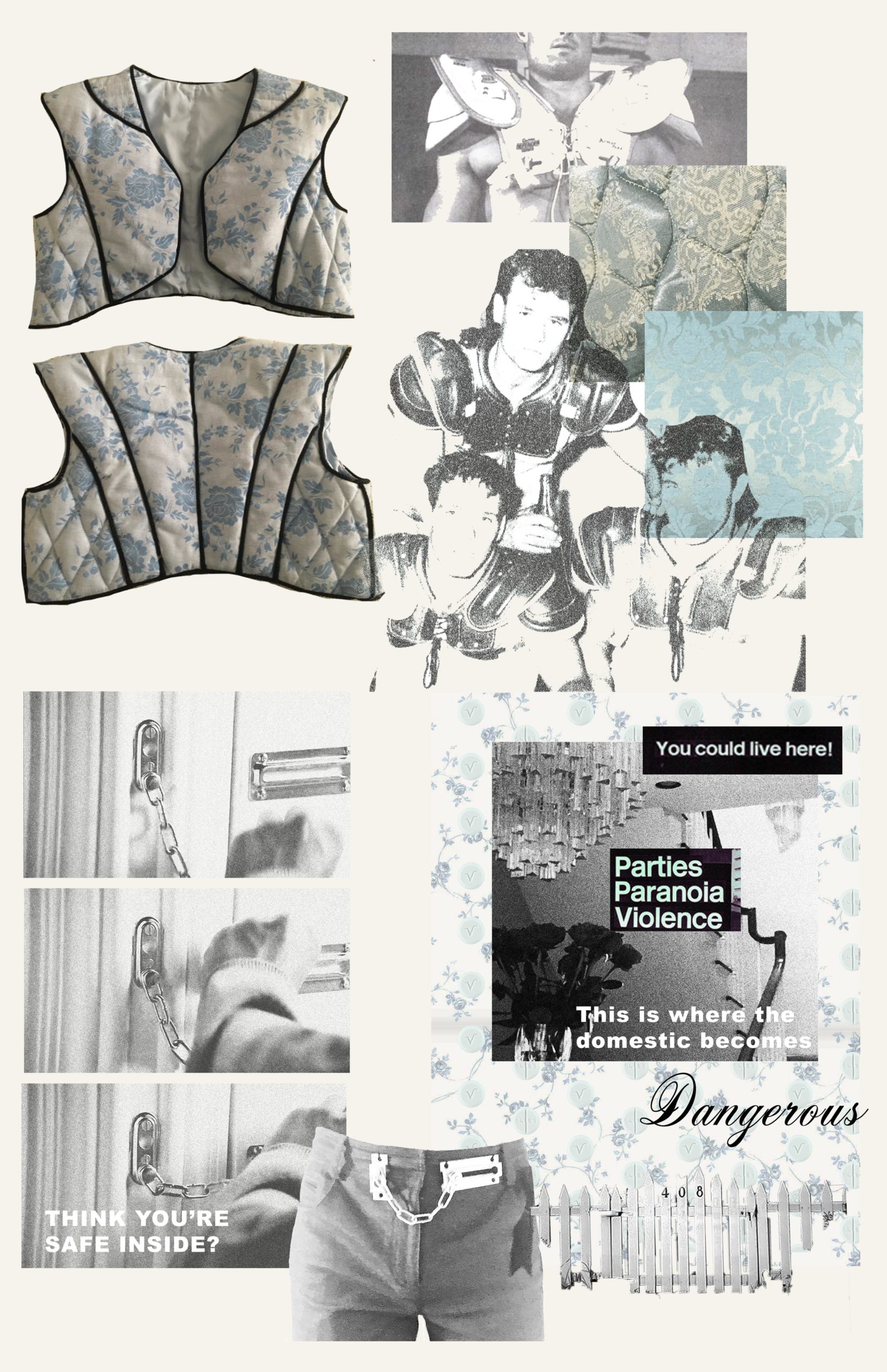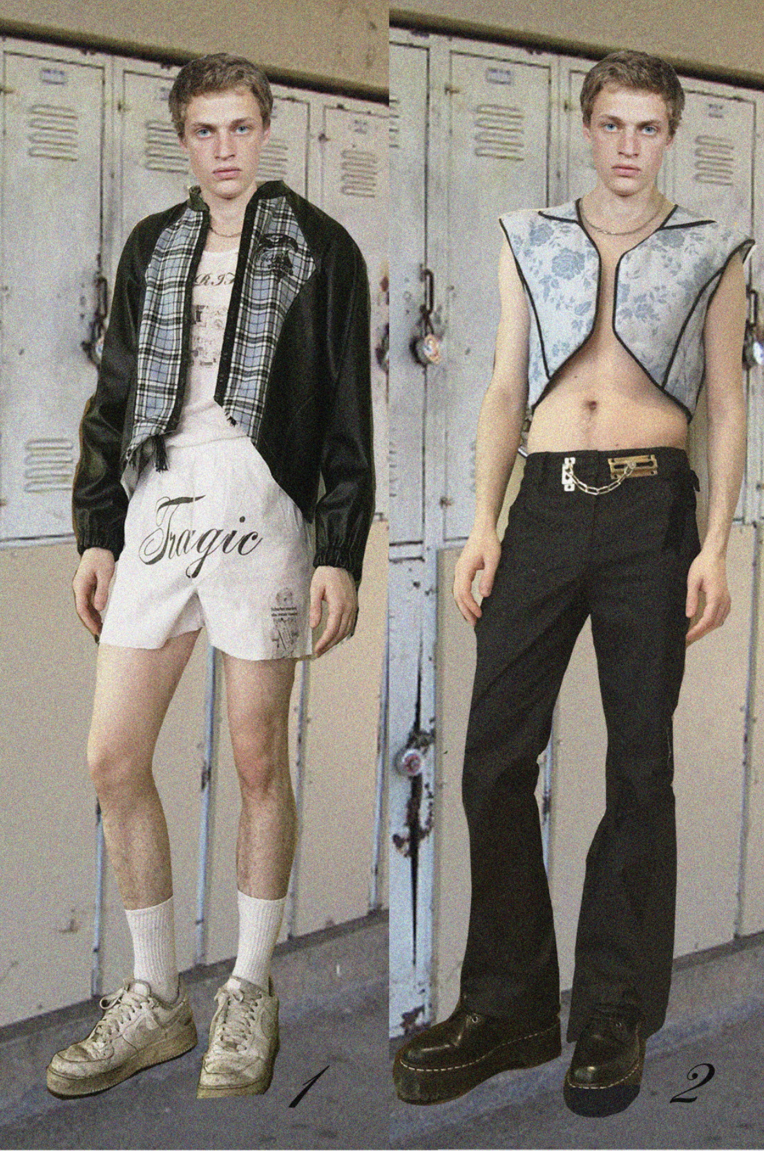 [ 05 ] [Left] Letterman jacket over printed beater and white cotton shorts; [Right] Upholstered football vest with chain-lock trousers