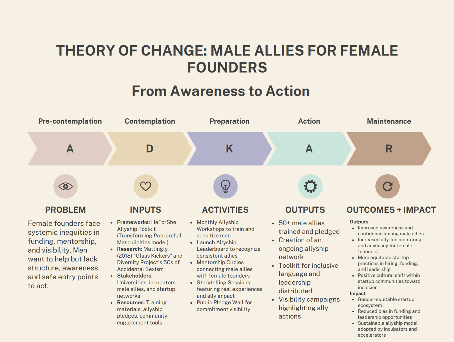 A systemic allyship model that operationalizes safe, accountable, and structured support from men for early-stage women founders.