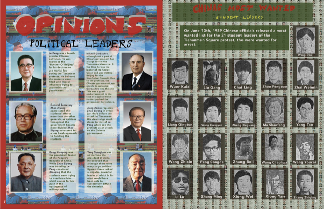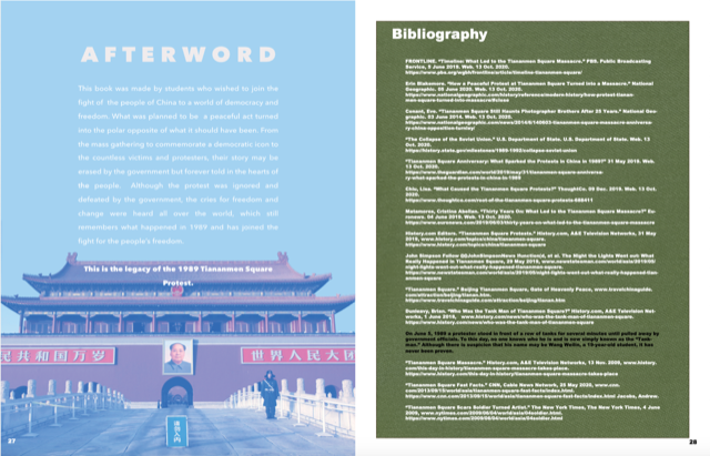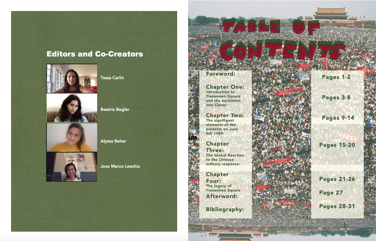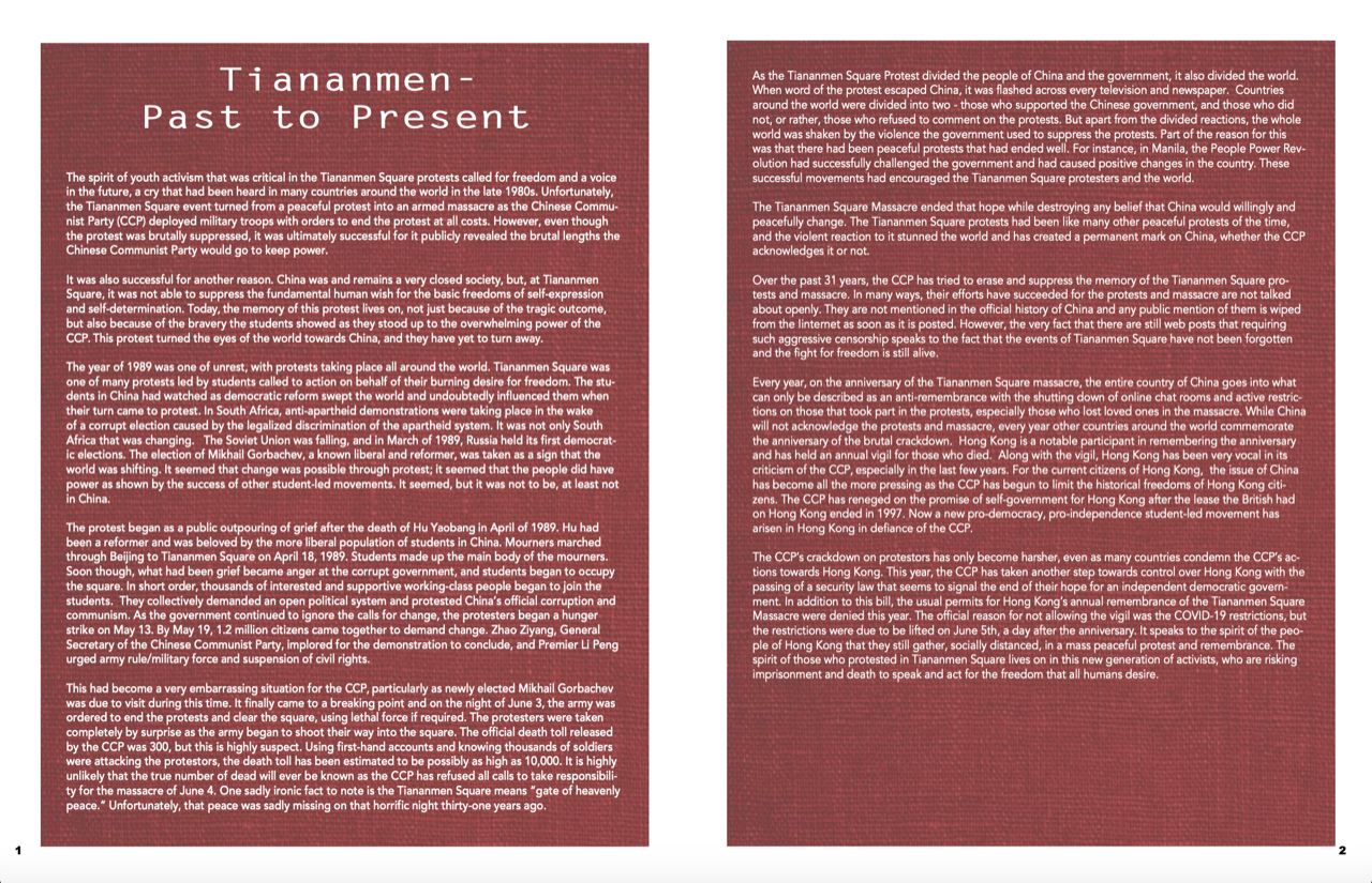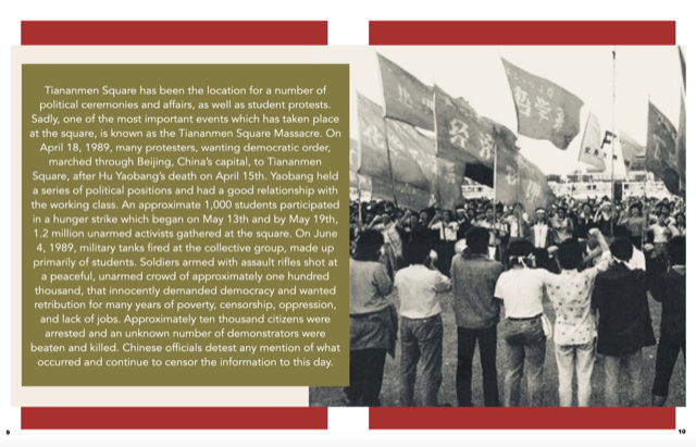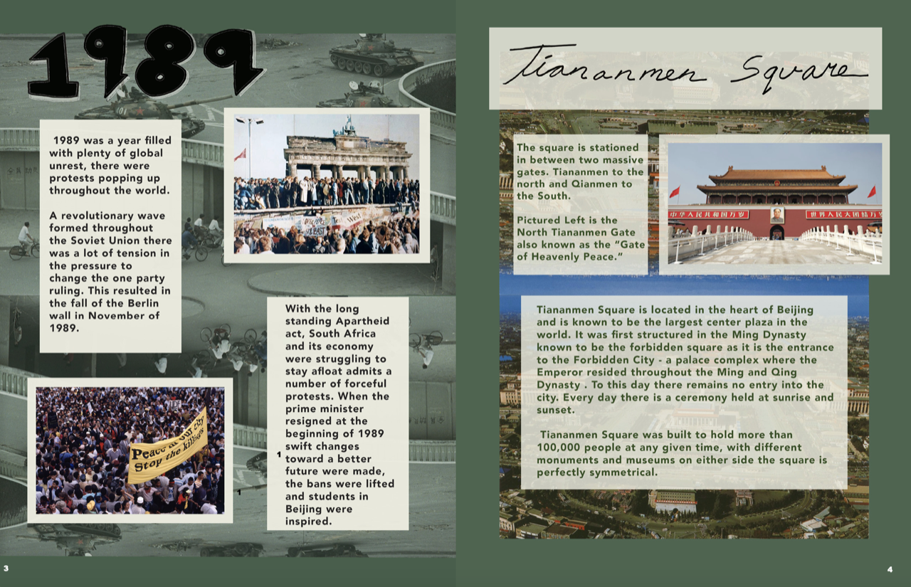 In Professor Demi Adeniran’s Integrative Studio and Sarah Montague’s Integrative Seminar class, students Tessa Carlin, Alyssa Behar, Jose Marco Leechiu, and Beatrix Begler spent the term studying art and design through a social justice lens. This theme brought them to their final project, creating a fact book and virtual exhibition about the Tiananmen Square Protests and Massacre.