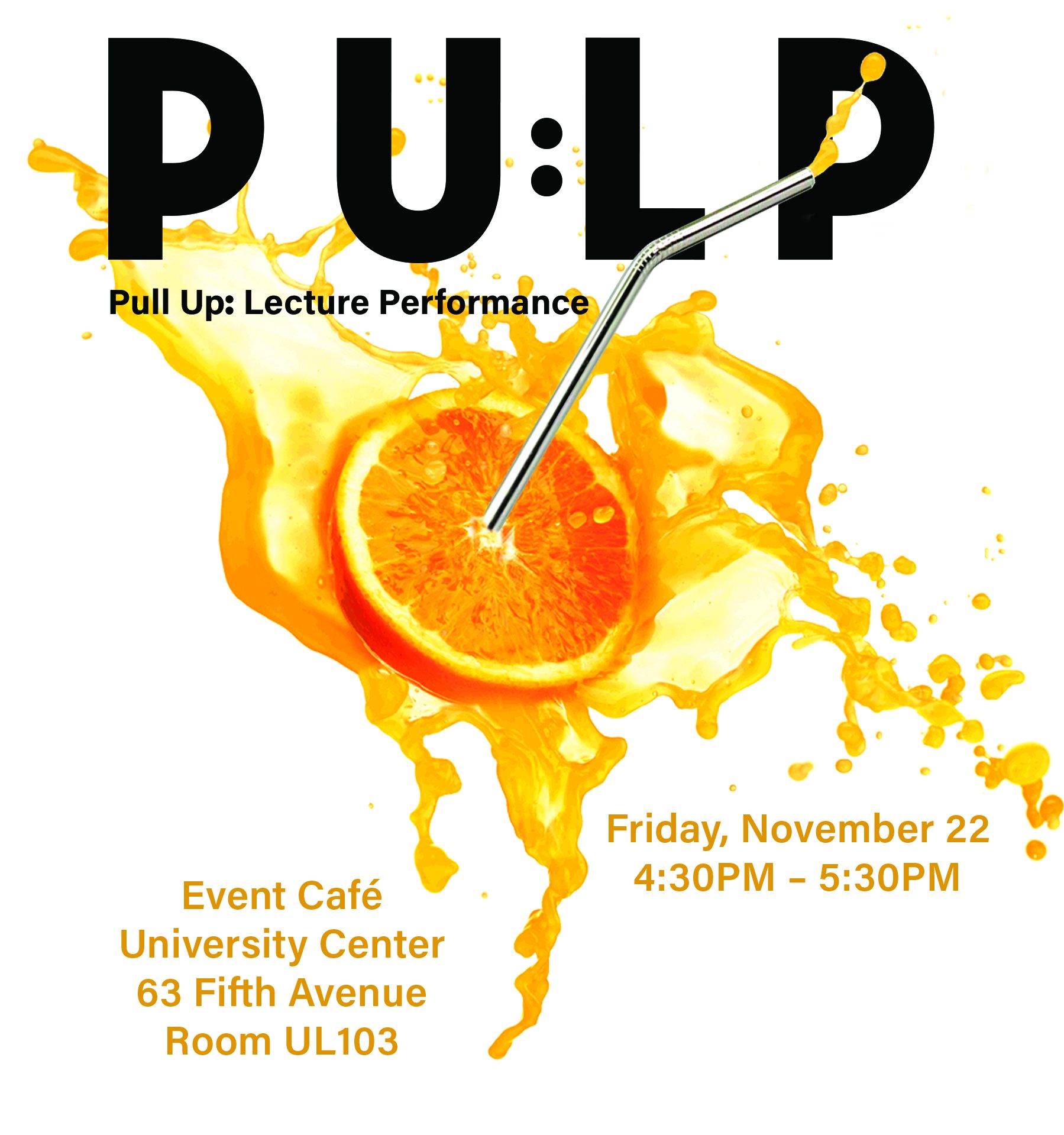 First Year students in Mev Luna’s Time class will publicly present their lecture-performance works in PULP, Pull Up: Lecture Performance, which will take place Friday November 22nd in the University Center Event Café from 4:30PM – 5:30PM.