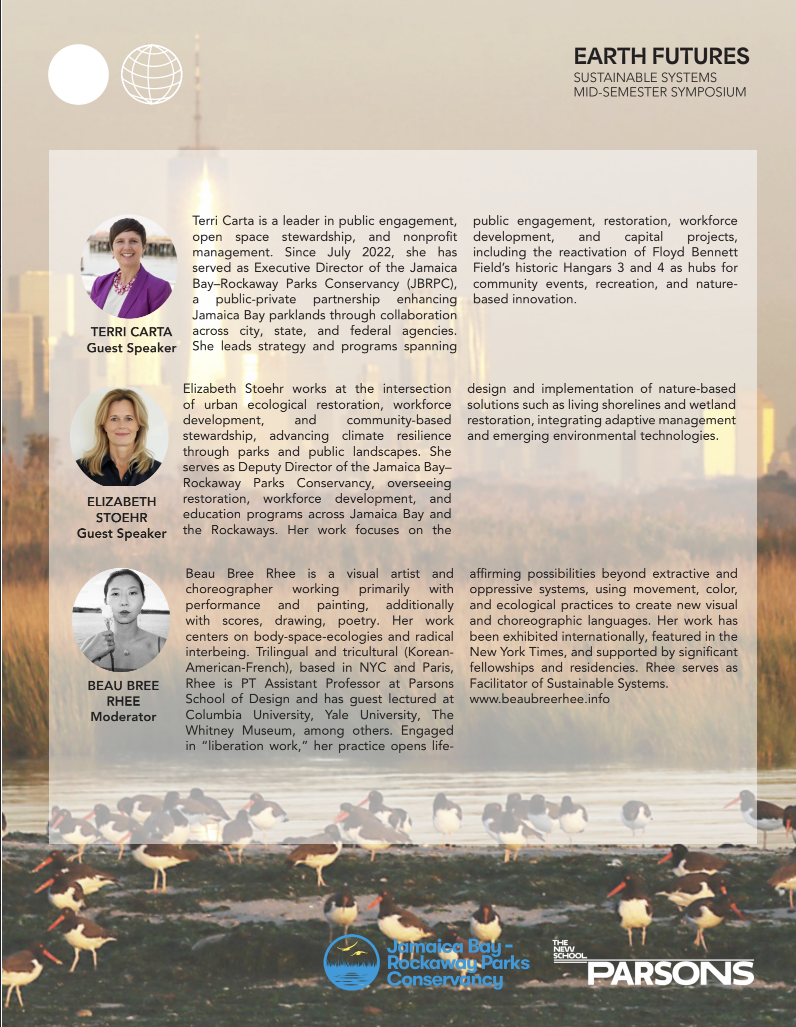 Join Parsons faculty, Carolina Obregon and Beau Bree Rhee, for an in-person presentation and conversation that focuses on the restoration and resiliency of the urban wetlands of NYC. We are delighted to welcome Terri Carta & Elizabeth Stoehr of Jamaica Bay-Rockaway Parks Conservancy to participate in this panel discussion. We encourage all Sustainable Systems First Year students and faculty to attend. There will be a Q&A session after the presentation and panel discussion.
