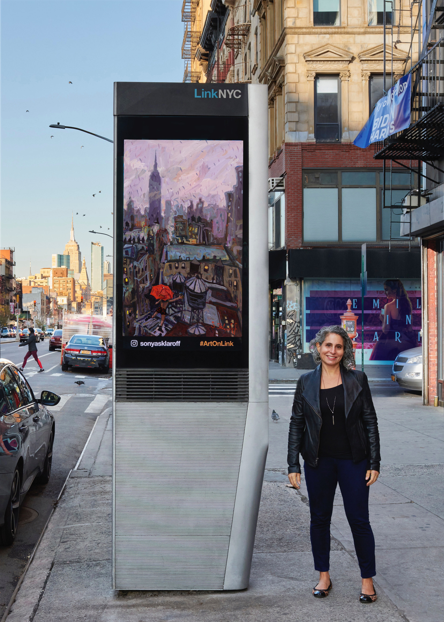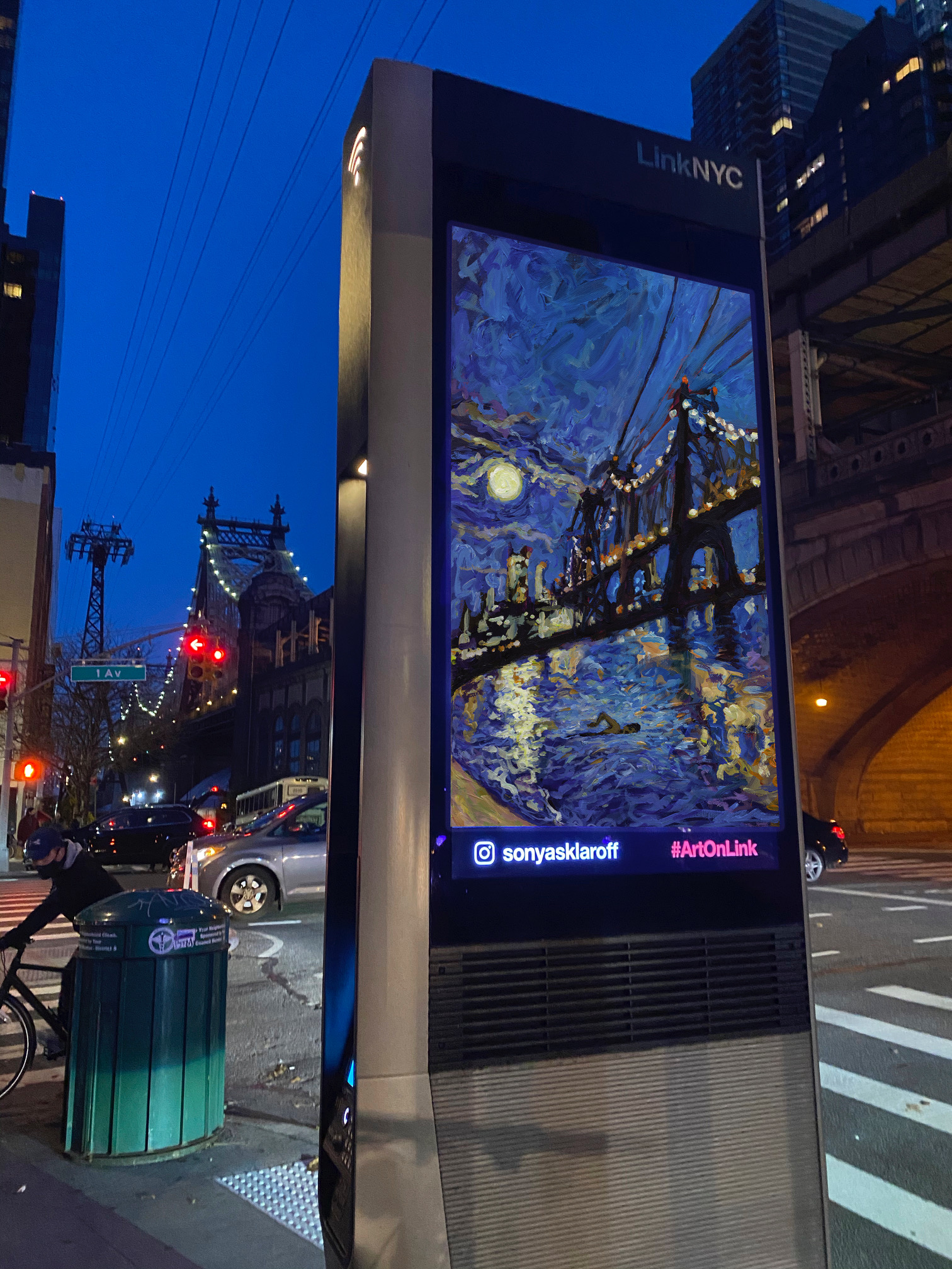 One of the most exciting experiences for me to present my work to the world was recently being featured on 3,500 LinkNYC digital kiosks around New York City. Seven of my pieces from my Pandemic Paintings Series rotated every 15 seconds flashing on these digital billboards for two weeks on street corners in all five boroughs. I gained more exposure than I ever had being shown in a gallery or a museum.