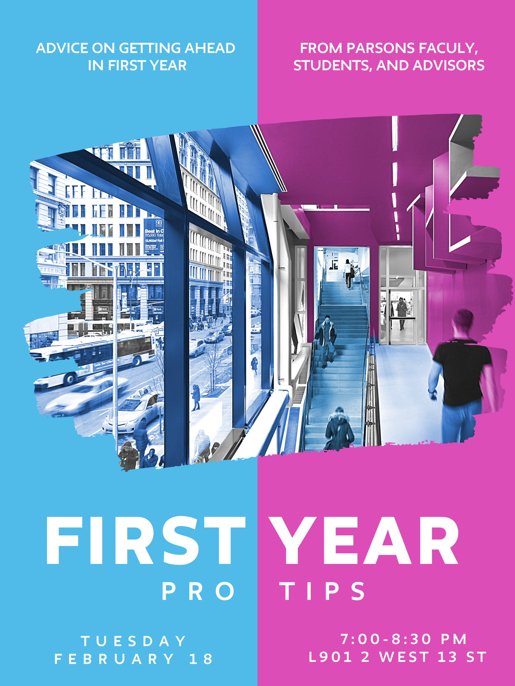 At this panel, hosted in partnership with the Parsons First Year Advising office, you’ll hear from students who have successfully moved through the first-year curriculum and Parsons First Year faculty about how to get ahead of some common challenges. They will share tips on how to approach instructors with questions or for support, how to manage your expectations when working on projects you would love to be perfect, and how to best deliver, receive, and apply feedback during “crit.”