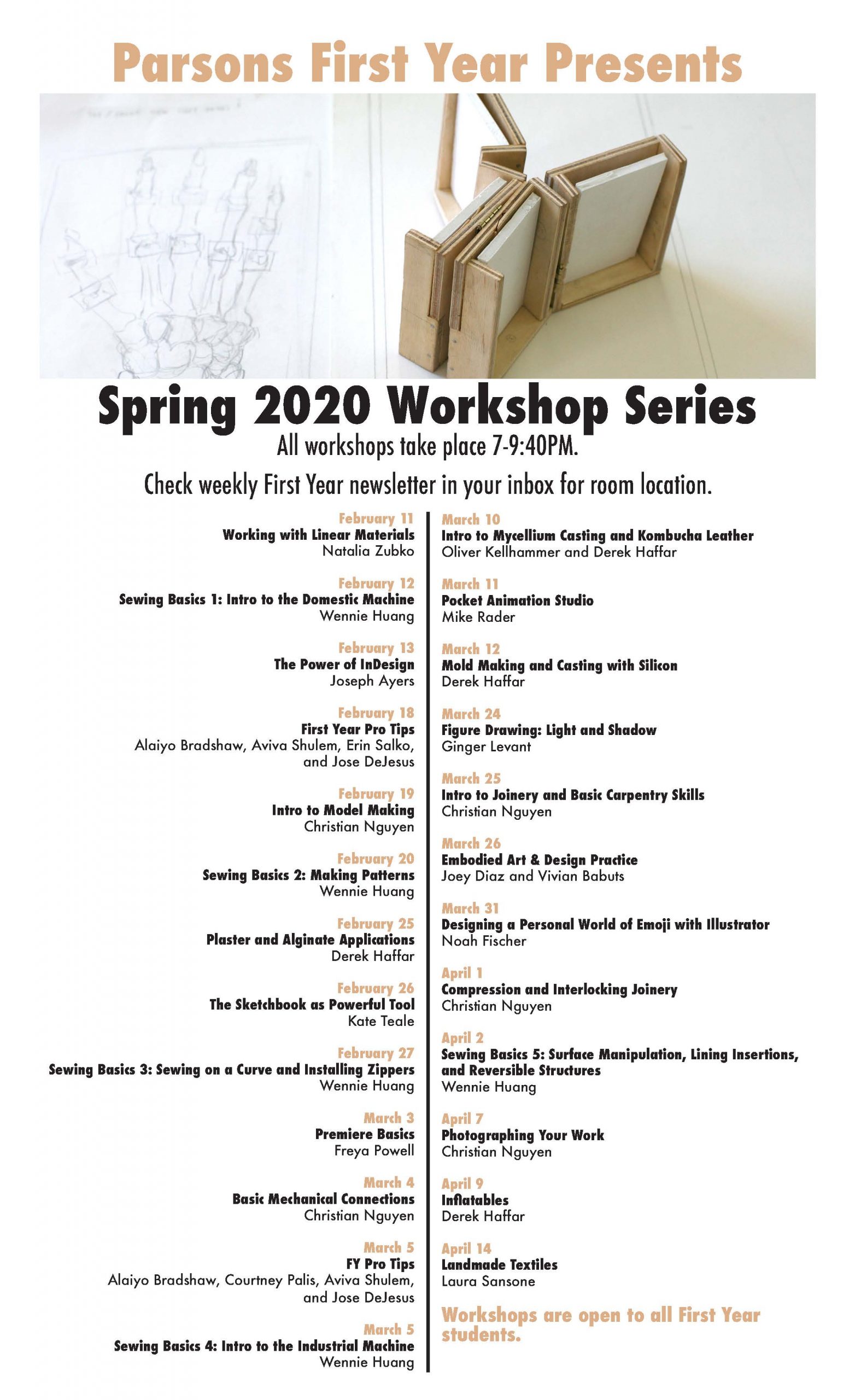 Spring 2020 workshop for First Year students are in full swing! Check out all of the exciting upcoming workshops that are available to all students in First Year: