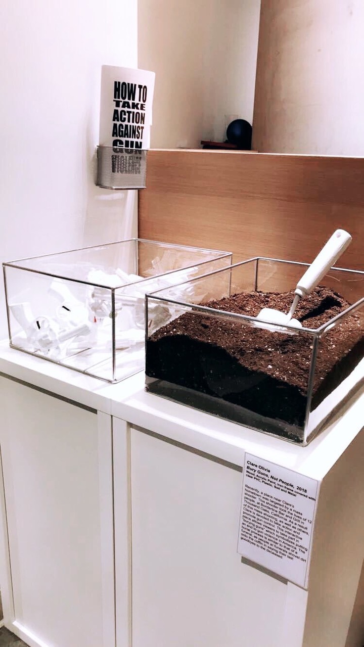 Recently, a place near Clare’s hometown was targeted by a mass shooter. This shooter took the lives of 12 people, at Borderline Bar and Grill in Thousand Oaks, California. As a result of this mass shooting, as well as others, Clare is devoted to take action and promote gun control. This interactive piece allows viewers to take part in “burying guns” which symbolizes putting an end to gun violence in America. The burial process is similar to that of a funeral, as people at funerals shovel dirt onto the coffin in saying their last goodbyes to the deceased.
