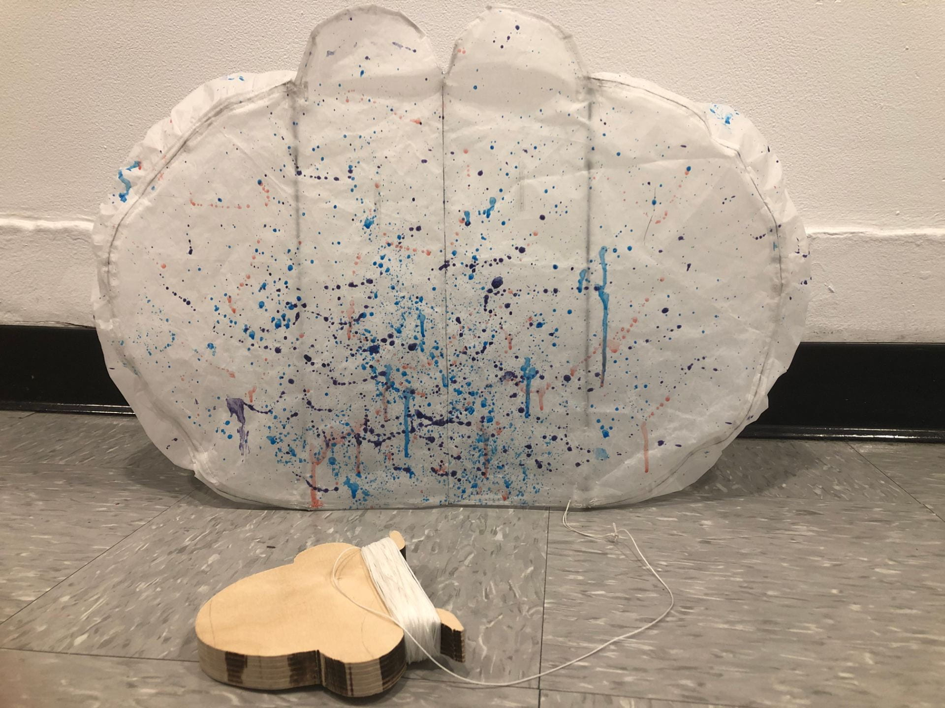For my Integrative Studio Class, I had constructed a cardboard gun that incorporated a can of La Croix as a prop for a narrative. With that in mind, I wanted to create a connection to my Kite Project in Space&Materiality. Using Amsterdam Acrylics fluids and acrylic paint, I created a splatter pattern with a color scheme similar to the ones one might find on La Croix.