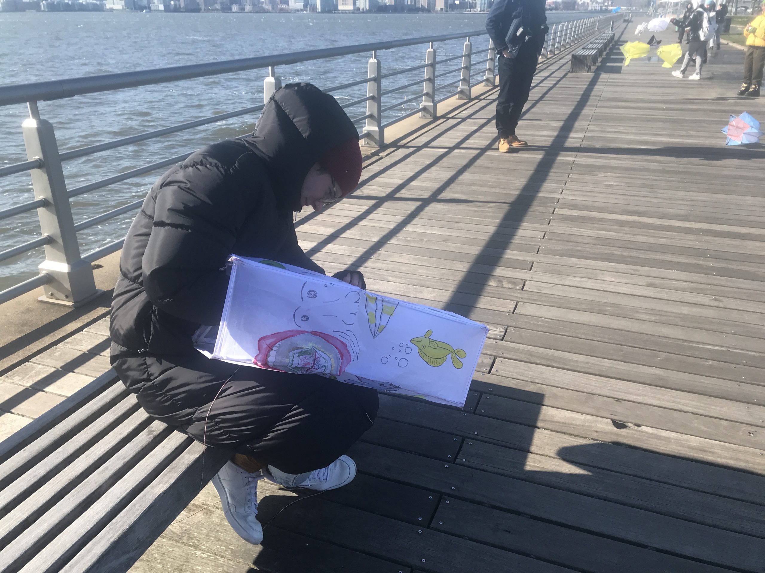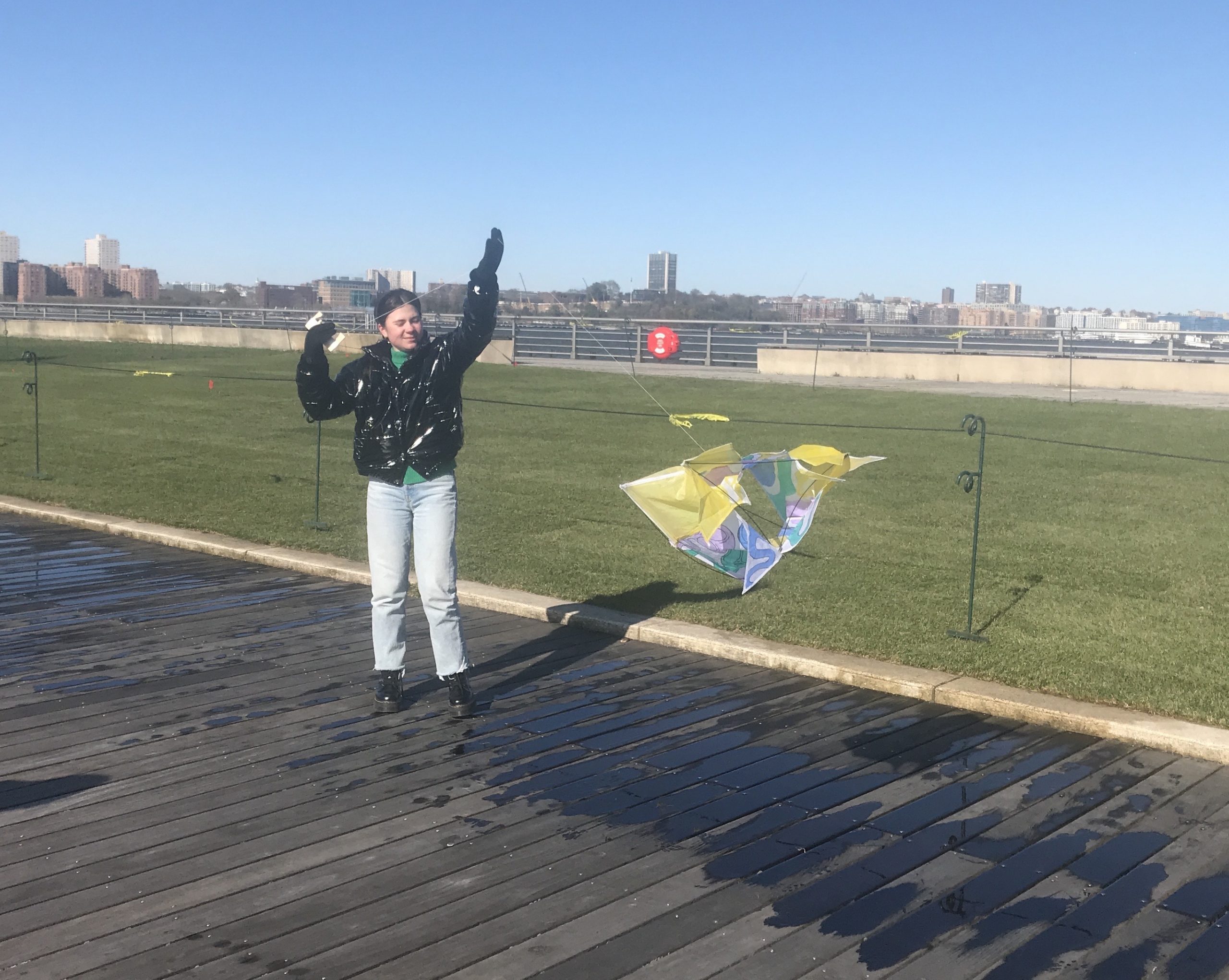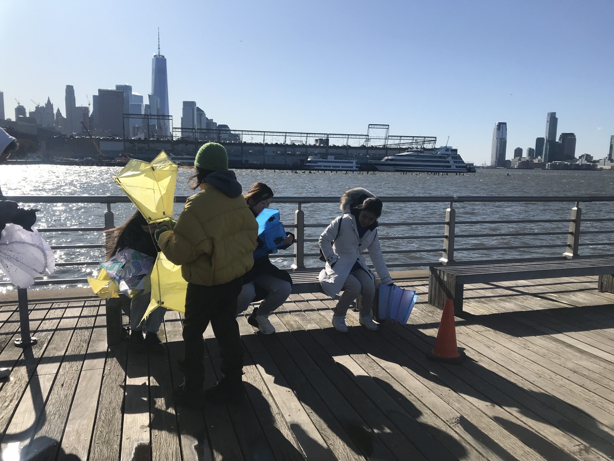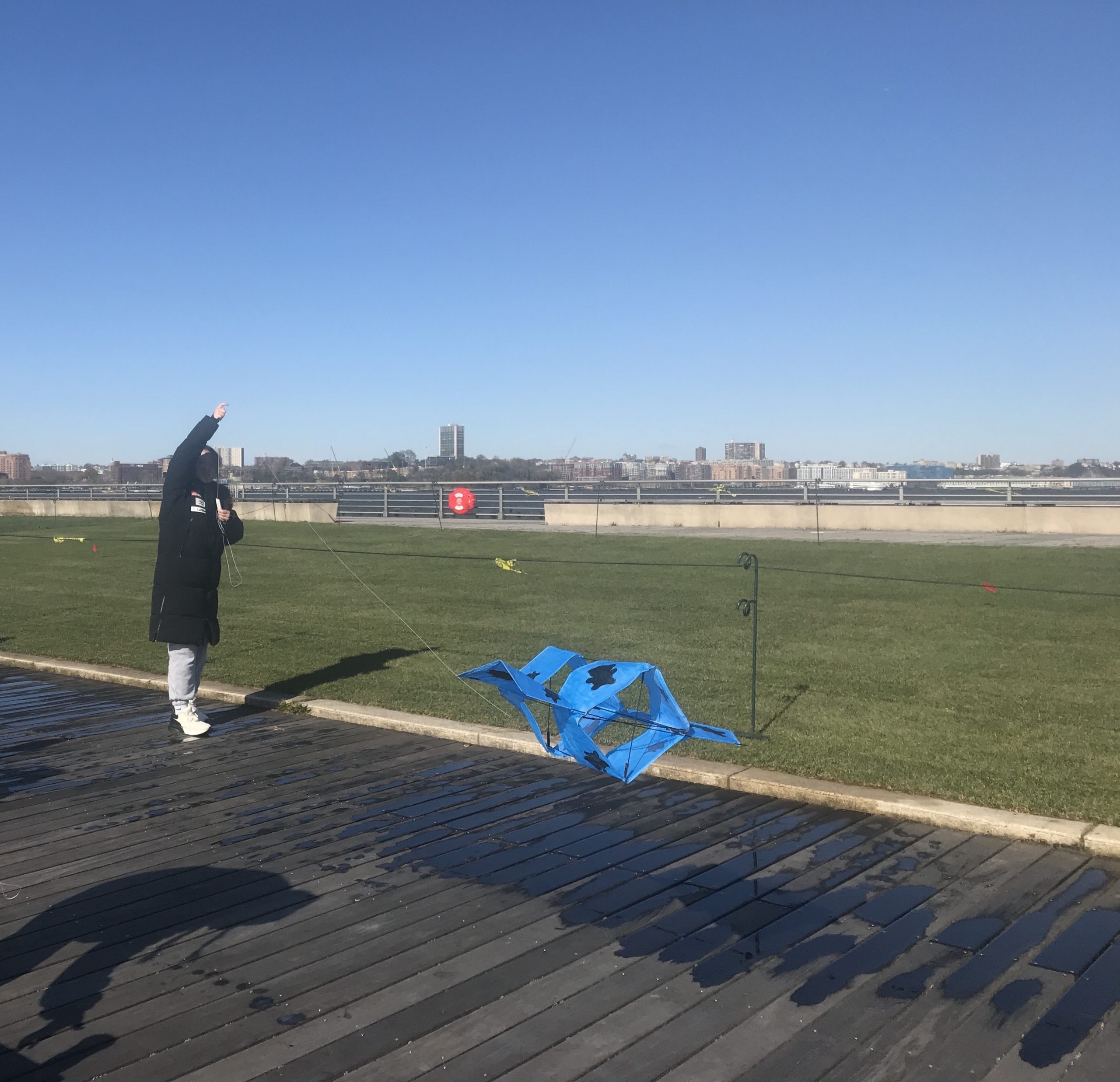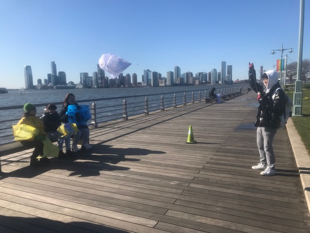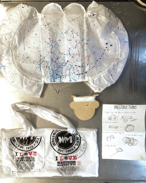 Some students experimented with staining the ripstop nylon prior to cutting out patterns and sewing. Some students waited to add the fluid acrylic designs post-construction. Projects were completed by drawing up assembly instructions, designing and shaping their own kite-winder mostly from cut and sanded wood planks, plywood, and blocks, creating a bag to carry all kite parts and making two test flights, one in Washington Square Park, followed by the final test flight at Hudson River Park on November 13.