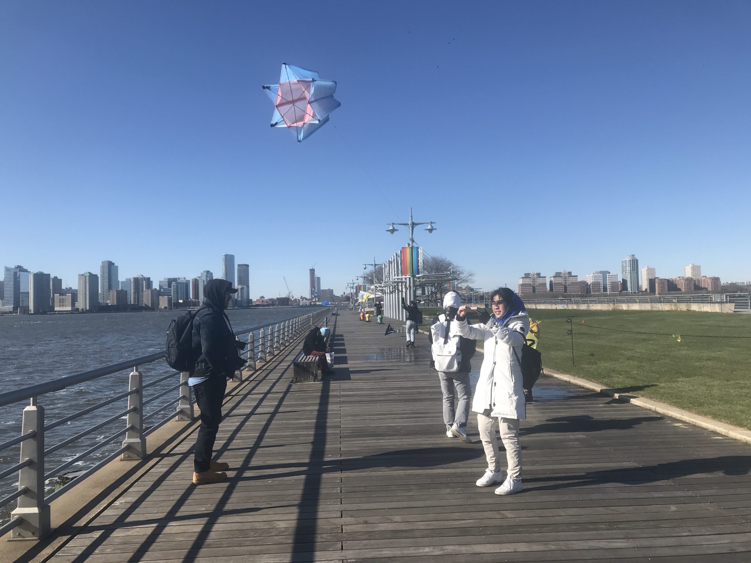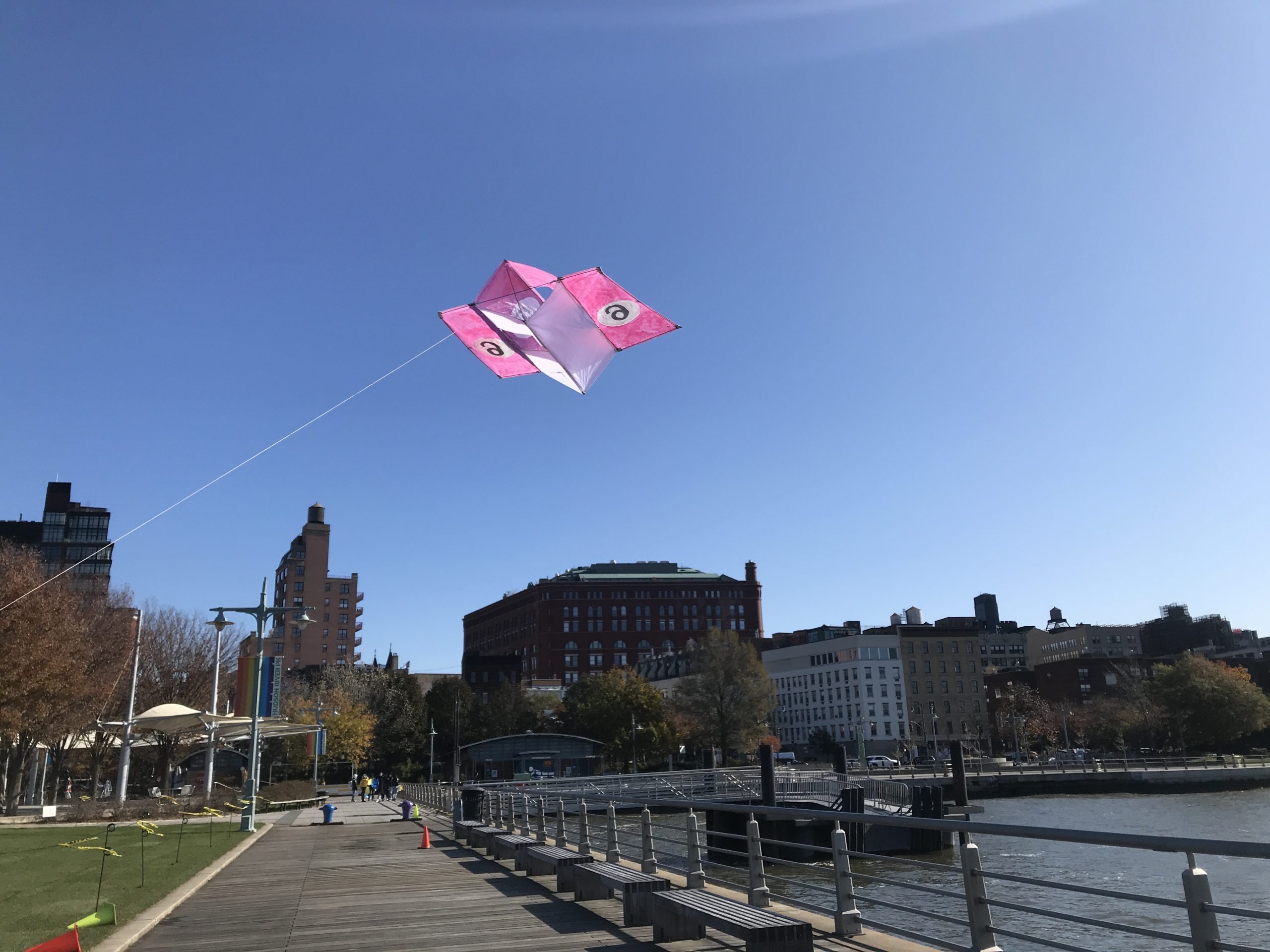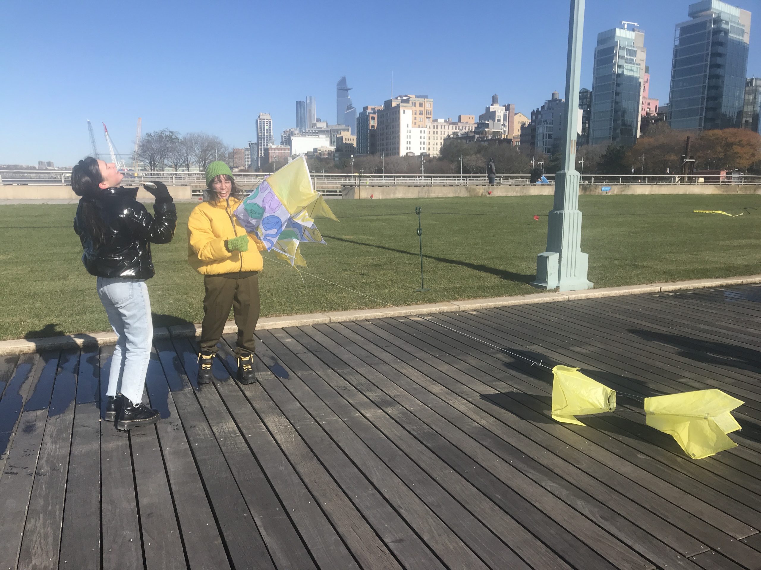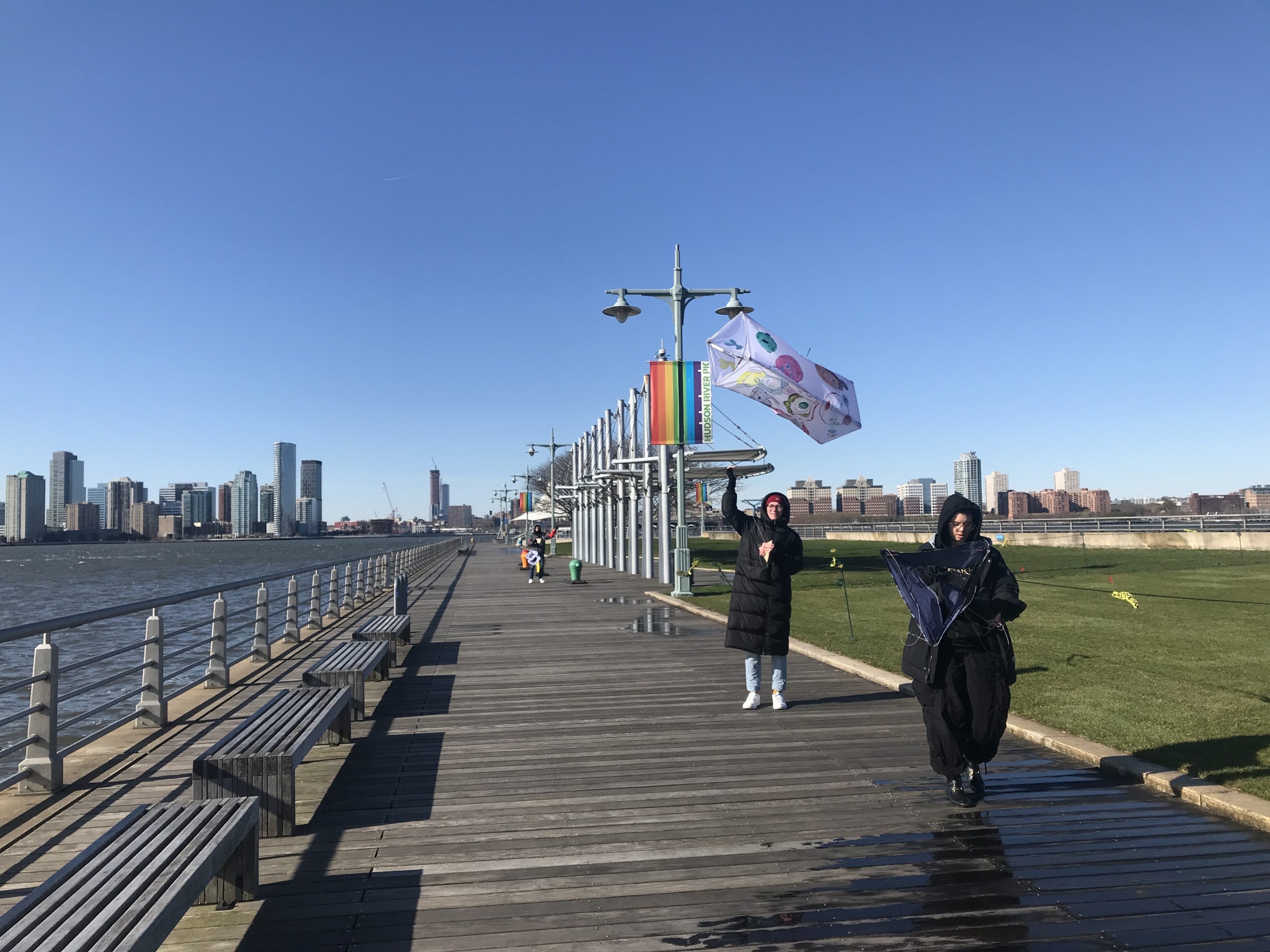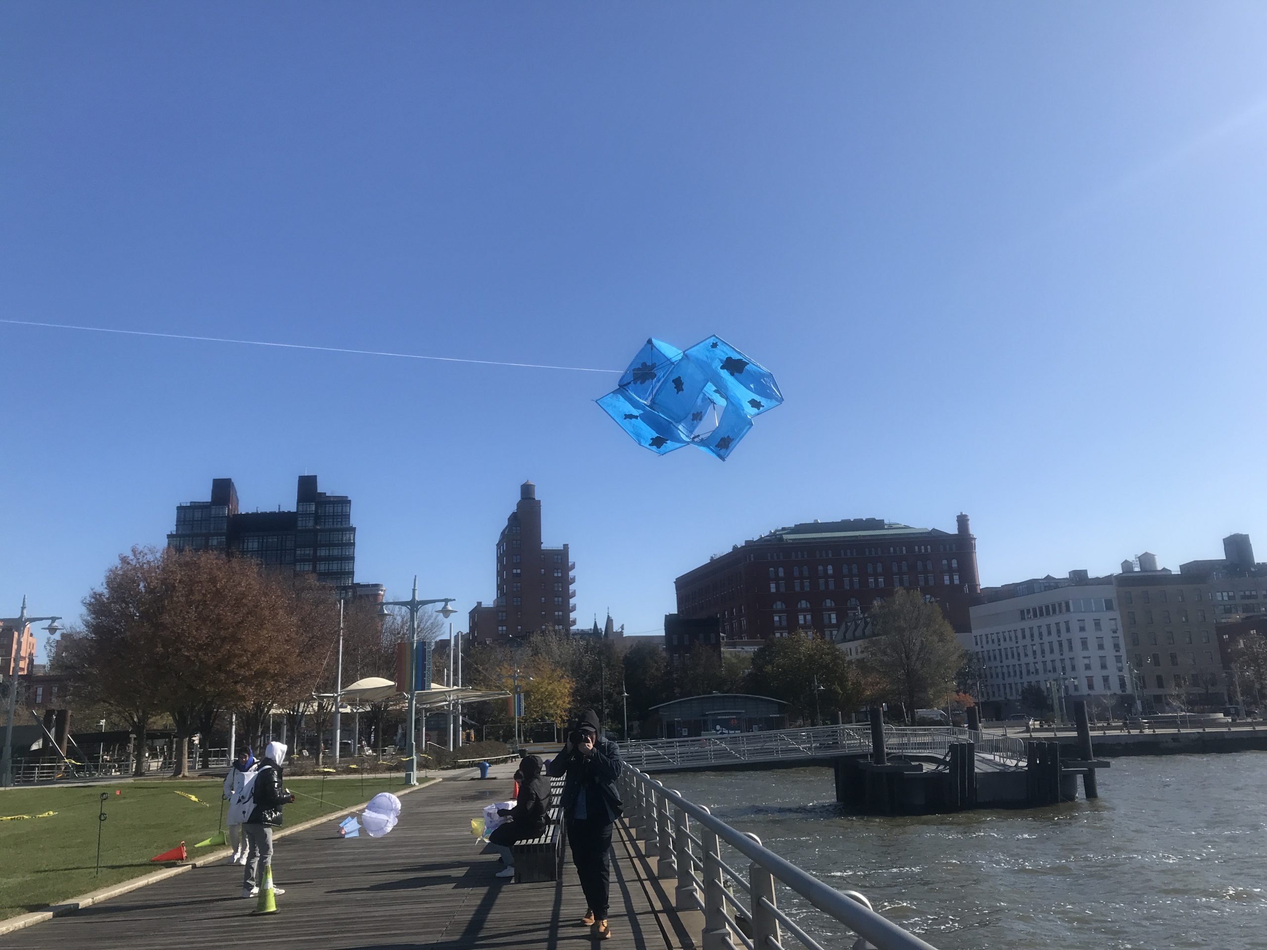 Some students experimented with staining the ripstop nylon prior to cutting out patterns and sewing. Some students waited to add the fluid acrylic designs post-construction. Projects were completed by drawing up assembly instructions, designing and shaping their own kite-winder mostly from cut and sanded wood planks, plywood, and blocks, creating a bag to carry all kite parts and making two test flights, one in Washington Square Park, followed by the final test flight at Hudson River Park on November 13.