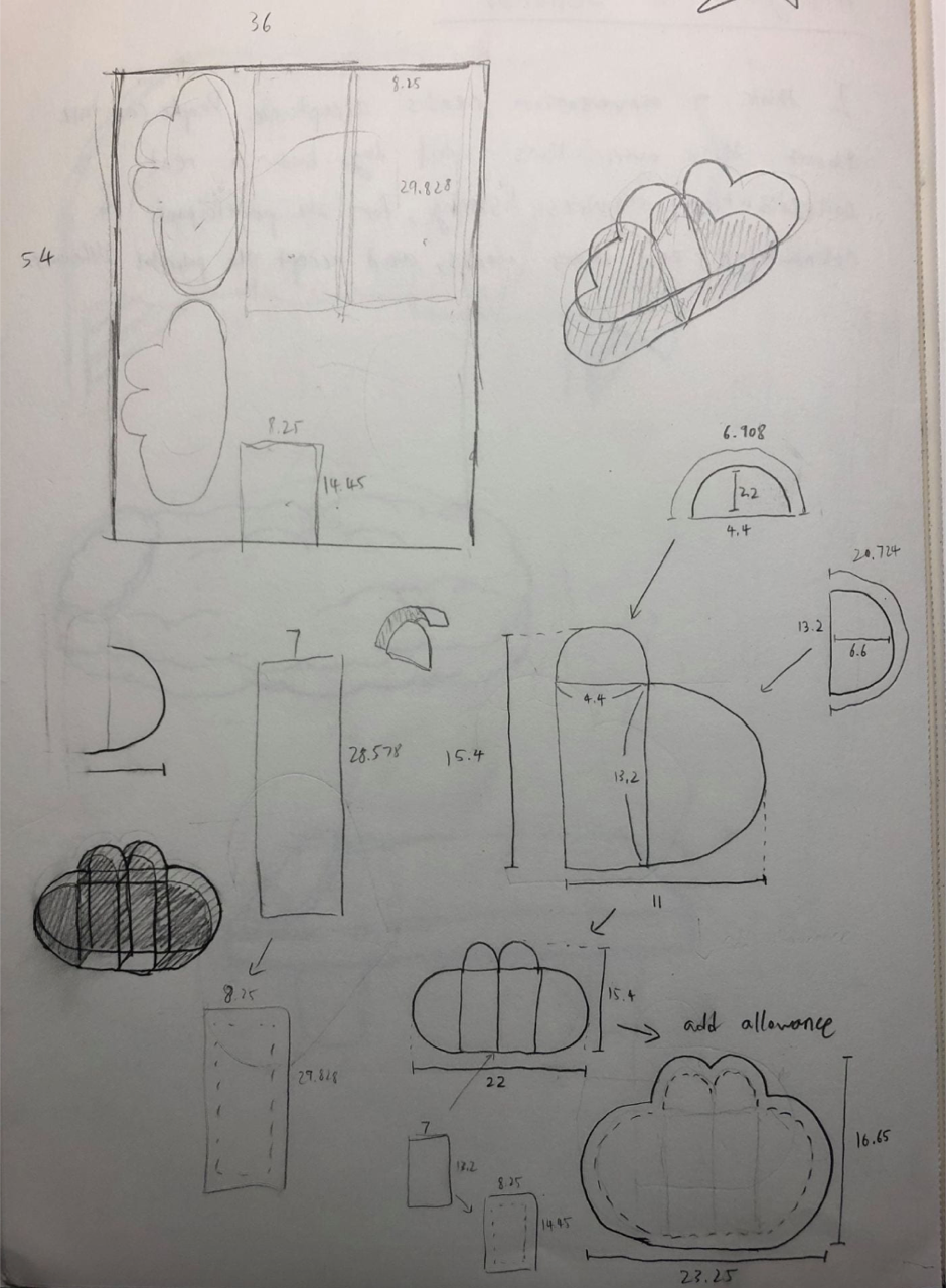 Through this project, I learned much more about different materials and how they work together. For example, I’ve never worked with a nylon sheet before, so it was a nice challenge to cut patterns and sew them together. It was honestly pretty surprising when I sewed the ribbon pockets to the cloud because I didn’t know such materials could be sewn.
