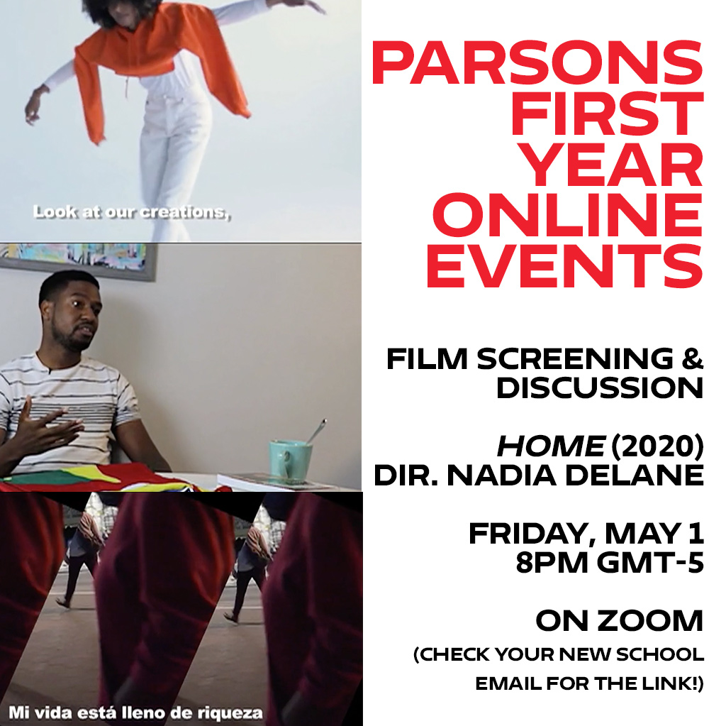 Join us on Zoom this Friday, May 1st at 8pm (US Eastern time) as we proudly screen HOME by ADHT’s very own Nadia DeLane! Check your New School email for the link, or email whitmanm@newschool.edu