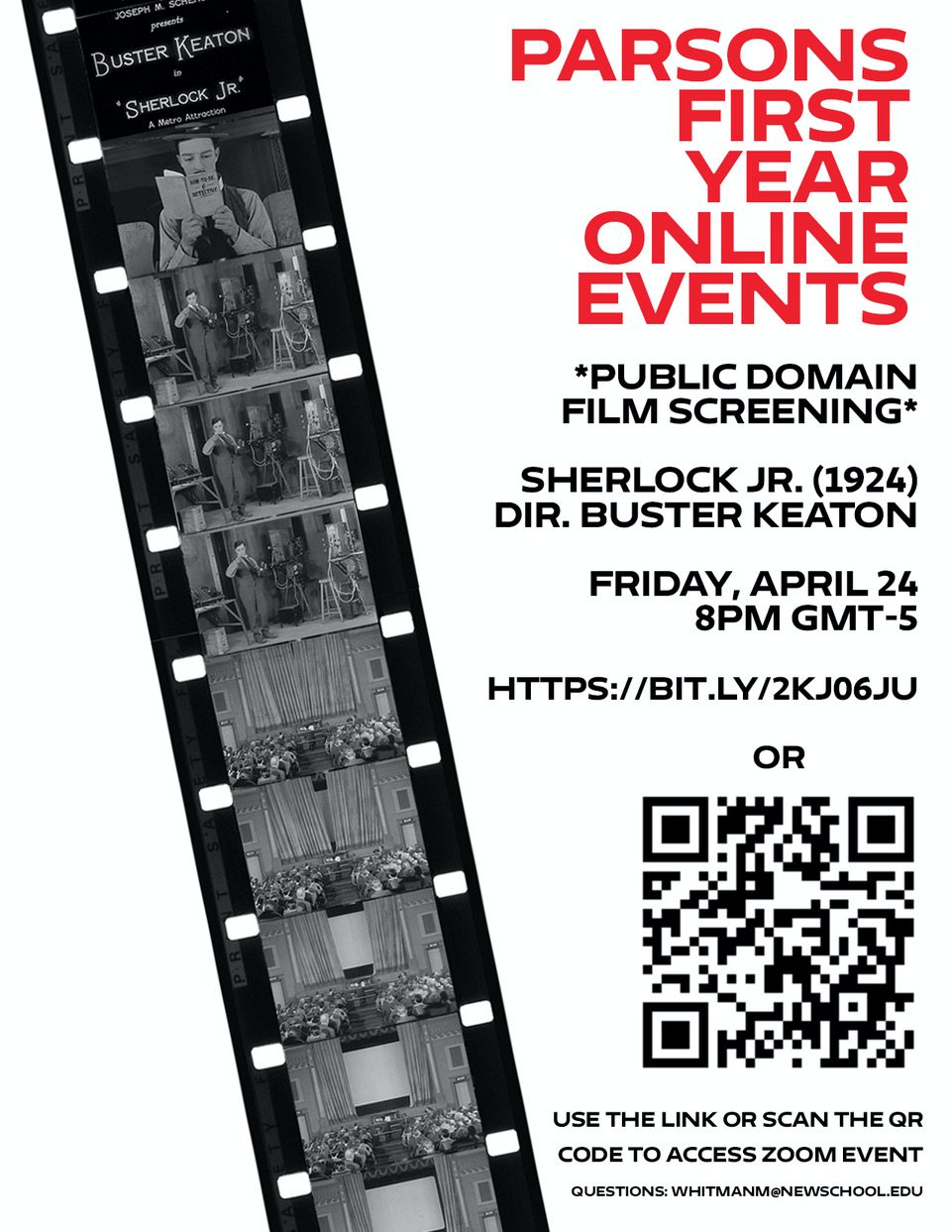 Parsons First Year presents an online, community screening of Buster Keaton’s Sherlock Jr. (1924) via Zoom (New School login required) on Friday April 24, 8pm GMT-5 (New York time).