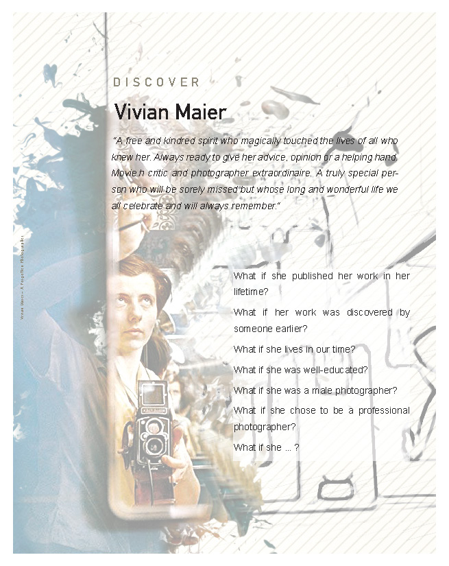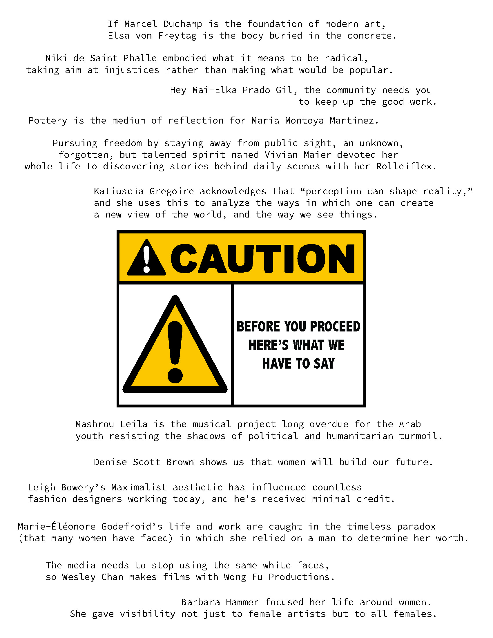 Seeing The Unseen, the course project which initiated the zine’s creation, involved a variety of research methodologies to uncover, comprehend and visualize those outside of the canon. Students researched a wide range of artists and/or designers who, for one reason or another, have been left out of history (at one time or another). Selecting one person to focus on, each student researched the individual in depth to understand the context, relevance and implications of being erased or forgotten.