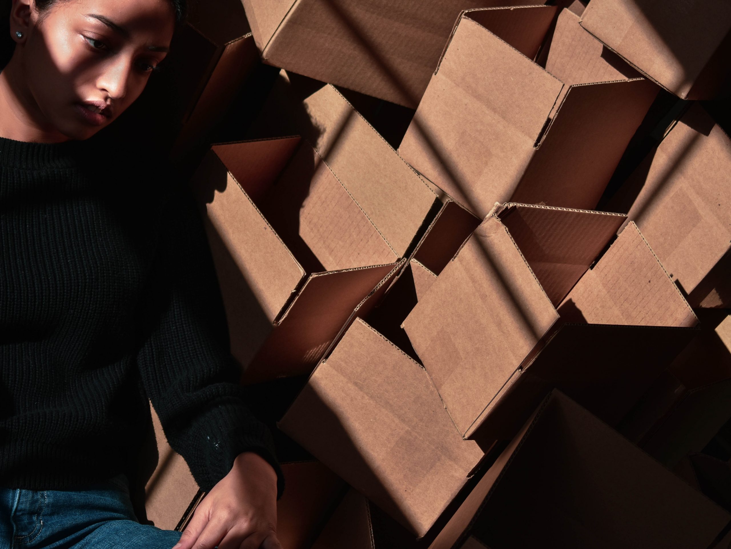 Due to COVID-19, the unemployment rates in the United States are higher than ever before. Many families have no jobs because either their entire state has shut down everything or because certain businesses include too much human interaction and therefore cannot continue to run. My mother worked at a salon, which specialized in eyebrow threading. She has been out of work for almost a month now. The company my father works with is based in India and New York, both places that have shut down completely. Now my parents, like many others, have to pay for a mortgage, my school’s tuition, food, and daily necessities. The only source of income they have right now is a large online company called Artful Home and we help them ship their products. Since this is a large corporation and based online, it is still able to run. We have made hundreds of cardboard boxes which represent our only way of surviving right now. I decided to pose myself with these boxes in the best light source my house has, which are two windows that get beautiful sunlight around 5 pm. I thought this lighting that would create a dramatic setting against the boxes and my skin to illuminate them in way that made them more important than usually seemed. They are more significant and meaningful to us than they ever were during normal times. Understanding the value of things that did not matter to us before is a great lesson that has come out of the COVID situation, and is the reason I chose to use those simple cardboard boxes as the main subject of the shoot.