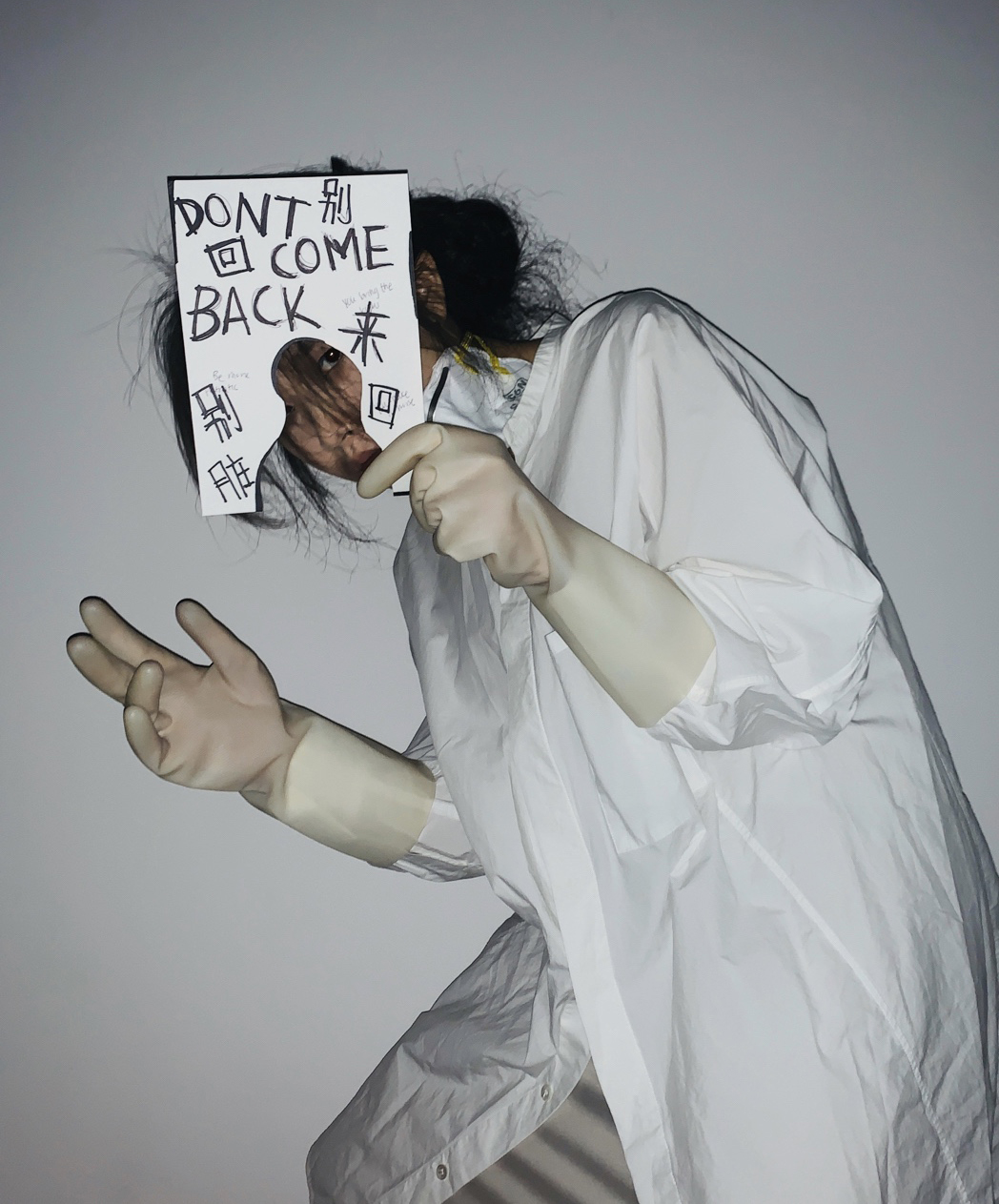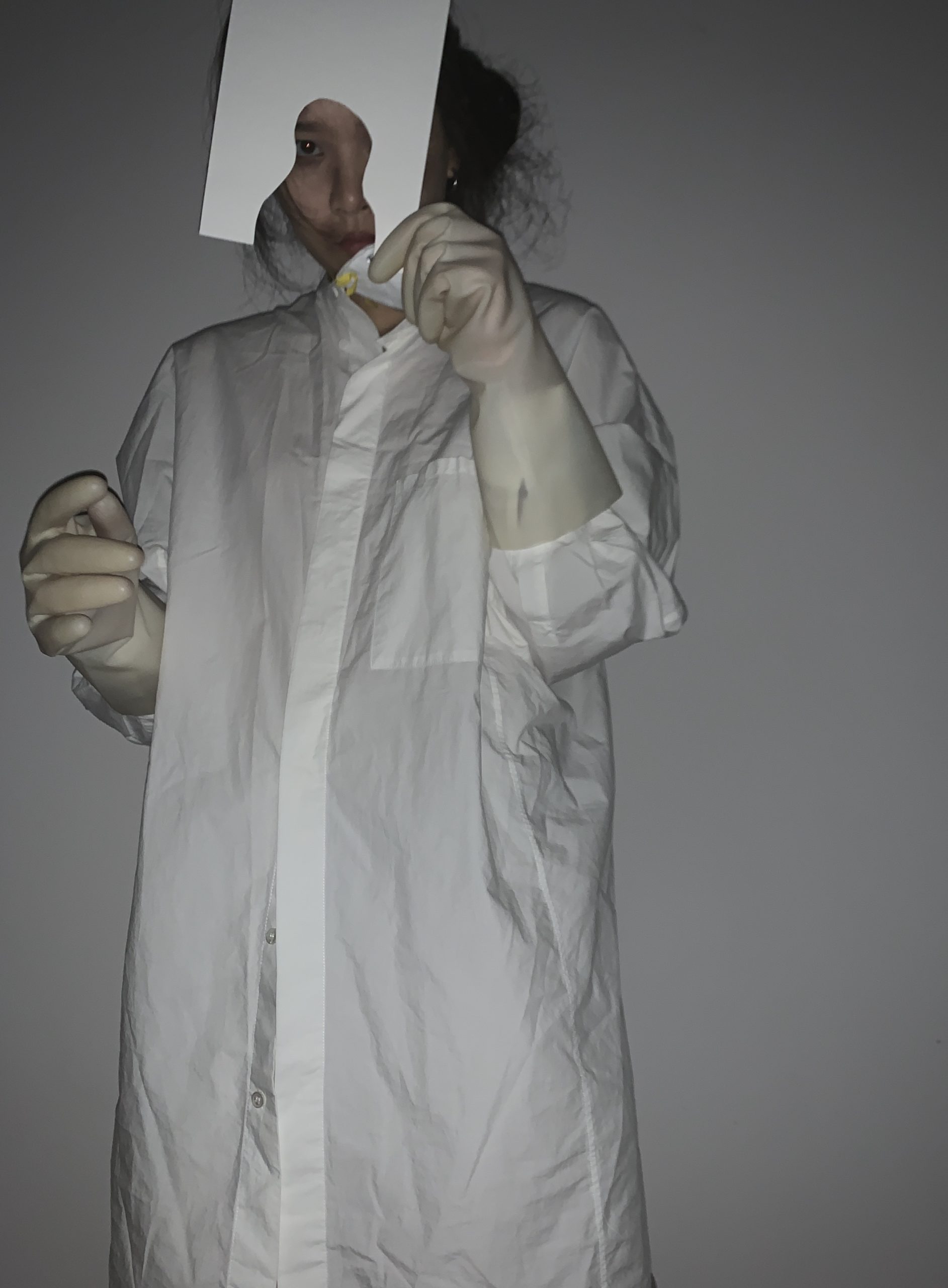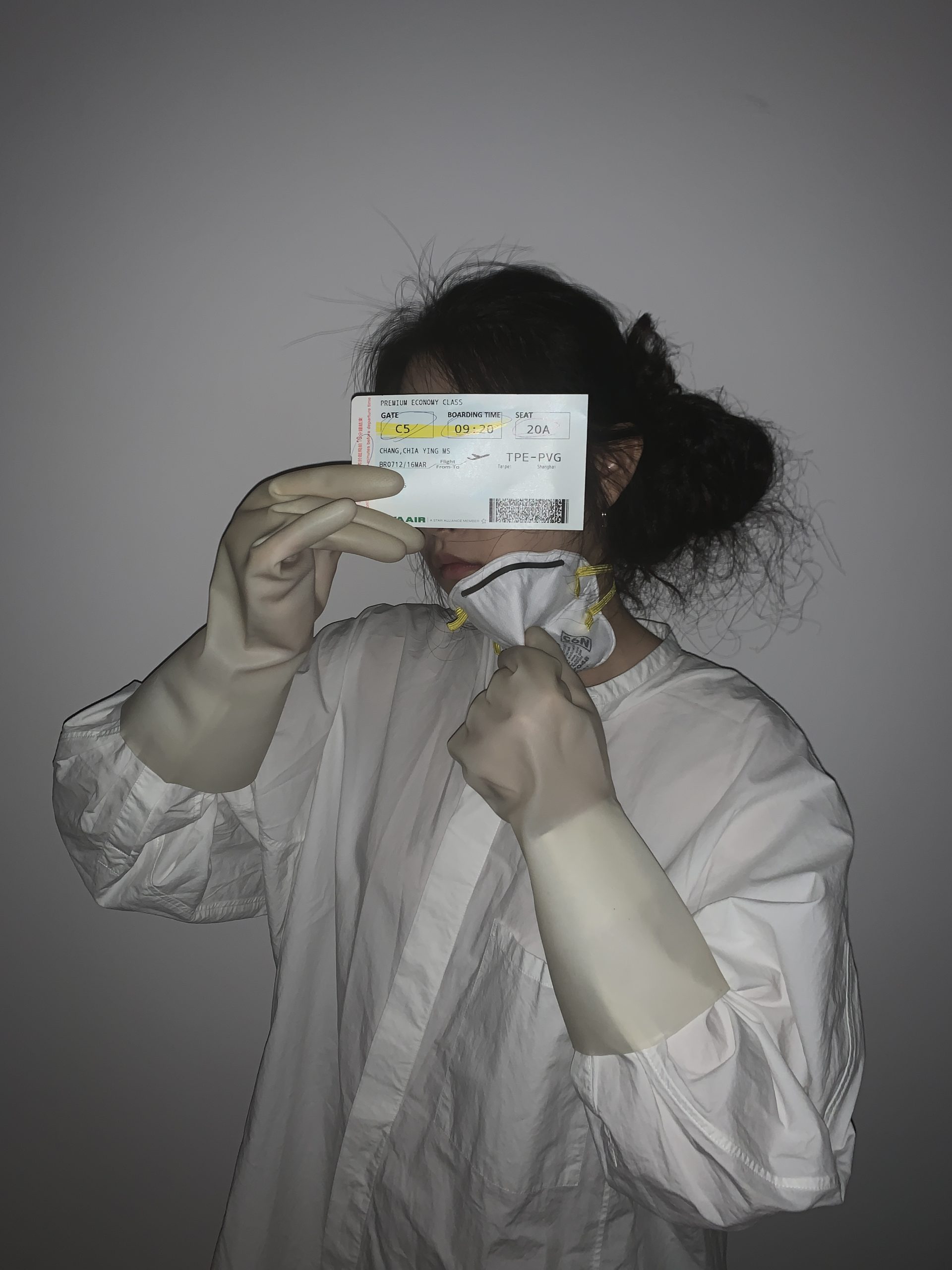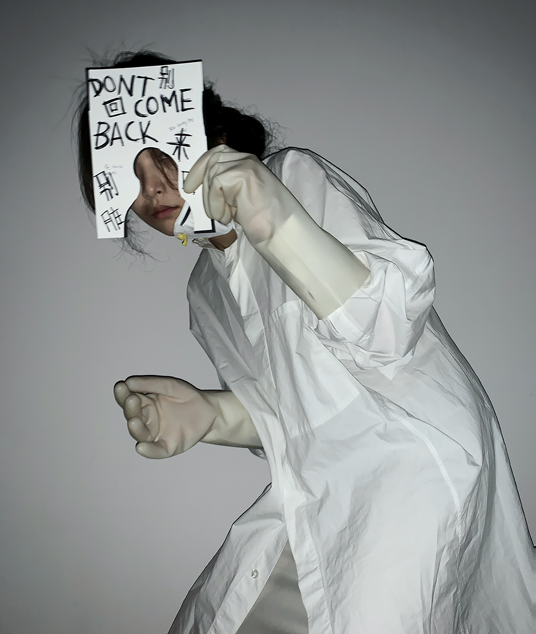 Due to the coronavirus getting more and more serious in foreign countries like Australia, England, Italy, Japan, America, etc., many of the students that are studying abroad (including me) are trying to get home safe to our parents due to their concerns and our own. However, due to the constant travel from foreign countries back to China, it has caused more cases in different cities in China which created controversies. On a social media called Weibo (Chinese Instagram), there was a student who recorded her process of how hard it was for her to arrive back in China but instead of being welcomed, her comments were filled with negative responses like “Don’t come back to China, you will bring more virus in” or “It would be more patriotic of you not coming back”. It may sound reasonable to think about the health concern in China, but for students like me, it is the only way for us to be back with our family and get the most support even if we do get sick. Thus, trying to portray the helpless situation of being scold by the internet, I wore a long white blouse with gloves and an N95 mask that portray the COVID-19 protection gears. This has become a general style of how many students wear to travel on a plane so I wanted to show this side of the fashion styling part. As for the white card, there is a man-shaped hole in the middle that shows this event in how it has suppressed the right of students and their helplessness to talk against this event. The whole lighting is focused on the subject taken through flash to show the obvious positive and negative space to create an atmosphere of being oppressed.