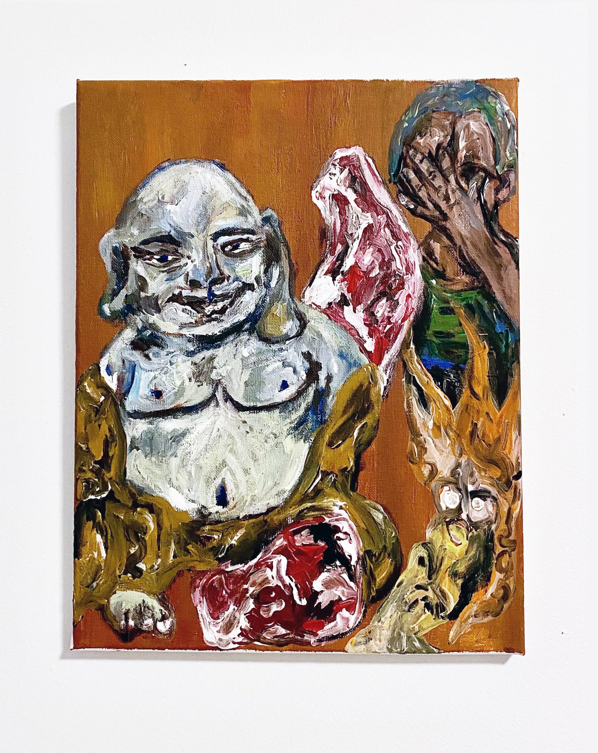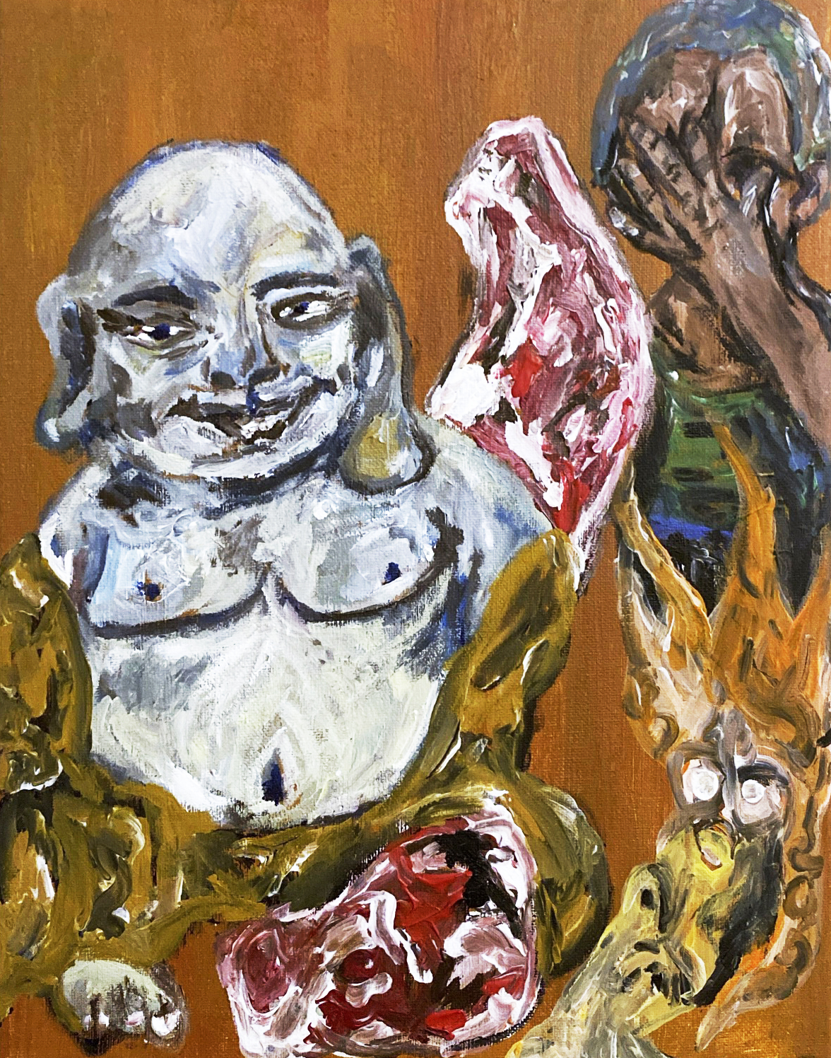 This is an acrylic painting I created that discusses the connection of Buddhist values to a darker counterpart of hedonism. I think there is a very unique aspect of finding pleasure in exploring the darker aspects of one’s self-consciousness just as Buddhism allows one to reflect through meditation. I chose more unnerving colors and imagery such as the raw meat to play on this vulgar outlook of hedonism but then created my own content depiction of Buddha at the forefront.