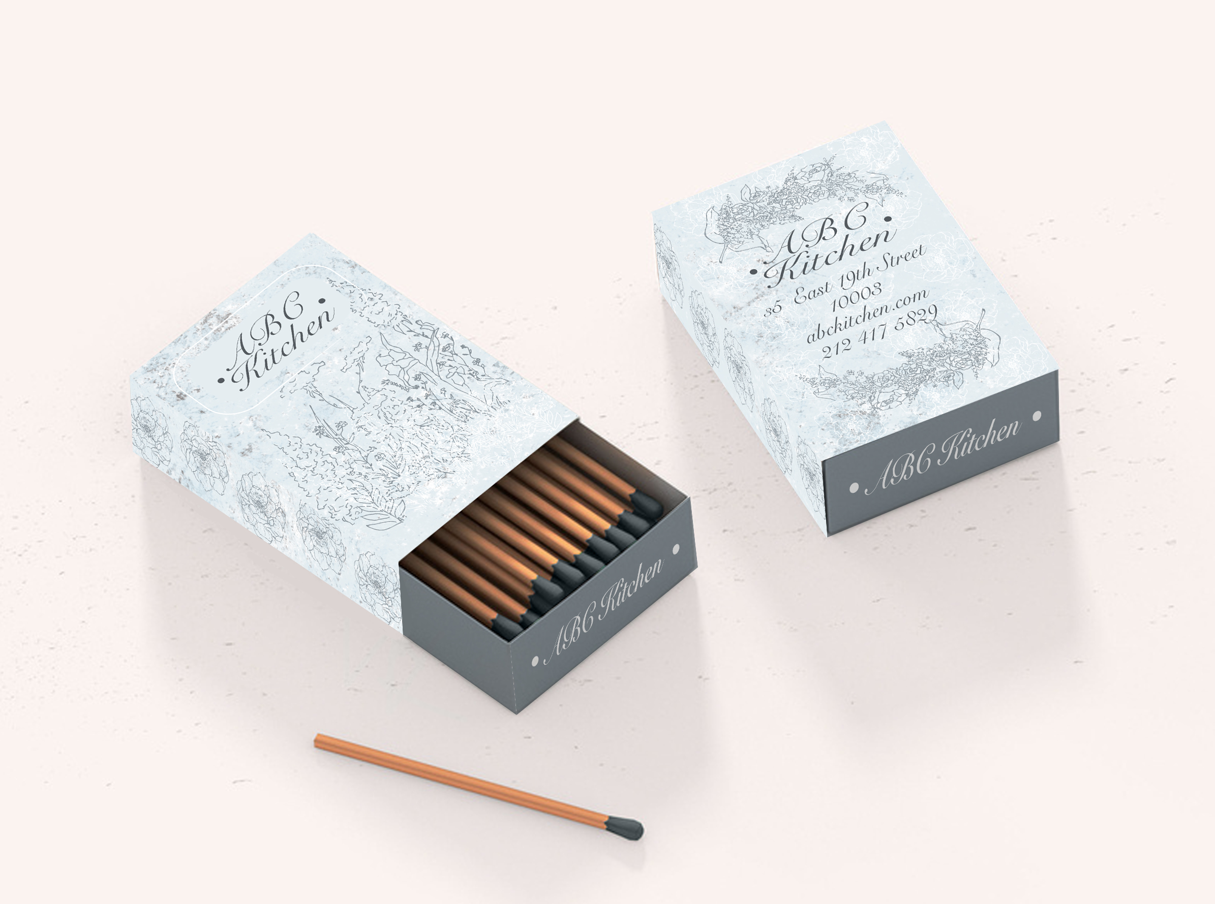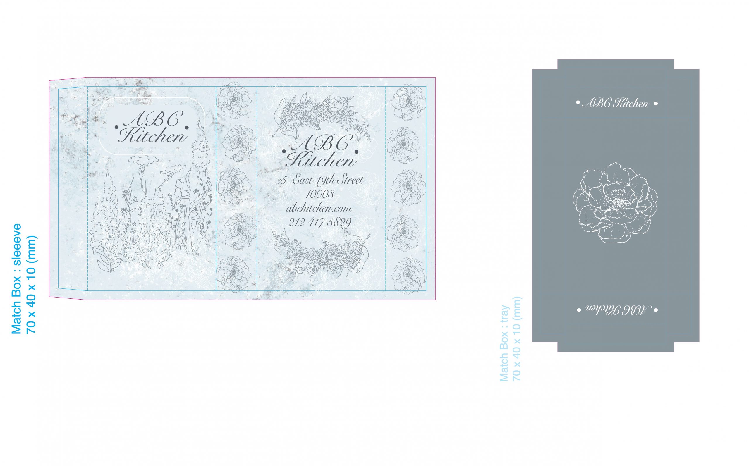 I created a matchbox design for the “ABC Kitchen” restaurant. For the design, I decided to use light baby-blue monochromatic color scheme for to emphasize the softness, gentleness of it. The texture used for the cover is meant to reflect the feeling of antique-ness of the restaurant. Repeated use of flowers reflects the interior of the restaurant which is filled with plants. The fancy aristocratic typeface is meant to reflect the “class” of the place and its feeling of luxury and elegance .