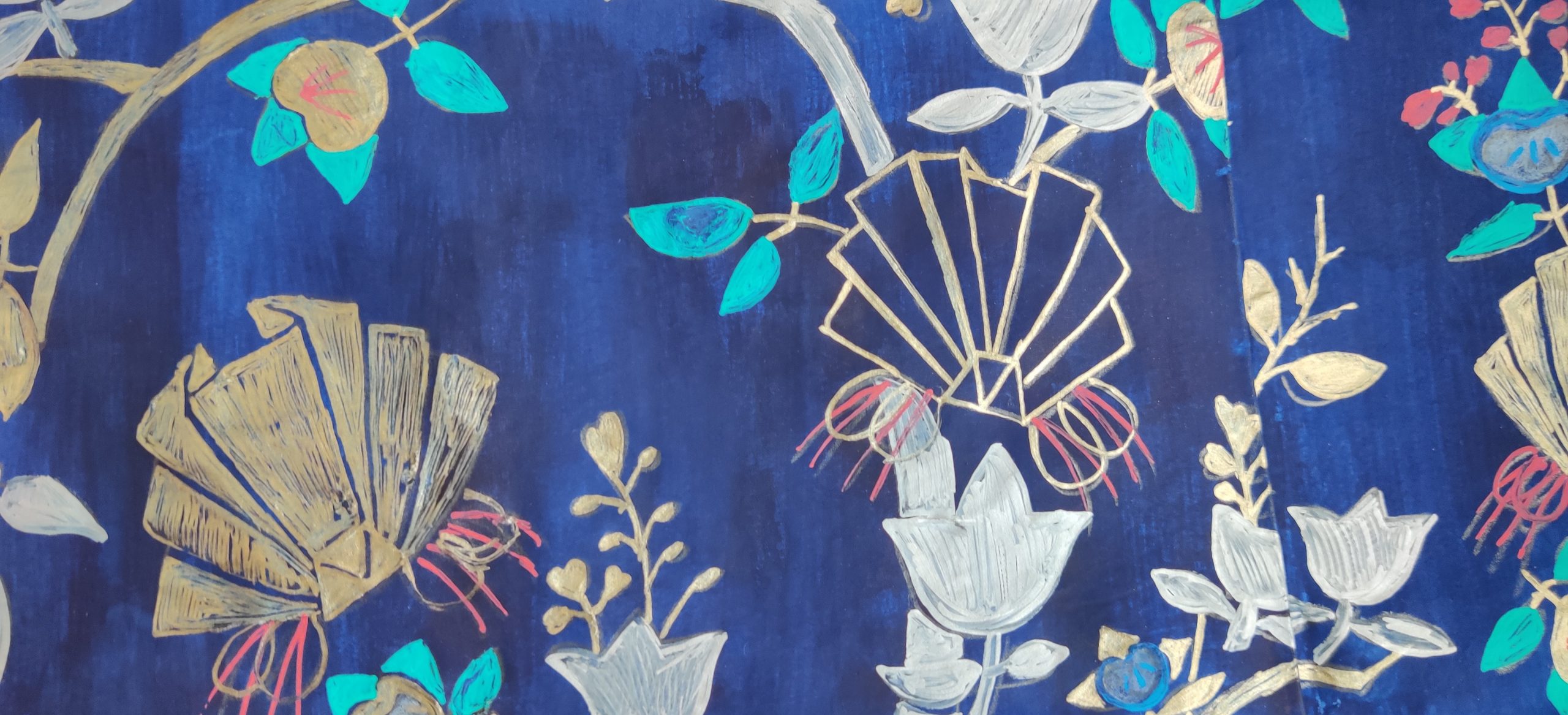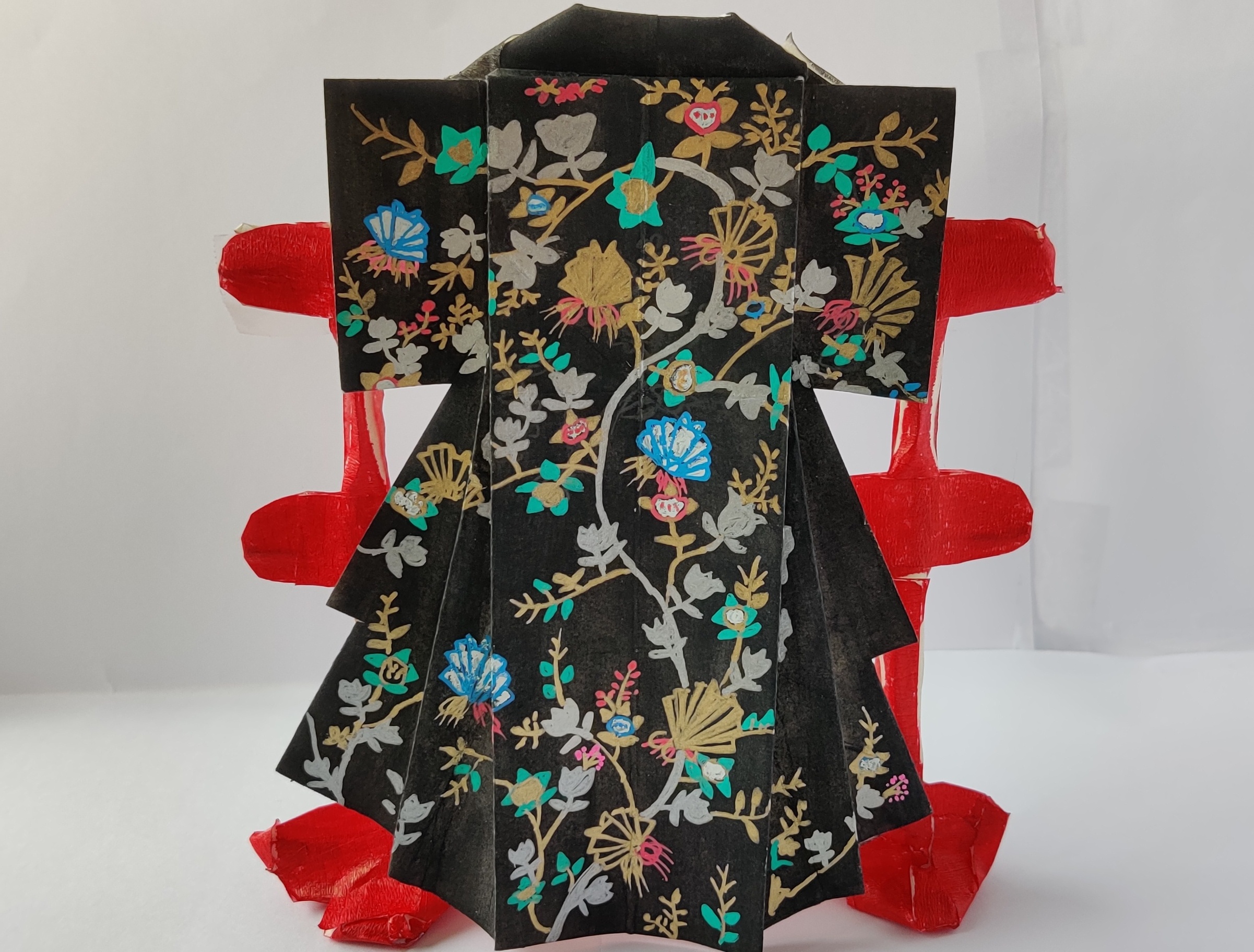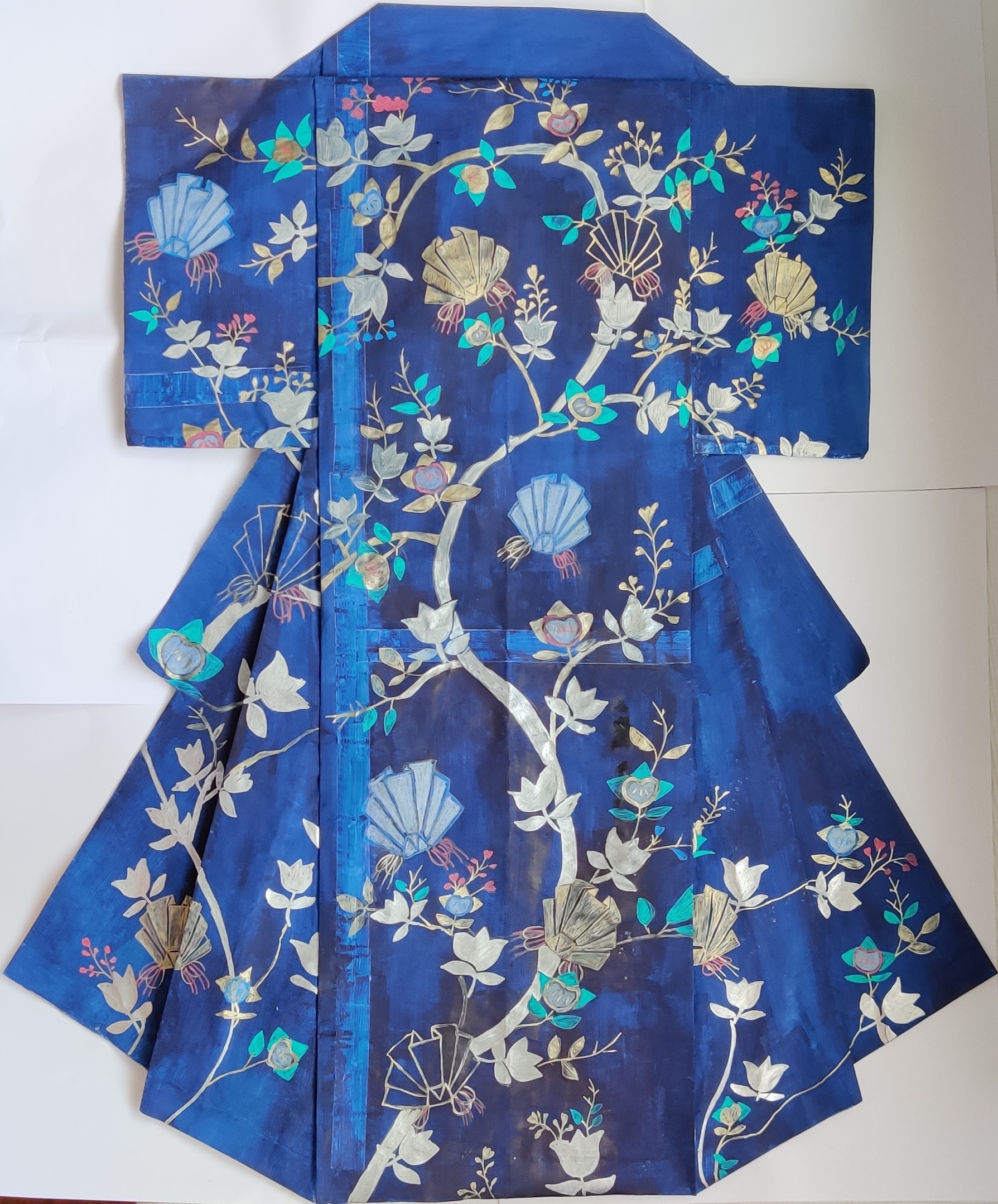 After researching 3 pieces from the MET, I chose to emulate an Uchikake from the Edo Period I found in the MET collection as I was interested in understanding the form and design of the garment. I collaged newspaper together to create and fold a lifesized origami Uchikake, and using gel pens, coloring pencils, and gold and silver markers, I drew the design by focusing on small sections of the original piece. My previous iterations helped me to understand more about the design itself, as I felt that this was the star of the original piece. It helped me to pay more attention to drawing the designs during my third iteration as it had so many intricate details like the “folded paper butterflies” and the strings attached to it.