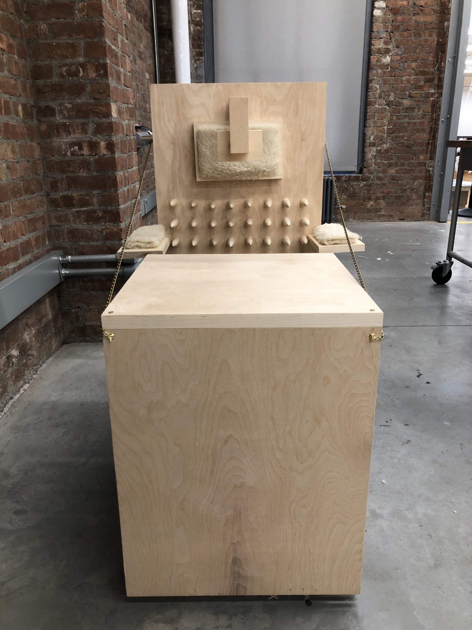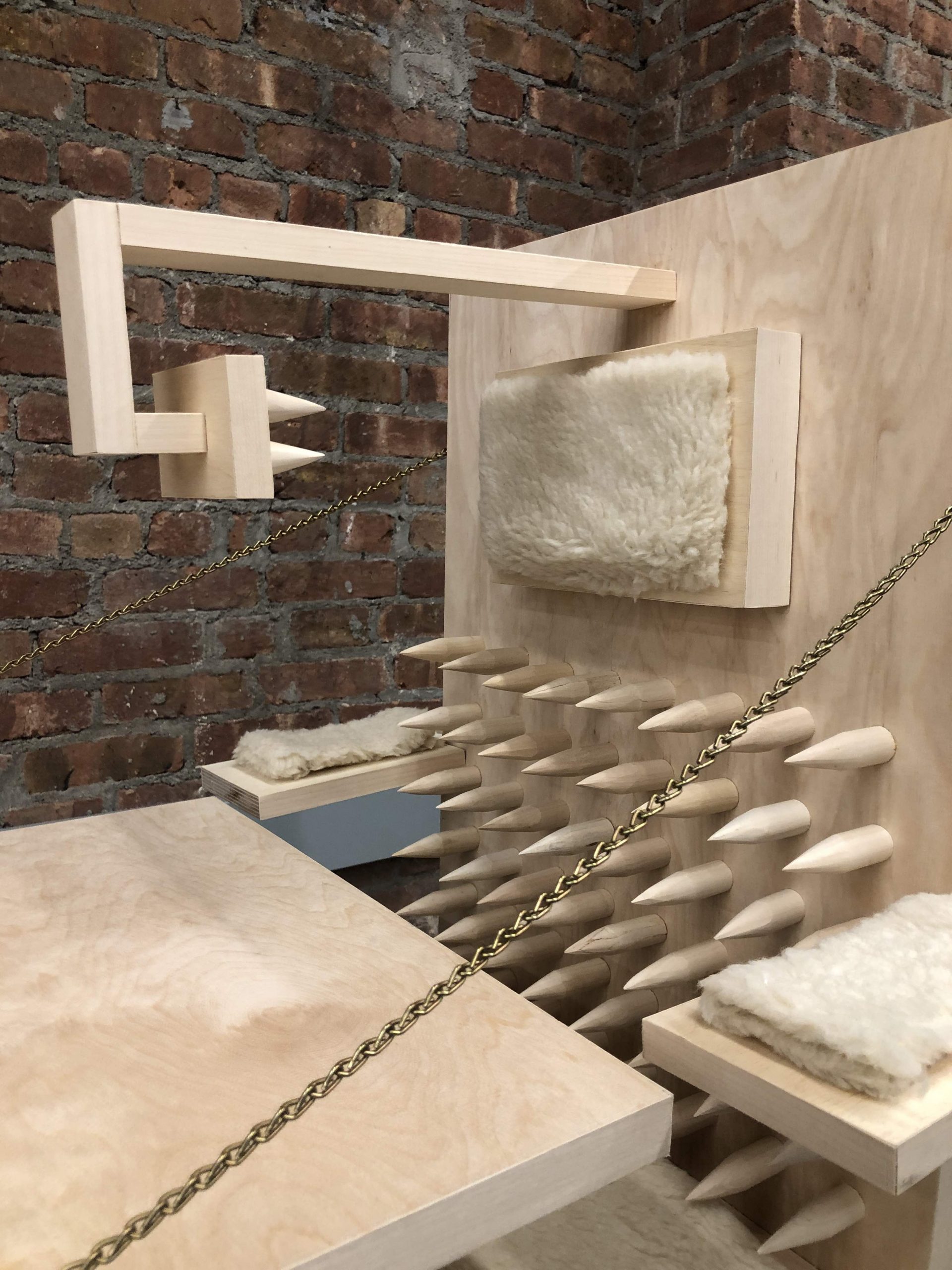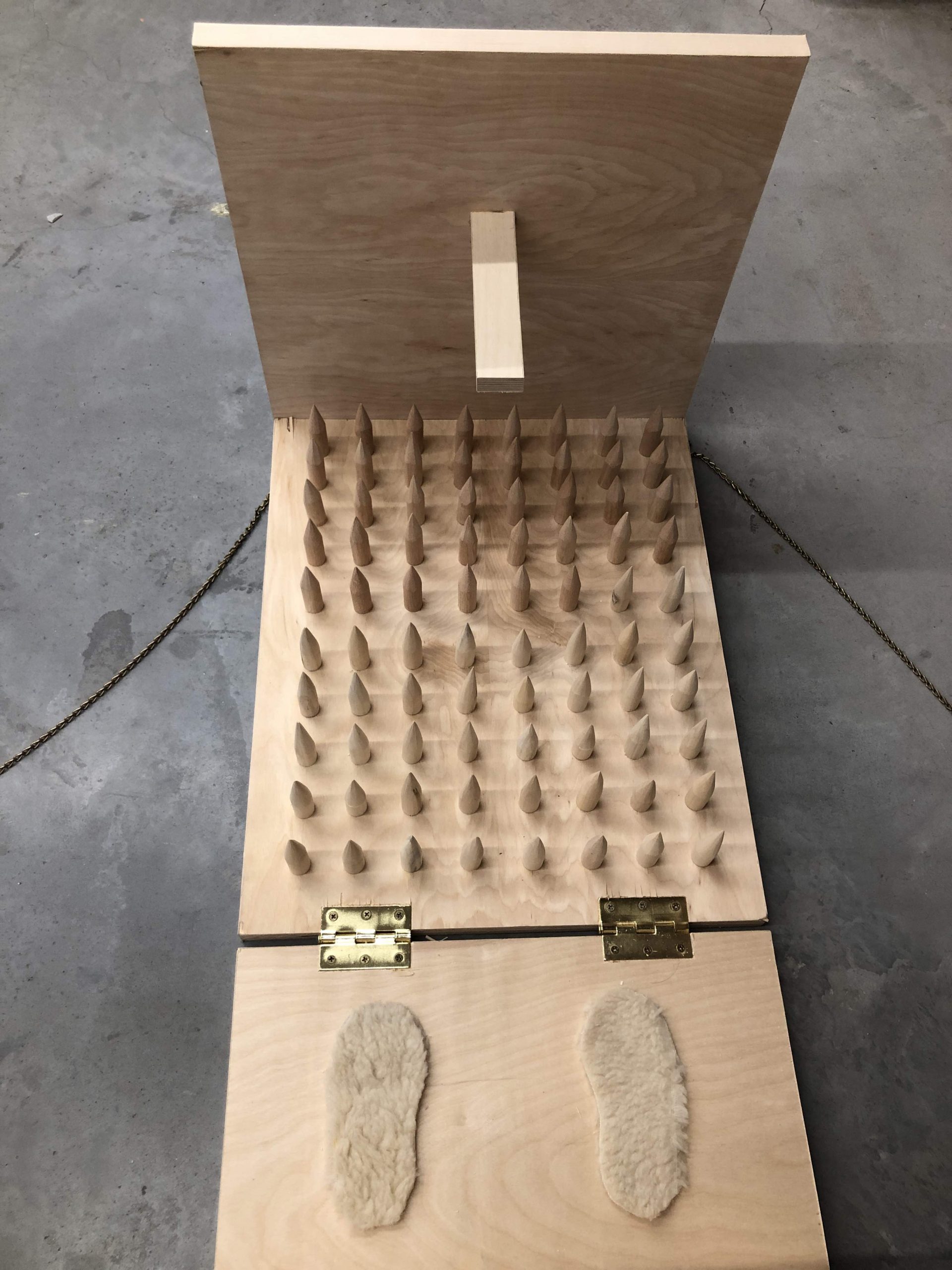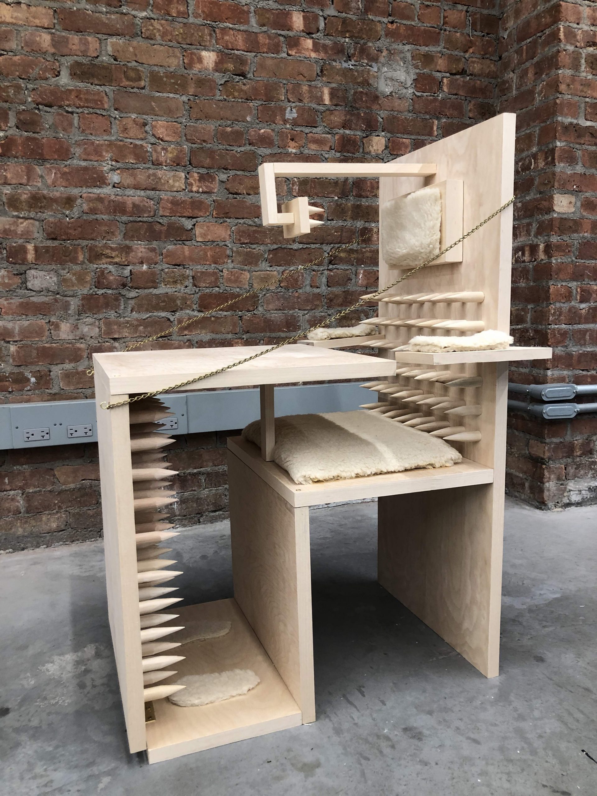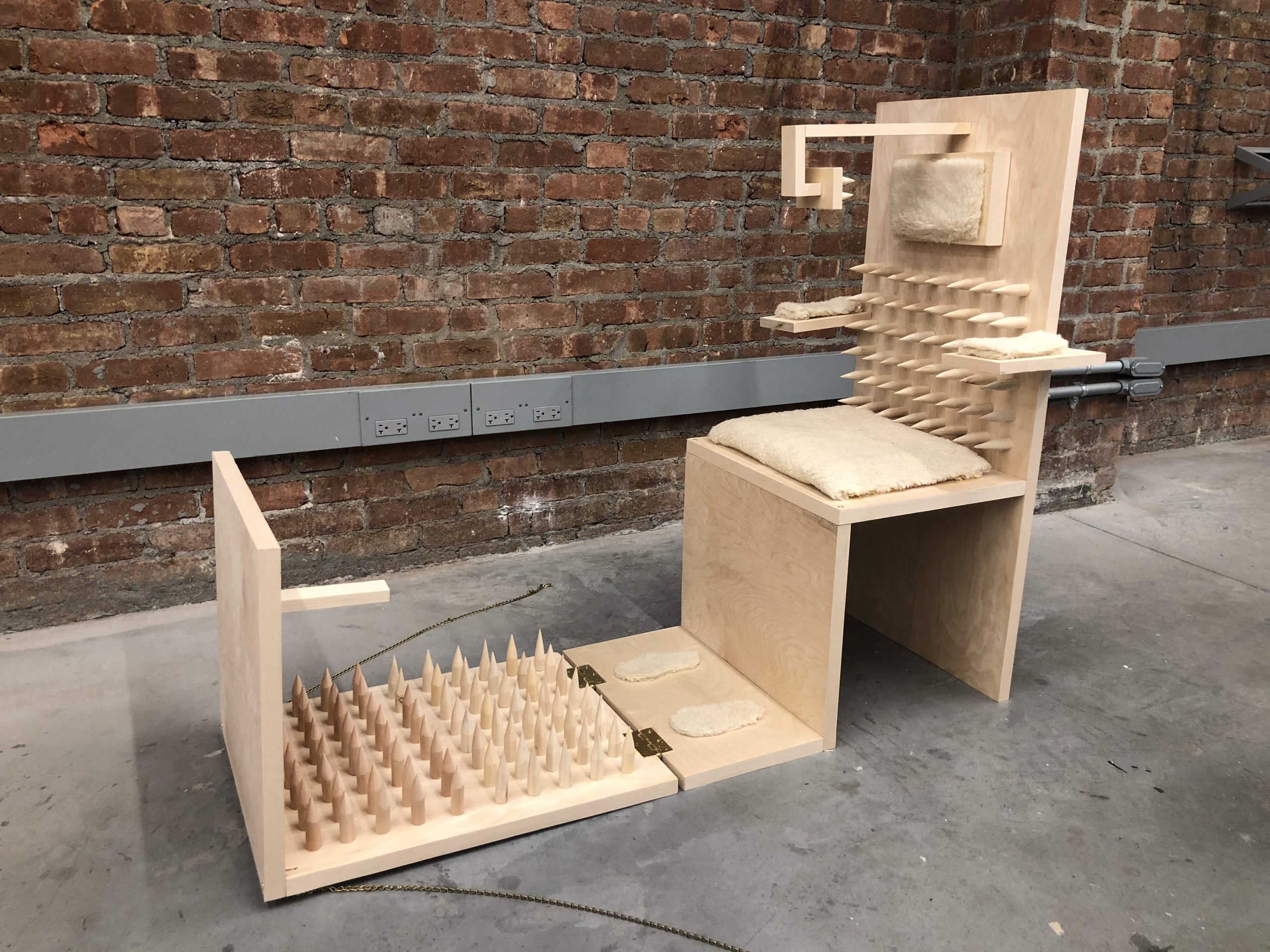 To emphasize both phenomena, I made a wooden fake ergonomic desk set for kids. The back of the seat and the table are all covered with stabs so that the kid’s body would present like how the real ergonomic chair required. Moreover, a head stabilizer covered with stabs is added to prevent leaning forward while sitting. To create some “comfortable feeling” I made cushions to make the desk set seem able to sit. For me, the most interesting part is how to get in and out of the desk. To make the kid get in, parents have to unchain the chain stapled on the back of the chair and chain it back. However, once someone sitting in it tries to escape, he/she would be hurt by stabs. The kid is locked until parents unchain it. Training kids into studying machines in a “good” learning environment provided by ergonomic desk set is a torture for them.