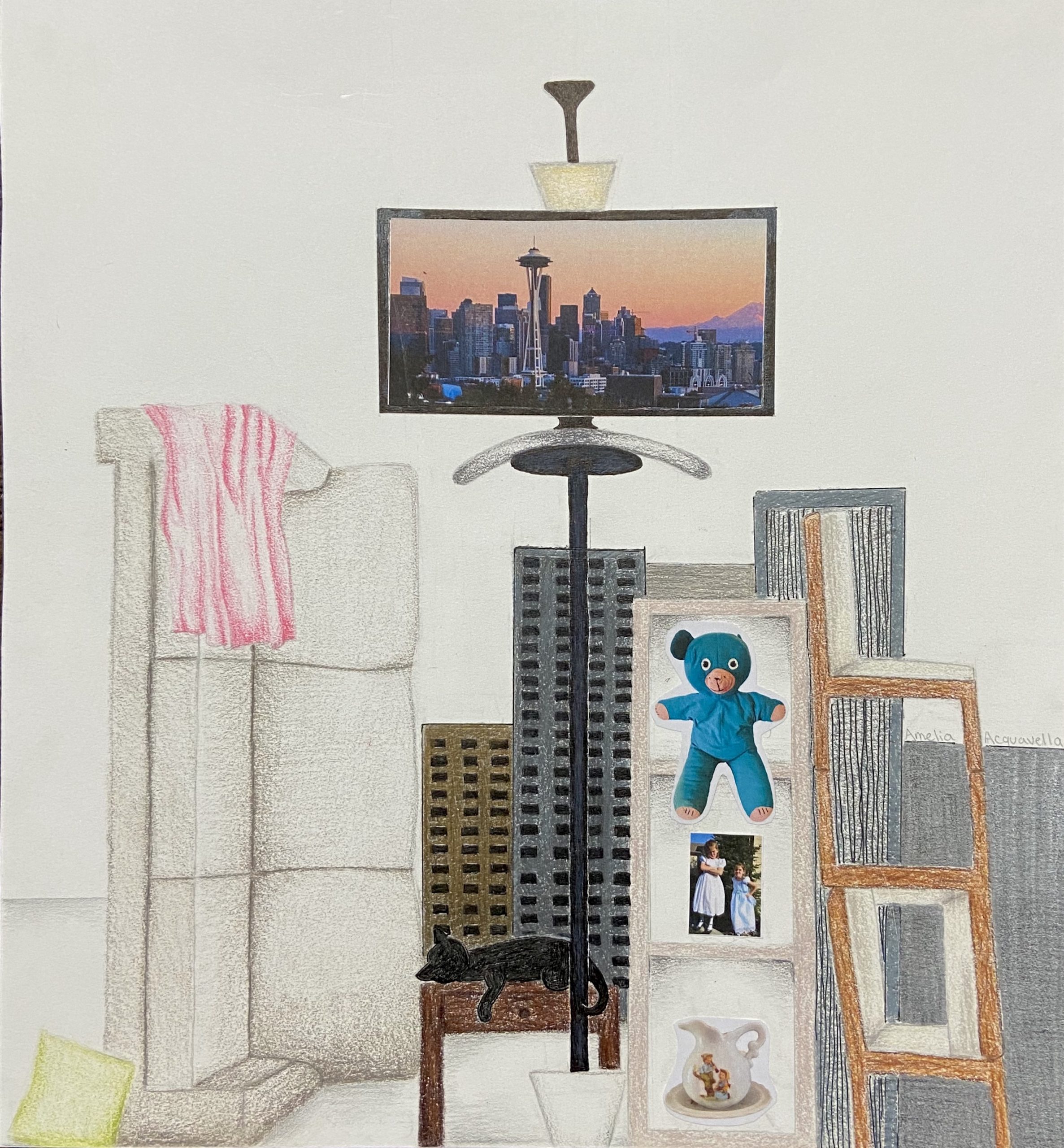 As a kid with divorced parents, I’ve had lots of homes. Specifically, I moved around a lot with my mom moving to many different neighborhoods in Seattle. Because of this, I’ve never really thought of one place as my childhood home or neighborhood. I wanted to convey that feeling in this art piece. I used furniture to portray the skyline of Seattle [my home city]. I specifically used furniture found in a living room because that’s where I spent the most time with my family. I decided to recreate the Seattle city skyline because I’ve moved many times in Seattle and think of the entire city as my home. The furniture positioning gives this piece the chaos found in moving but I still wanted to capture the comfort that home should give. The three photo cutouts on the bookshelf are family heirlooms that give this artwork a personal touch. This piece shows that my childhood idea of home is wherever your family is and can be more of a feeling rather than a specific place or an actual house.