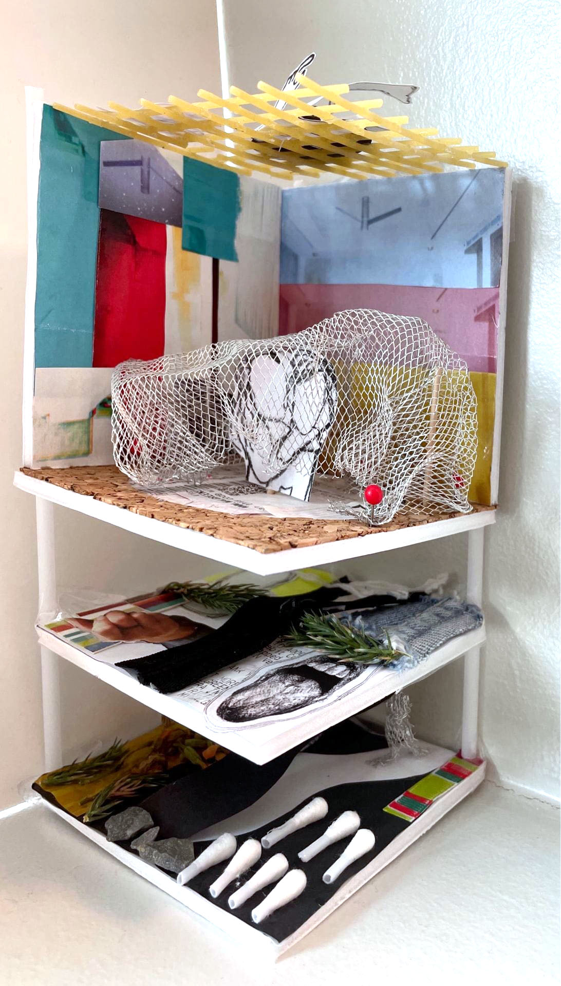 This project truly depicts my own visual interpretation of the most precious places, moments and objects for me. To depict my love for my mother’s home cooked spaghetti and how much do I miss it here in NYC prompted me to paste the spaghetti itself! I think this helped me add a 3-dimensional look to my project, incorporating both textures and forms I resonate with.On my way back from the school, I handpicked few pebbles, leaves and flowers to not only show my garden where my grandmother used to sit and knit but also how I feel wrapped up in the hand knit blanket that I got from India.