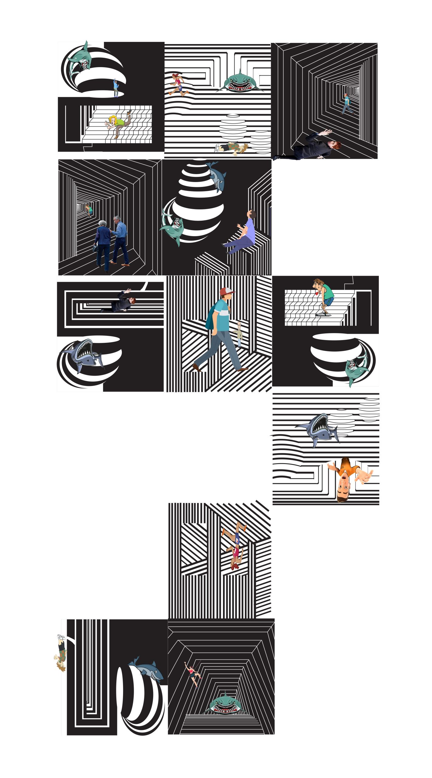 For my project, I thought of creating dynamic visual perception. The idea of making illusions was to provide the viewer with an image that grants liberty to its brain to make decisions. Other than this, to keep the essential essence of the project, I added minimal curved lines with no colour other than that of pictures. I think one of the reason that I did not think of adding colour to the lines is that black and white have the highest contrast, making the illusions more effective. Furthermore, Adding images and particularly sharks prompted me to make it look like a video game incorporating a lot of players stuck in illusions.