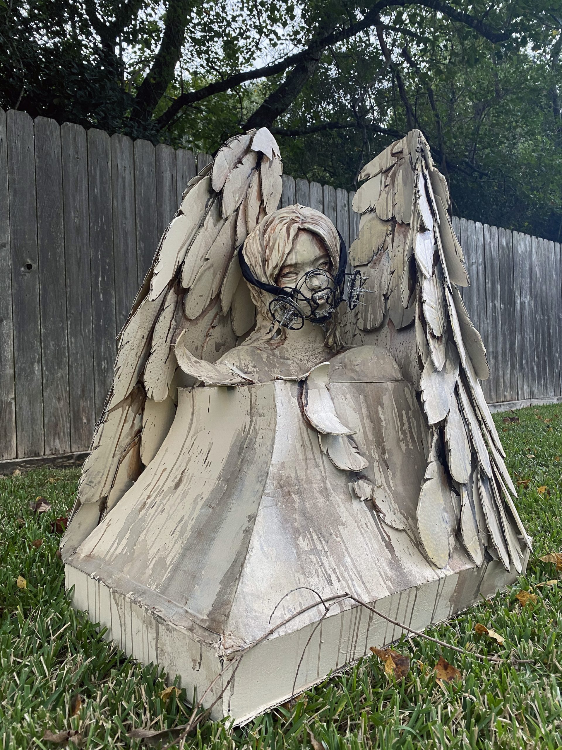 The pictured project depicts the first product: a wire mask, fit onto the angel marker of a tombstone. As an answer to the given prompt, my initial object in line form was a functional yet highly decorated gas mask, and the presentation piece, in turn, was a version of weeping angel tombstones, chosen both because I thought it would be interesting how the normally sorrowful incarnations of such figures might contrast with the generally sterile and almost modernly callous connotations of the mask, and also because I felt the mask should be seated on a face to better convey its function. My attempts at building both pieces fall into try/fail process work, where I mostly experimented with how to build the objects rather than truly minding what material to build them with. As it stands, most of the material were things I already had in my possession: Wire, Cardboard, foam, and lots of paint. Ultimately, this project was mainly exploratory, based a lot on instinct rather than heavy consideration.