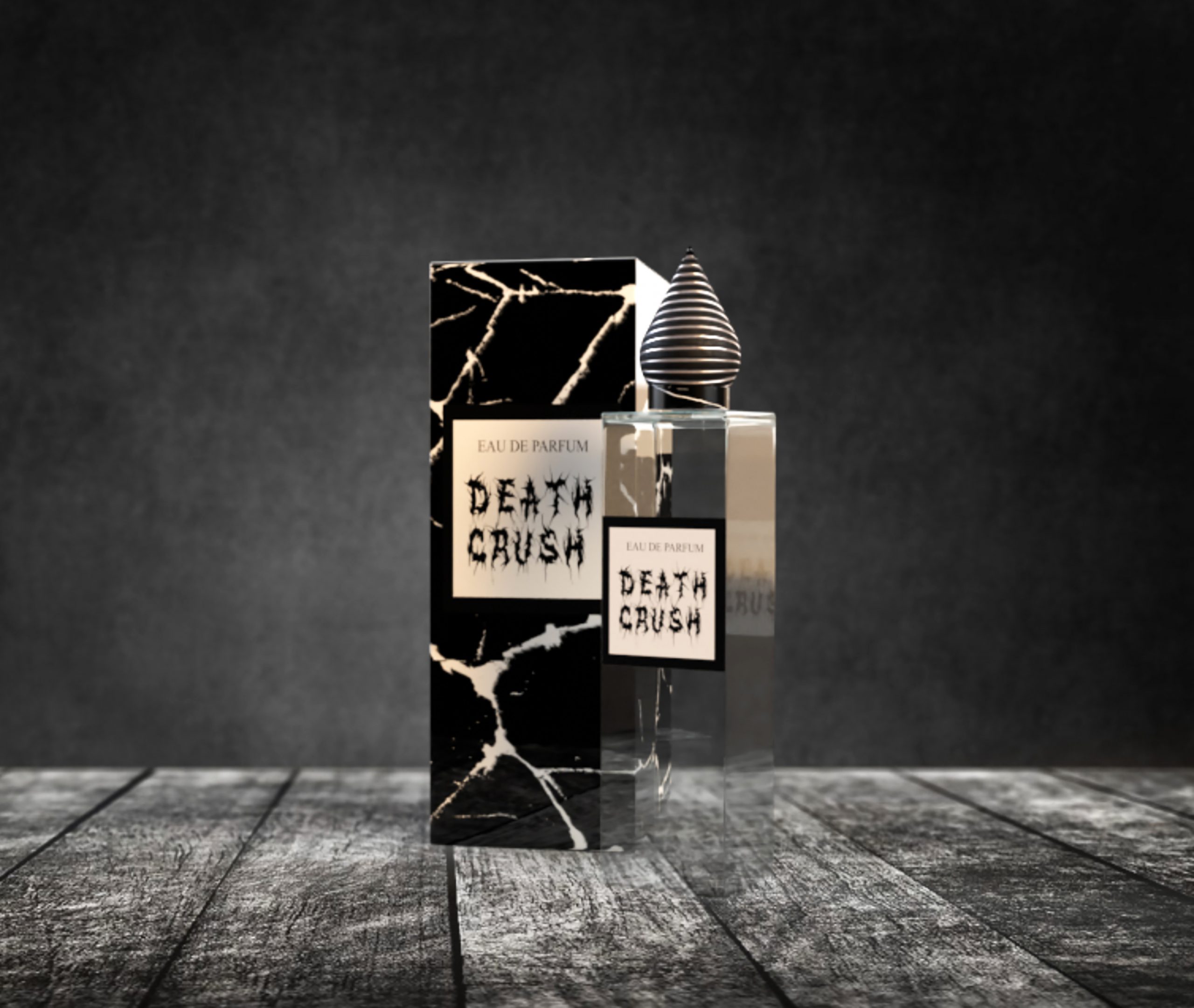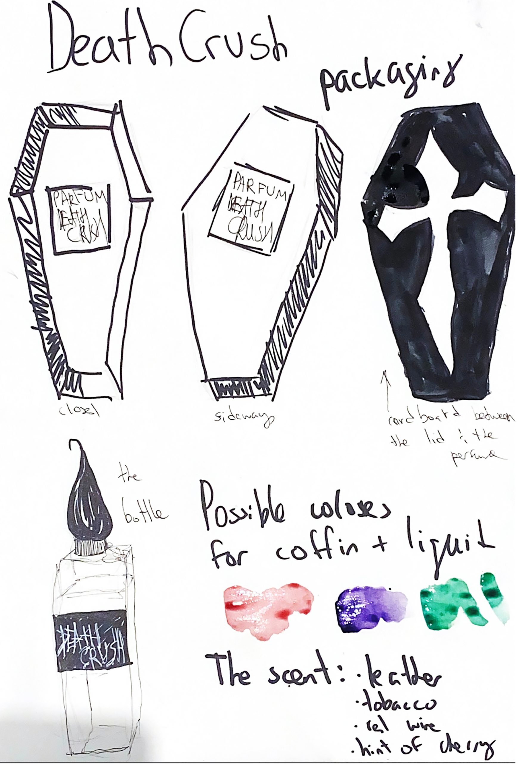 When creating the look for the perfume, I was inspired by the Goth and Metal subcultures. I wanted to create a product that would t right in with the dark and mysterious aesthetic that subcultures have, especially for the women of the scene. I also attribute myself to the metal subculture, and a lot of the people I know around me are also in that scene. This helped me to get the right look and the right scents for Deathcrush. I got the name from the song Deathcrush, written by a great black metal band- Mayhem. In the sketches below, you can see how I brainstormed the logo; my inspiration for it was the logos used in black metal album covers, hence the name choice. I initially wanted to place the perfume inside a coffin-shaped box but ended up with a beautiful and alluring black marble box, which I do believe looks more appealing in this situation. The scents that this perfume has are wild cherry, red wine, Rich tobacco, and a hint of leather; this mix of gorgeous bouquets perfectly describes the nature of my target audience.