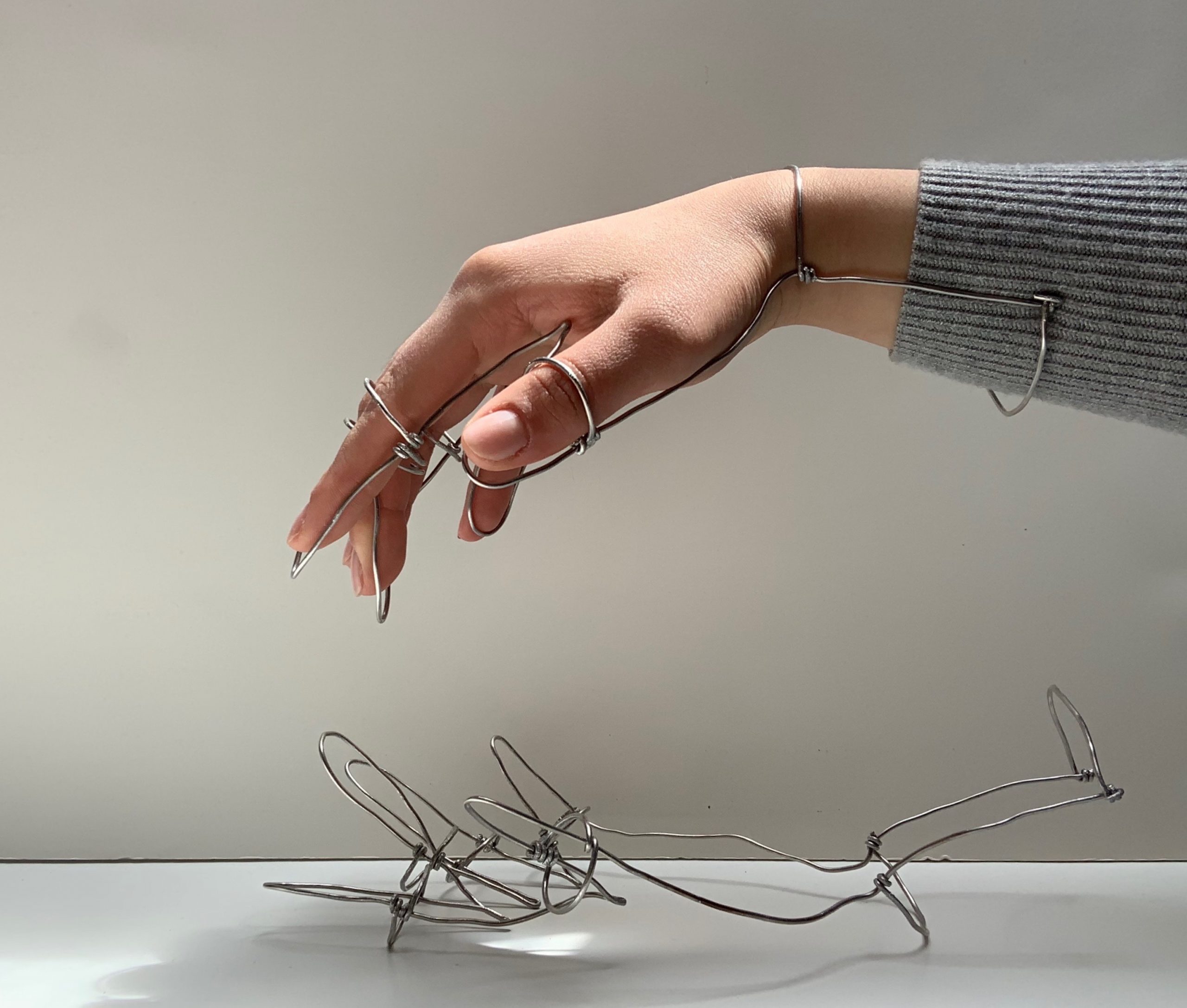 And so, for this project I decided to make a pair of gloves that lacked what a typical pair of gloves provides: a barrier between the skin and what is being handled. Using wire, I made the basic structure of the gloves, keeping the ideas of a minimal contour drawing and the human hand’s presence, as well as absence, in mind. Collectively, this piece speaks upon an item that is currently in such high demand, while having a ‘barely there’ quality when it is and isn’t being worn.