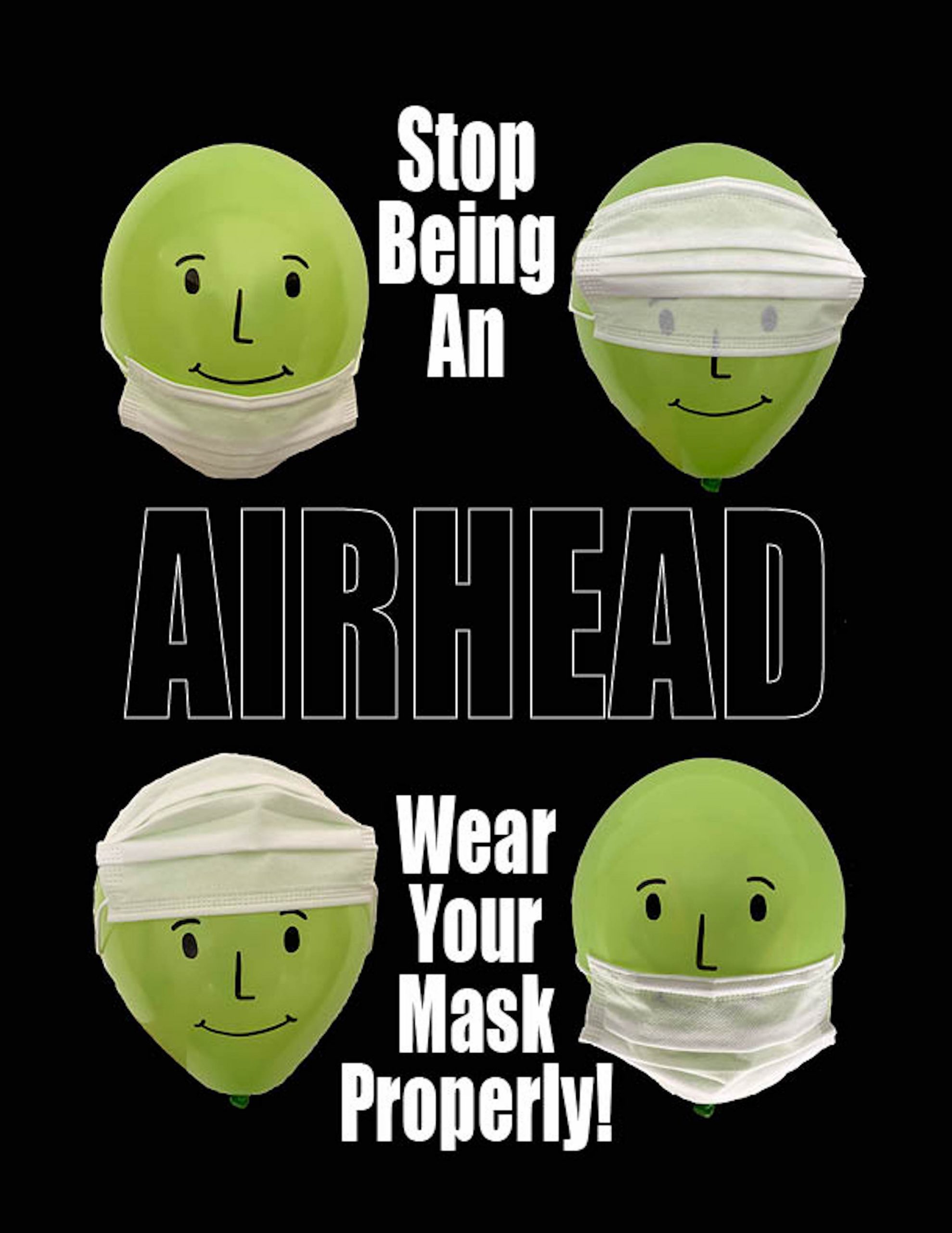 I wanted to capture how ridiculous it is for a numerous amount of people in society today to be wearing masks incorrectly, putting both them and people around them at risk. Using anthropomorphism, I gave a balloon the features of a human and included four different ways people would wear masks wrong on the balloon. Of course, most of those weren’t actually how people wore their masks incorrectly, but it captured how ridiculous it is. I wanted the poster or visual to make people laugh because of how ridiculous it is. In this piece, I gave purpose to several of its features. The balloons were green to represent the ongoing virus and how wearing a mask wrong would get you infected. The word “airhead” is only an outline to really capture the meaning of “airhead.” I just thought this was a good way of expressing a message so important today.