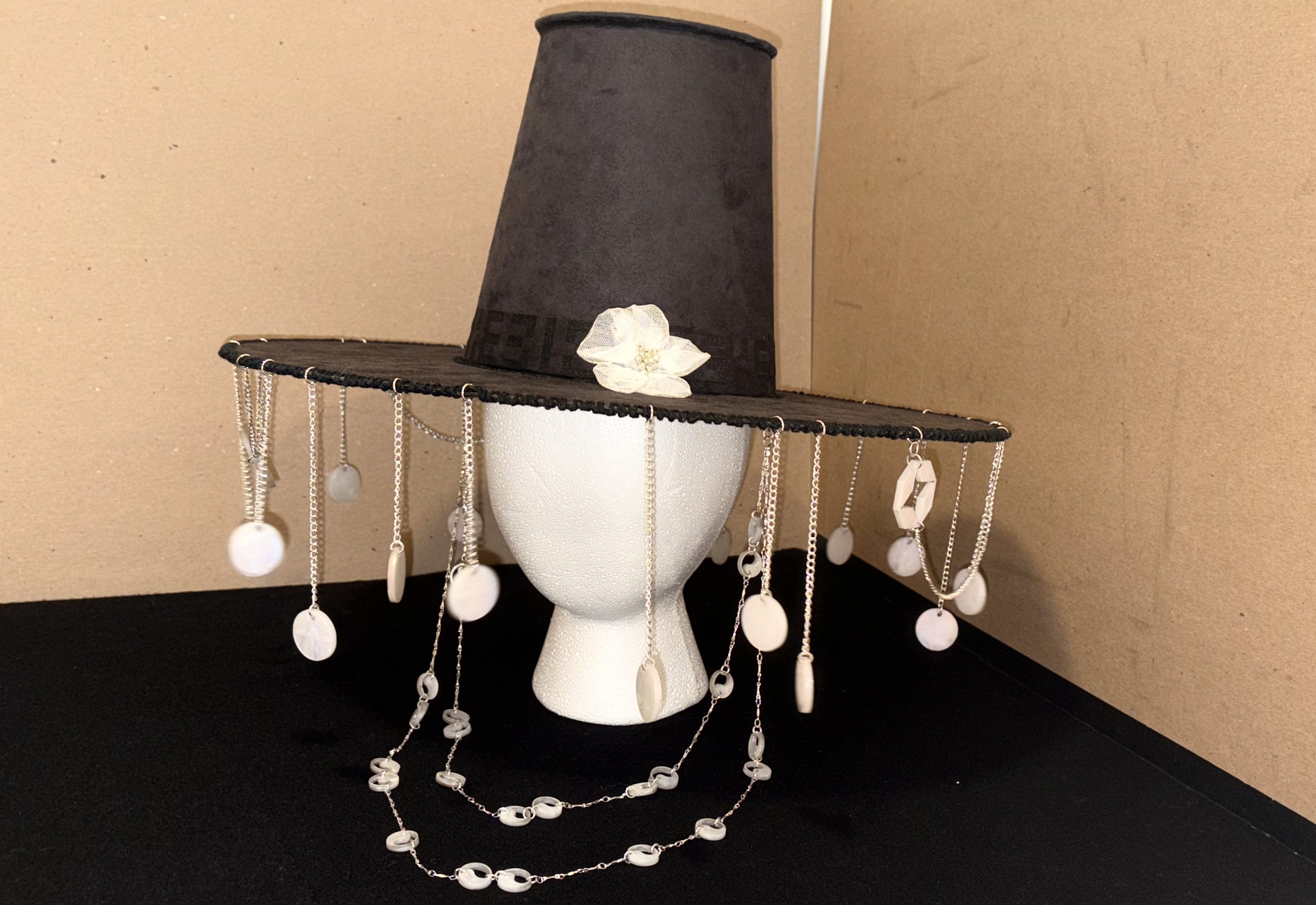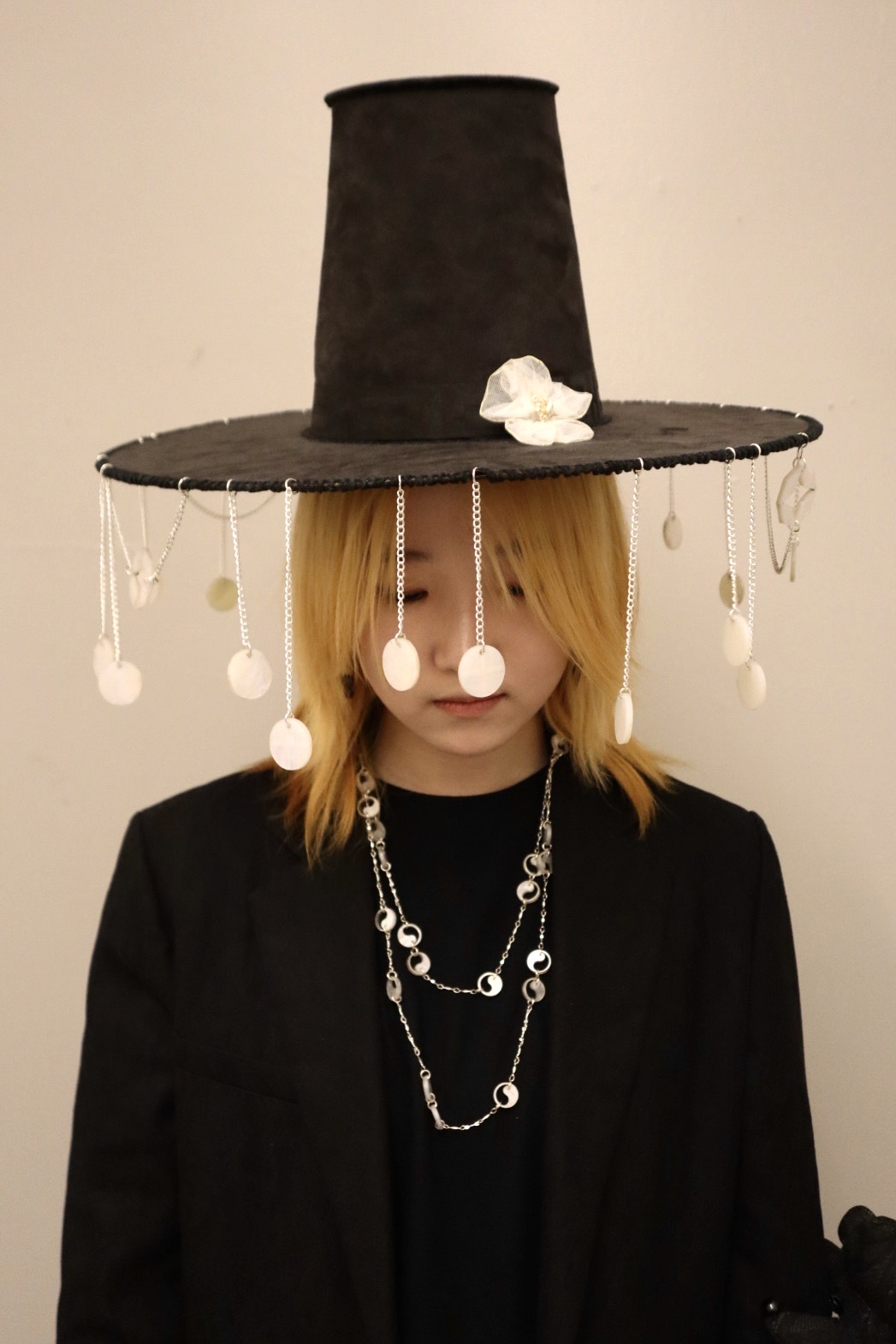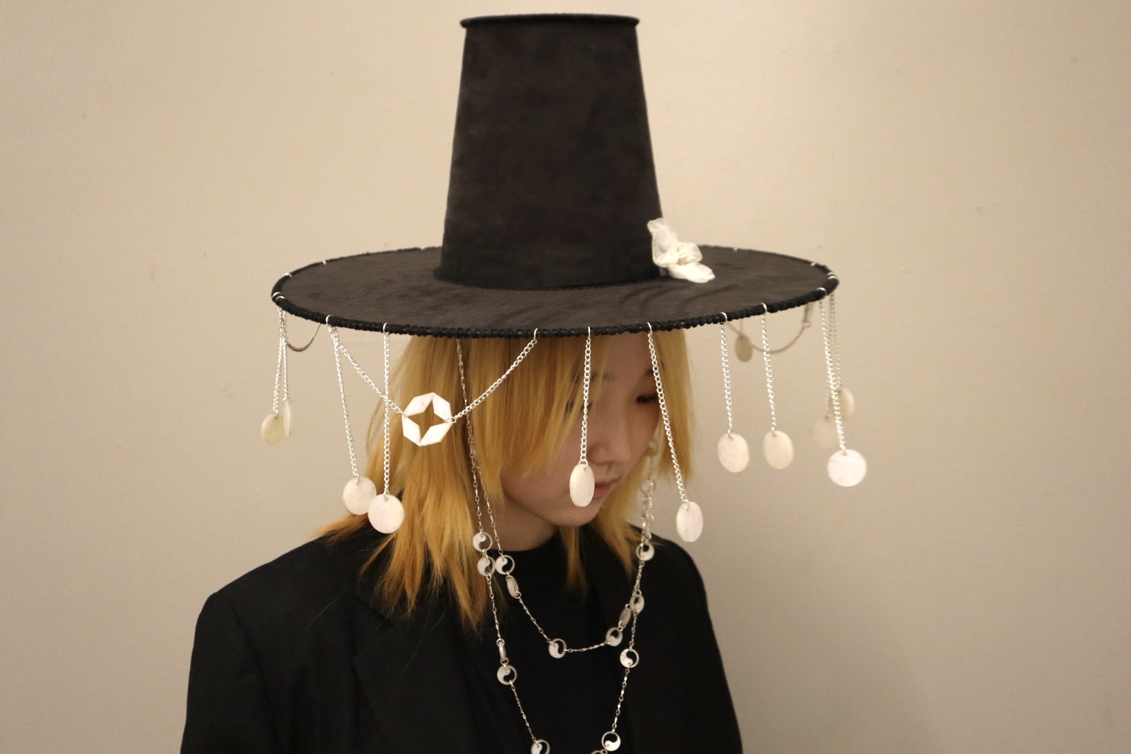 This hat is customized for my Korean client Chae (the person in the picture). The design references the traditional Korean hat (Gat) in its form and is decorated with Korean elements, including their national flag pattern, national flower, and cultural patterns. Every part of this hat, including the pendants, was measured, graphed in Illustrator, cut with a laser cutter, and sewn or chained together. The chain strap is detachable from the hat; my client can choose to wear it as a necklace or a decorative chain with the hat. The material and aesthetics targeted Chae’s preferences, including the use of suede, black, and pearlescent acrylic, which is inspired by the pearl-inlaid technique (Najeonchilgi). Two designs and prototypes were made at first. After interviewing my client again for feedback, I merged the two designs and decided on the outcome. During the test cuts, I experimented with sizes. For example, the sizes of the pendants, the sizes of the holes, and the distance between two holes, so that the material would not break. I also used different stitching methods in leather crafts for better execution.