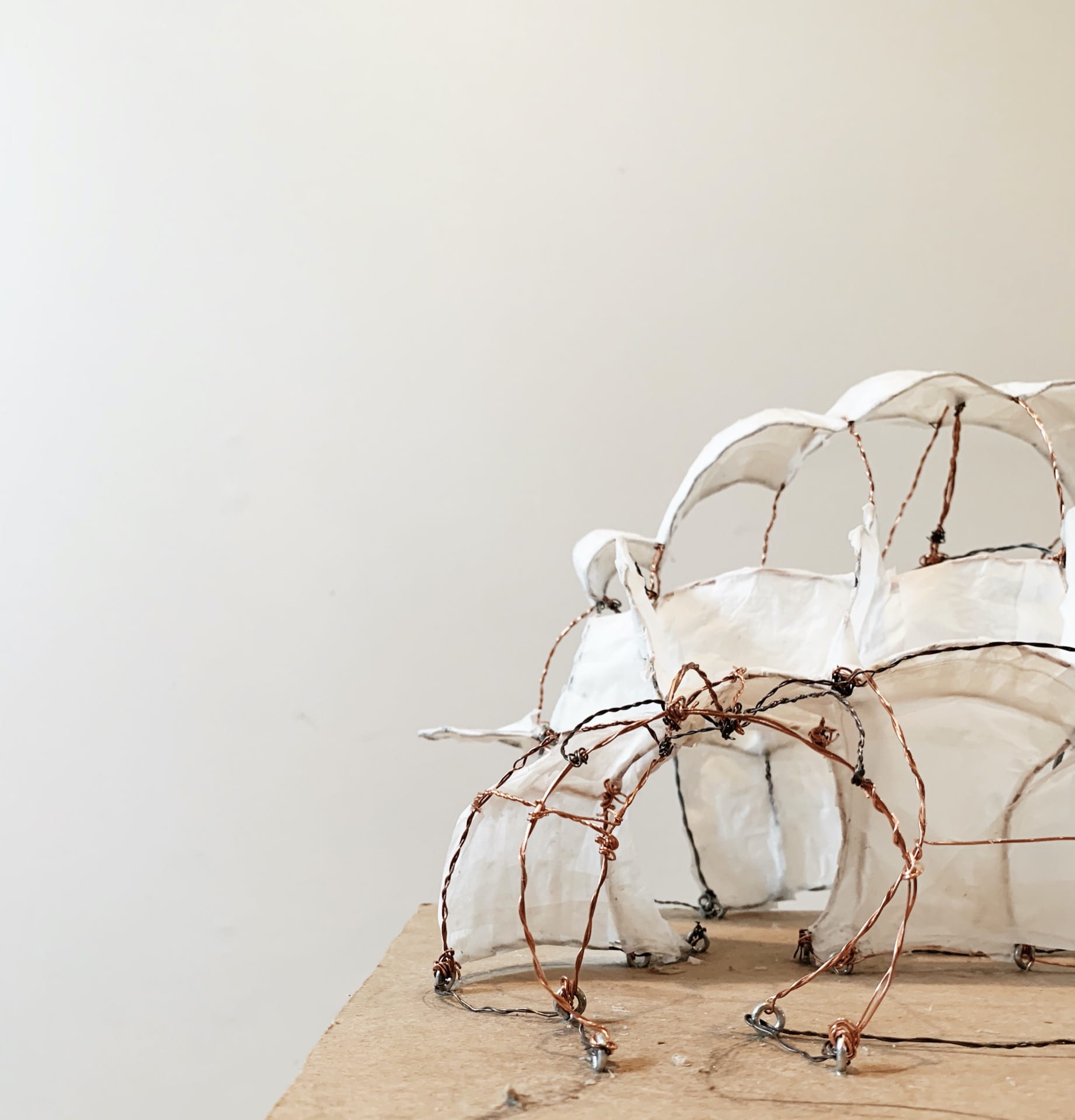 Prompt: Beginning with orthographic and contour drawings, we had to investigate organic architecture that incorporates structure with movement. Then we had to make wire-form sculptures, first using contour, then projection, and finally imagination. for covering we could have used any fabric or paper we wanted. Lastly, we were supposed to photoshop our work to make it feel like it was in an actual space.