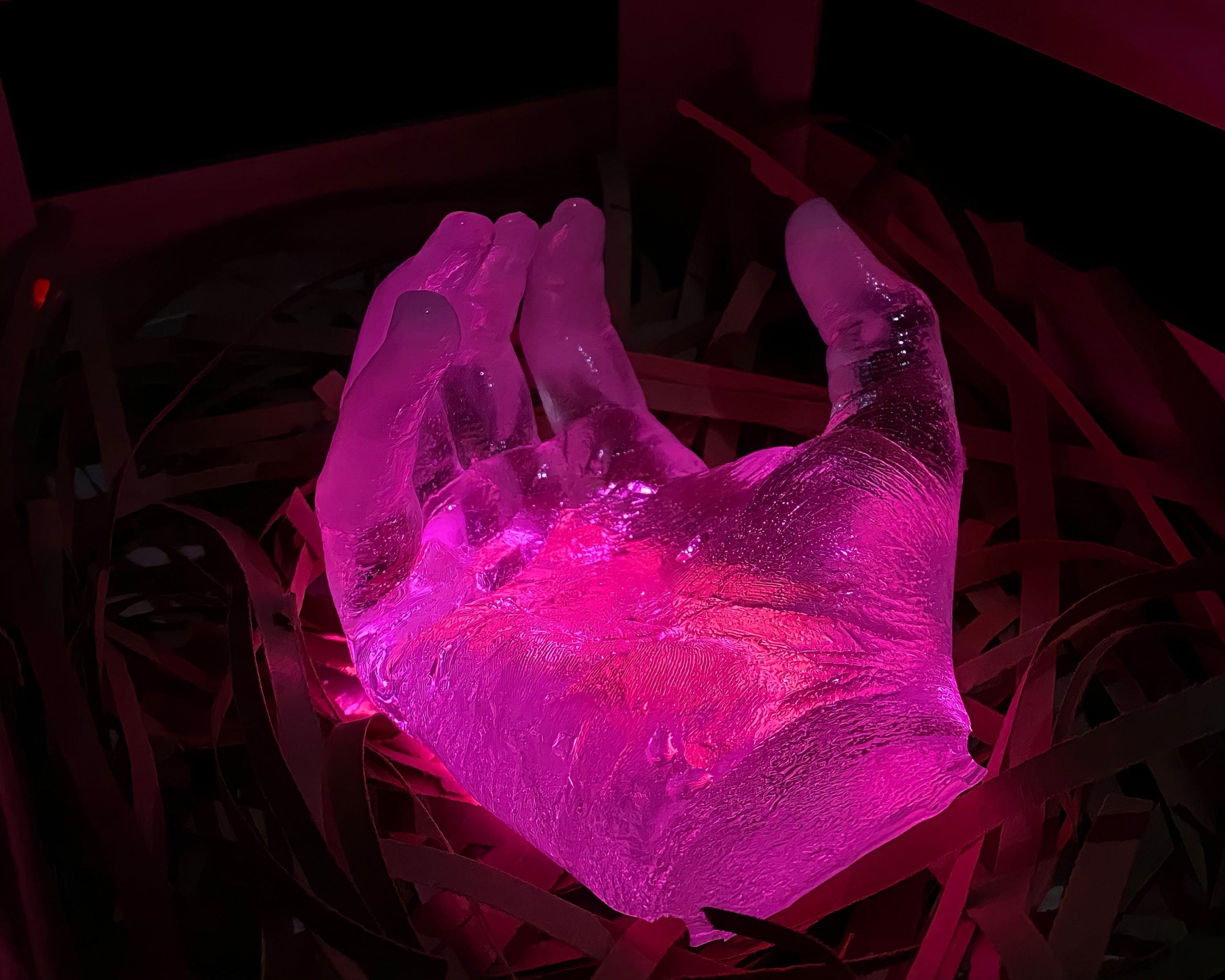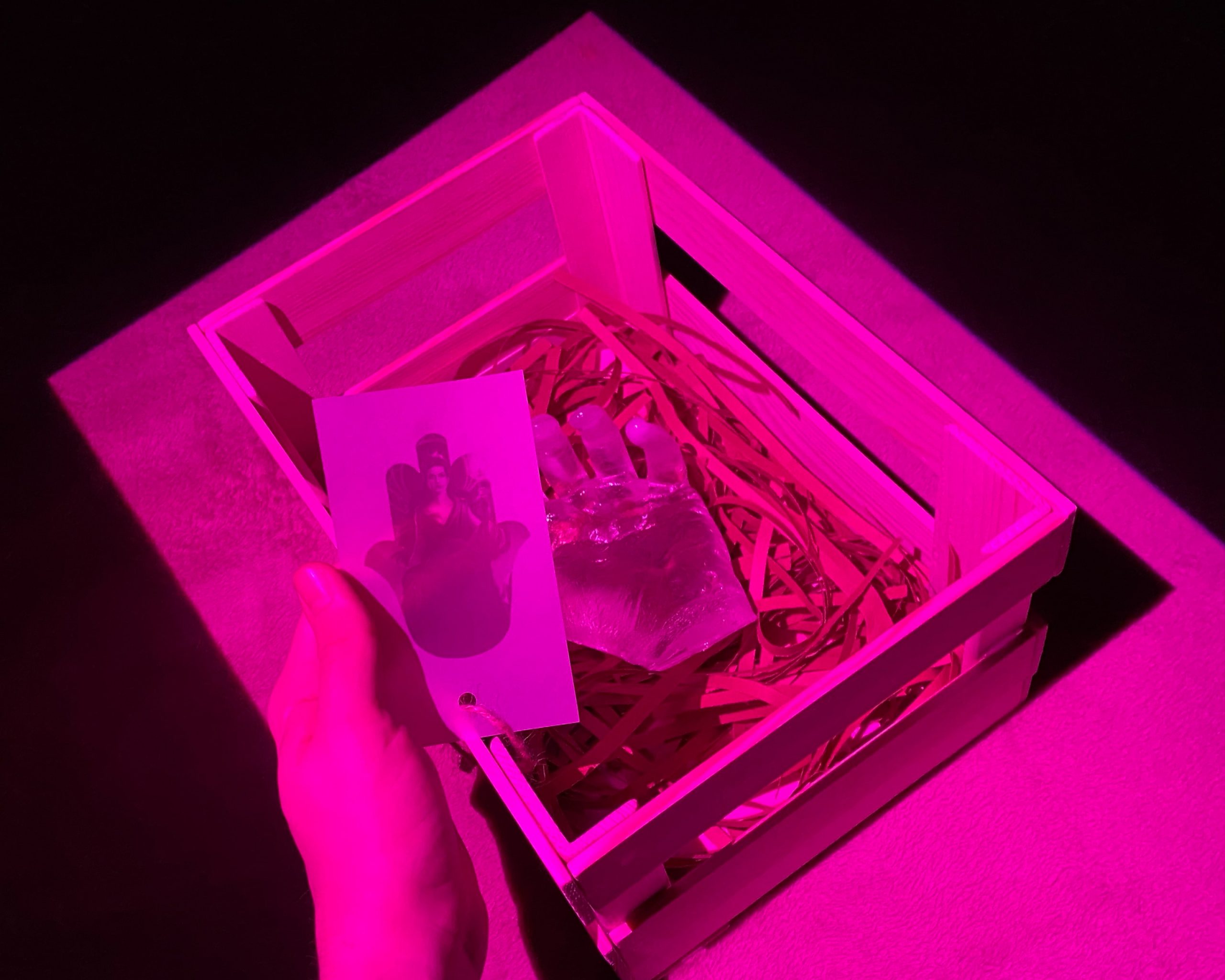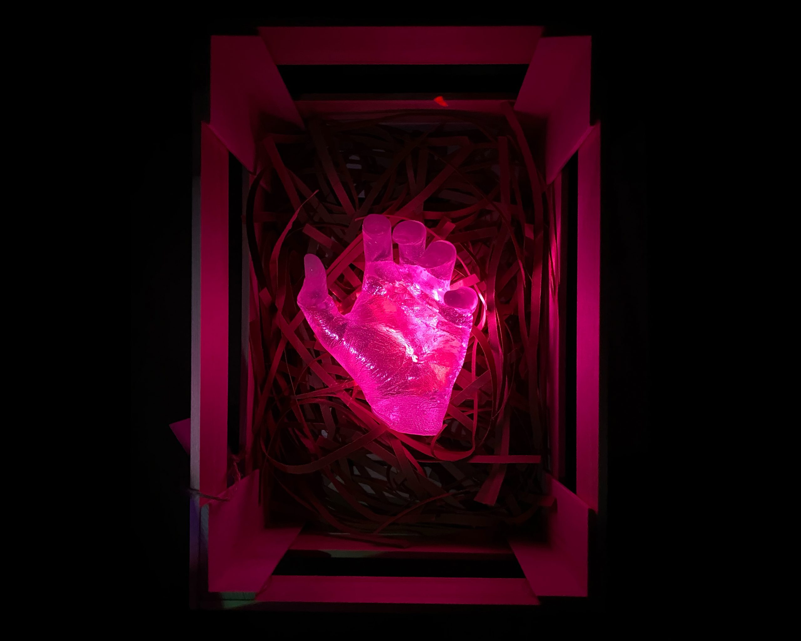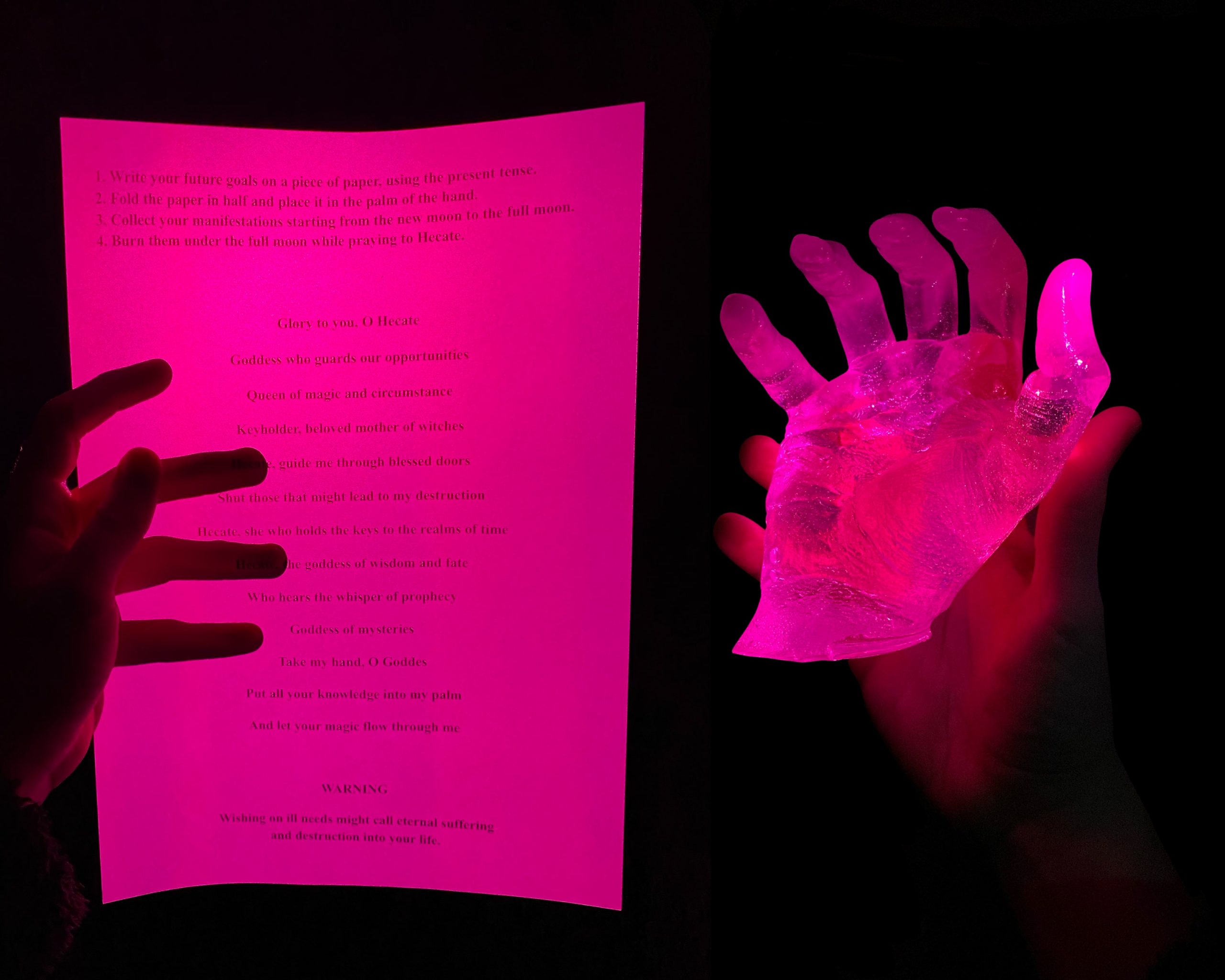 The piece has the shape of an open right hand mimicking the form of the Anatolian talisman Hamsa and it is carved out of Rose Quartz which possesses the power of holy vibrations and calling your manifestations into your life. I designed this object with the intention of creating a piece of equipment that would be helpful in the act of manifesting. You will begin by writing your future needs in pieces of paper, folding them, and collecting them in the palm of my sacred creation. Starting with the new moon, you will repeat this process till the arrival of the full moon. With the rising full moon, you will burn the paper you have collected over time and send your messages to Hecate and honor her by recognizing her presence. I used Apoxy Resin to obtain the clear form of a crystal and used projection as a secondary light source to make the object shine pink hues. The object comes in a wooden chest with a user’s manual. For this project, I did extensive research about the coven of Hecate in Anatolia by looking up museums’ websites and Wiccan blogs. To enchant the piece, I also made up a research-based story that includes an Anatolian coven worshiping Hecate in the early times of history.