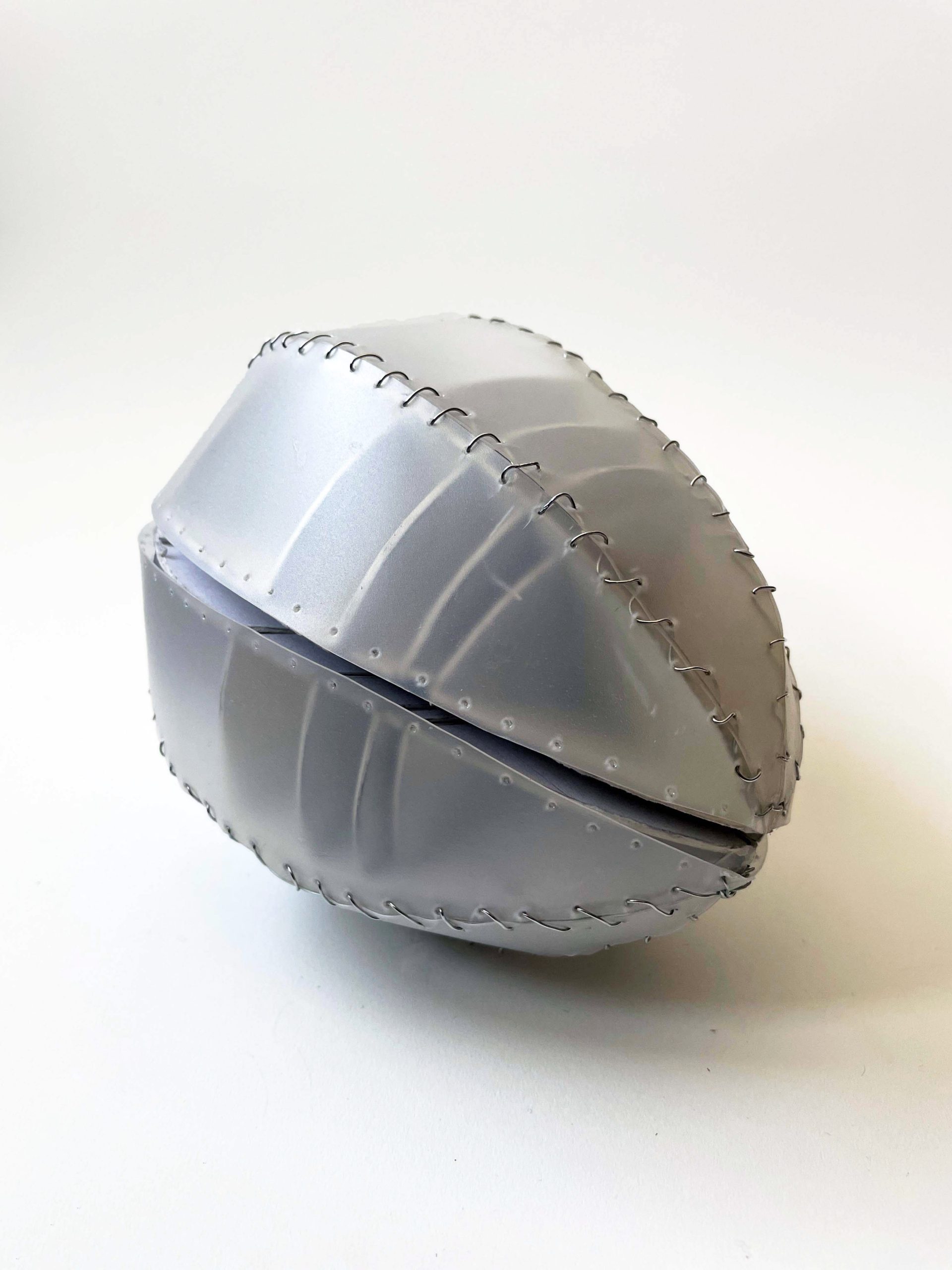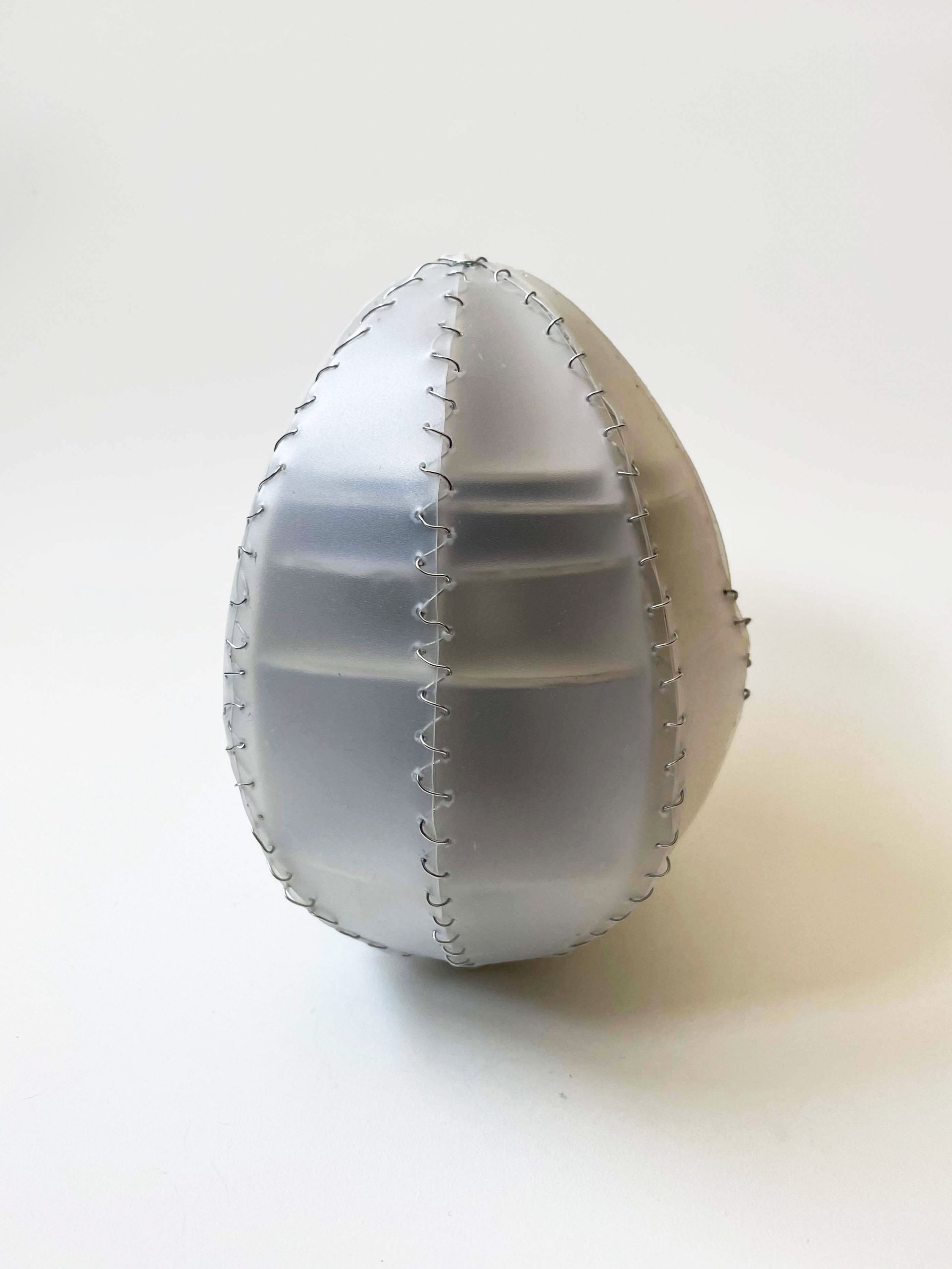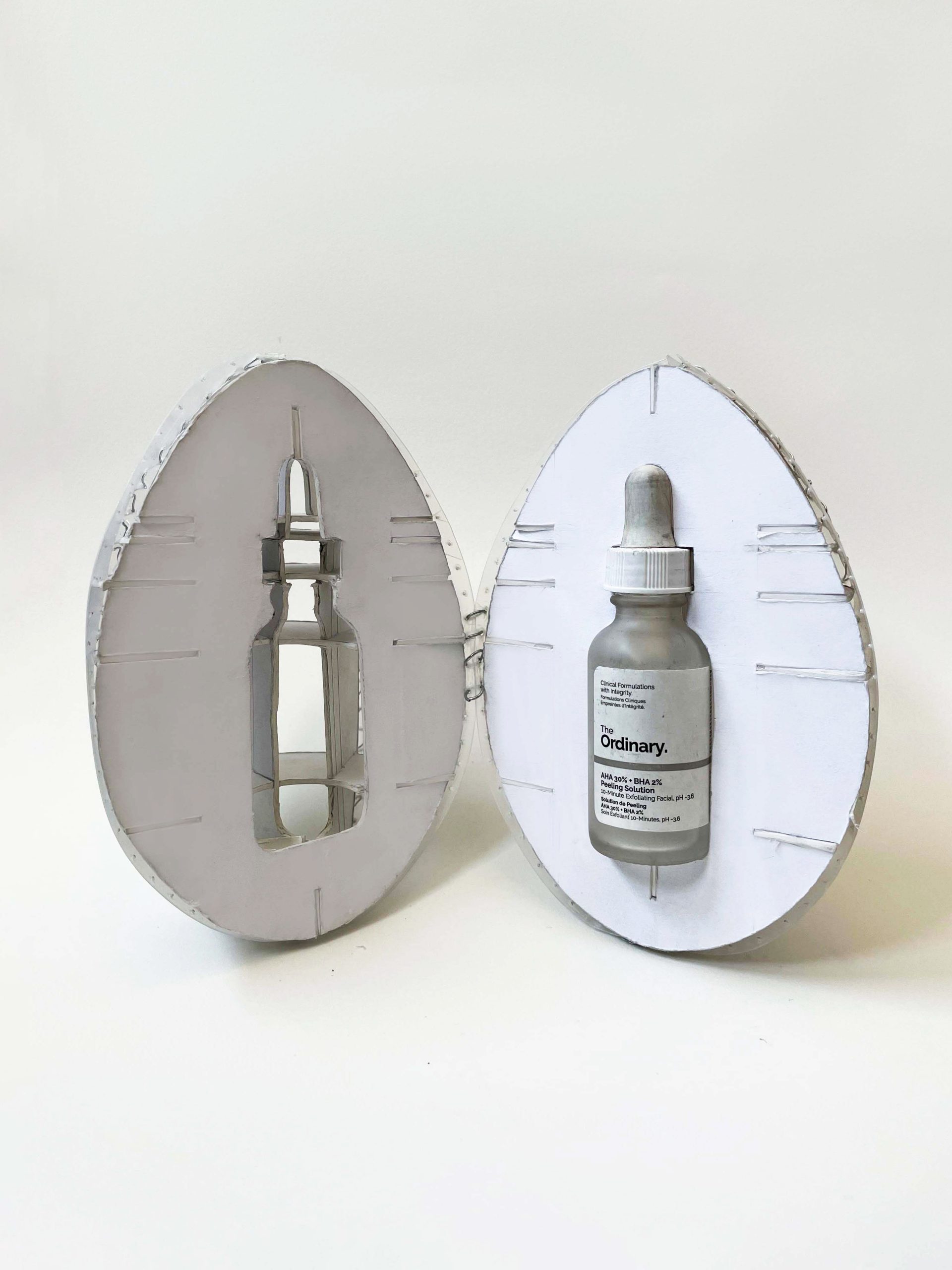 Inspired by the Faberg Eggs as well as the modern minaudière clutch as an example of how aesthetic design need not follow its functionality, I wanted to play with the idea of a protective vessel to house my object. Using the visual of an egg, it becomes ironic and creates a sense of light-hearted humour with its presentiment that eggs are something that is fragile and insubstantial. The object I selected was a dropper bottle that had spilt during the process of moving to New York, thus wanting to experiment on how to provide a solution for that problem. For the final model, I decided to use frosted plastic, similar to the frosted glass of the original bottle, to create a cohesive visual language. The frosted plastic also shows a ghost of the internal structure which illustrate how the model was constructed, giving it character with the additional feature that can be seen. I decided to use a 24 gauge wire to stitch the pieces together over fishing wire or floss as I feel that it adds an additional feature to the edges, similar to the detailing of the Faberg eggs, by giving the model a contrasting colour and texture.