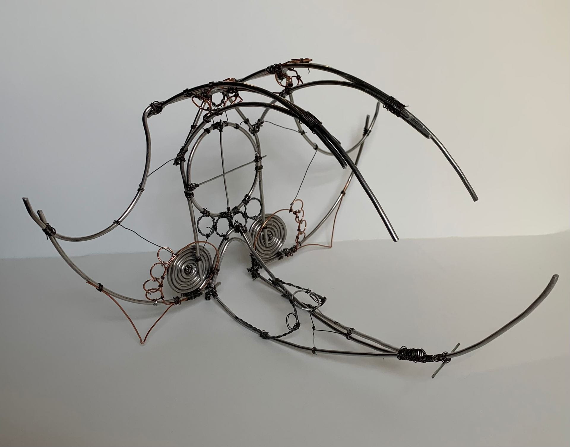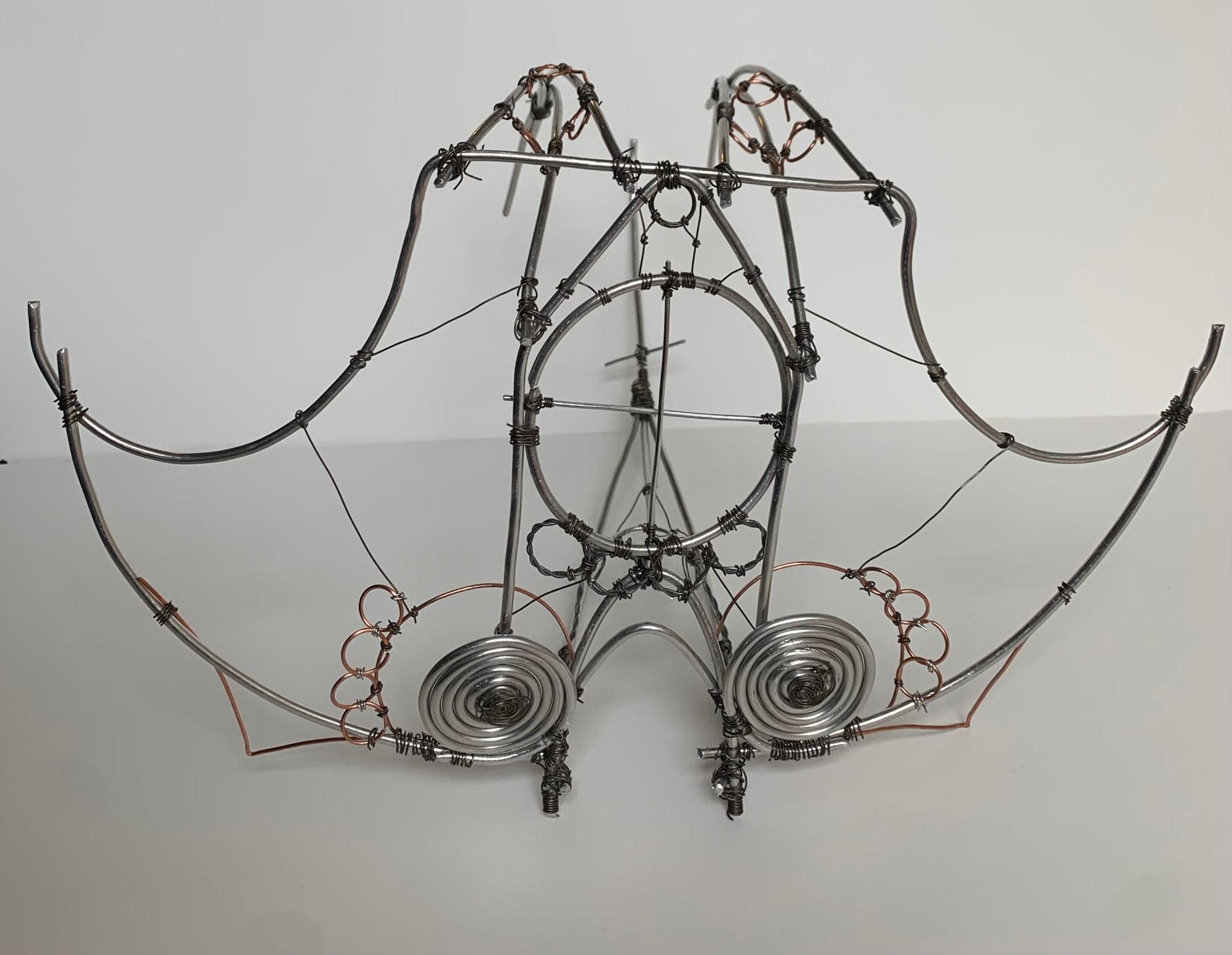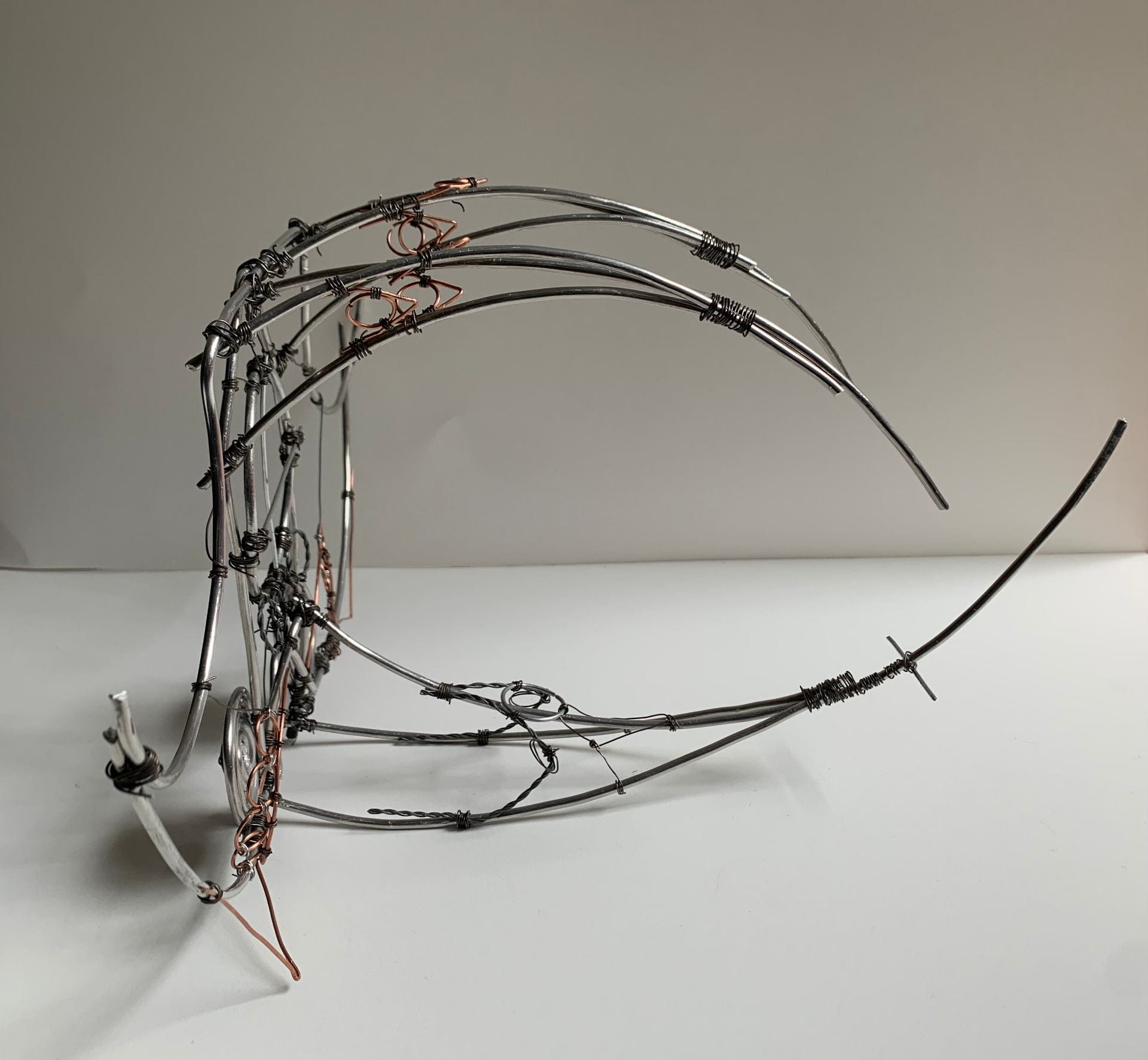 I wanted to create an exoskeleton that took away the sense of sight that allows us to make these comparisons . In order to do this I created a mask that block the wearer’s vision. When researching, I also found that blocking one sense makes others stronger and I wanted to explore this idea as well. I used the rhino beetle as inspiration for the exoskeleton’s shape, and I was inspired by gothic architecture for the detail. When creating the mask, I thought that wire would allow me to create the most detail and give me the desired aesthetic. Originally I had the intention of painting the mask black, but I ended up enjoying the look of the different colored wires.