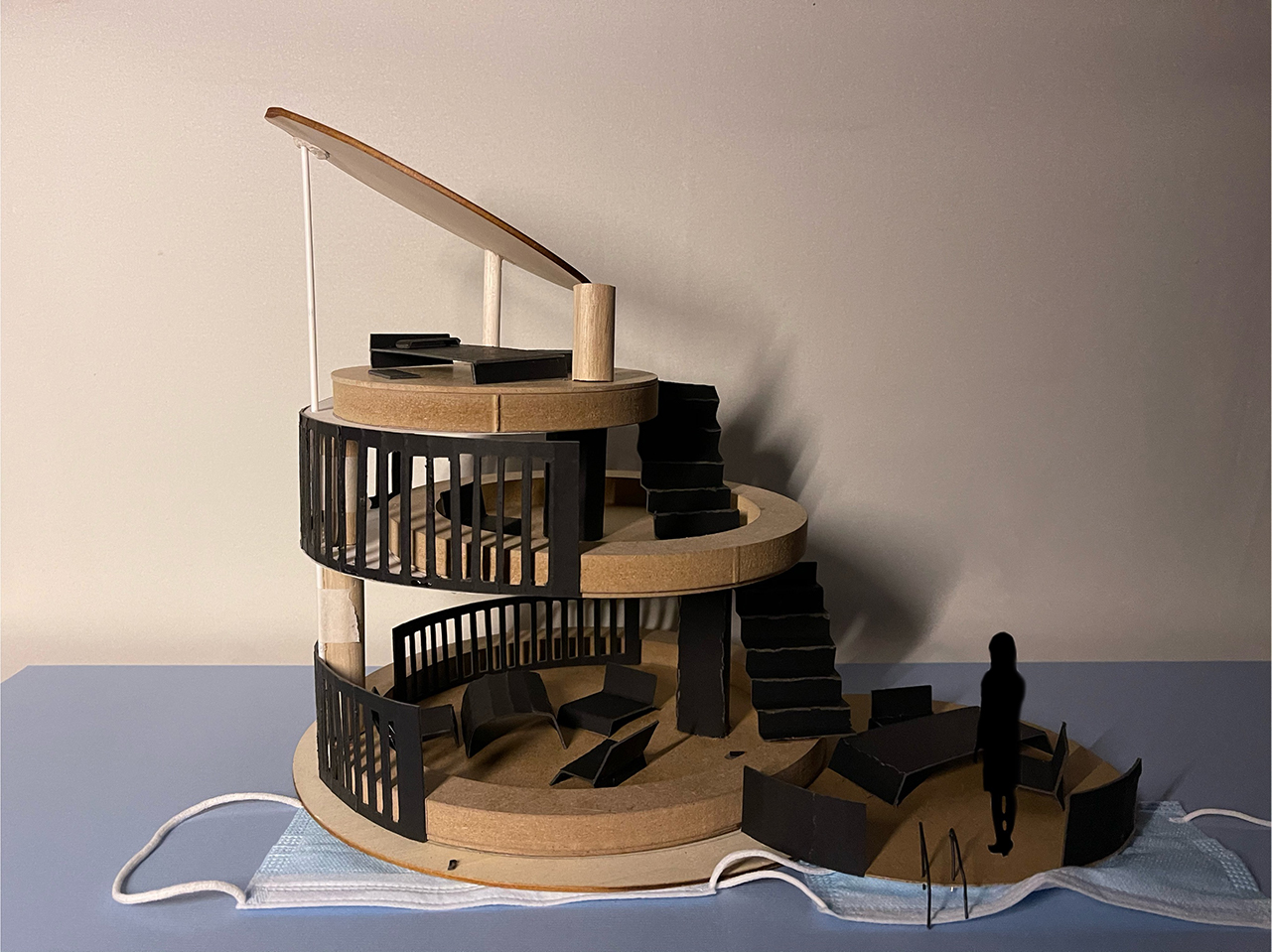 The design inspiration for my house came from the sea, but because of the geographical location of my house, there is no sea, the choice of a river is the same, It is all about places with water. I hope that my house has a sense of hierarchy, not a large square floor, but a round shape connected with stairs gives a sense of level. My house does not have walls. The whole sense of space is an open space, it is suitable for summer. The first floor belongs to the multi-function hall, because the location I chose is a park. In normal times, it can hanging out with some friends and can live in this house, swim in the river, and chat etc. The second floor can also be used for entertainment, and the third floor is an open space bedroom, where there is sunshine in summer and you can enjoy the sun. In terms of materials, the bottom is a thick wooden board cut into a circle, and the fence and furniture are made of cardboard.