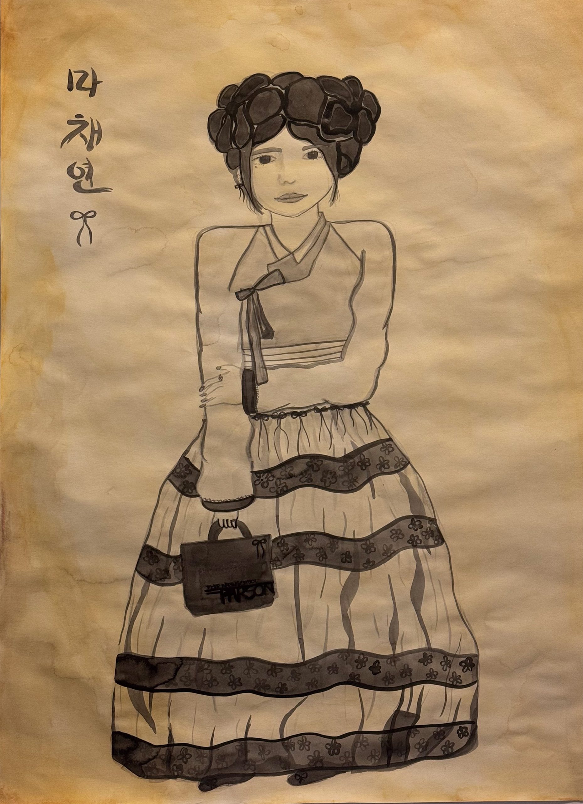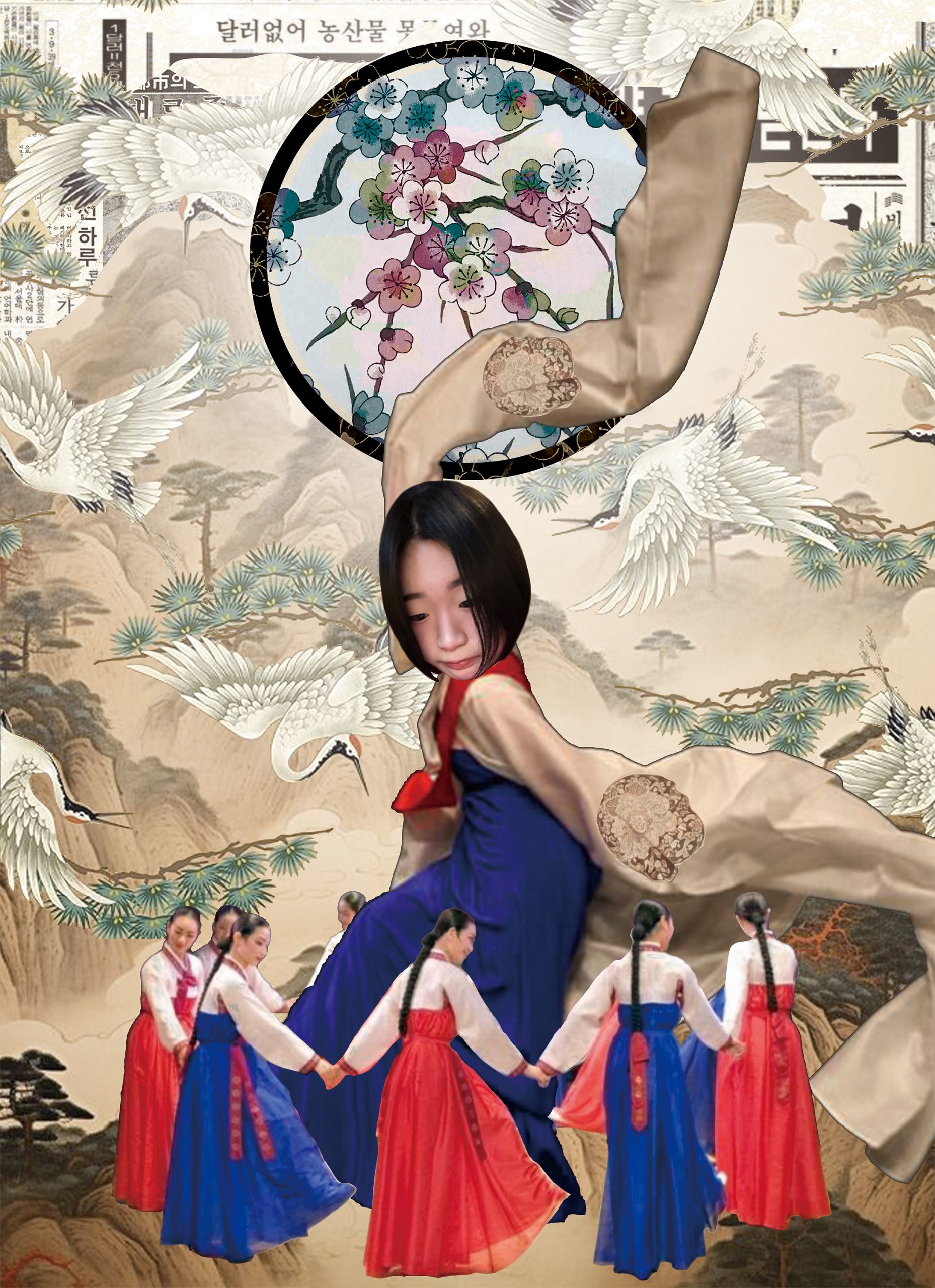 In my analog drawing, I used traditional meok ink, layering diluted washes and gradually building darker tones. I created a hanji-like background using watercolor pencils and water, and depicted myself wearing a modern interpretation of hanbok, combining floral patterns and ribbons to connect past and present. Researching ganggangsullae became central to my concept. Historically performed under the full moon, the dance gathered women to share emotions, support one another, and move as a collective. In my digital collage, I layered Korean newspapers, jingyeong landscape paintings, cranes, and a glowing moon containing mugunghwa, Korea’s national flower. By placing myself among the dancers, the work shifts from a single “self” toward a sense of “selves.”