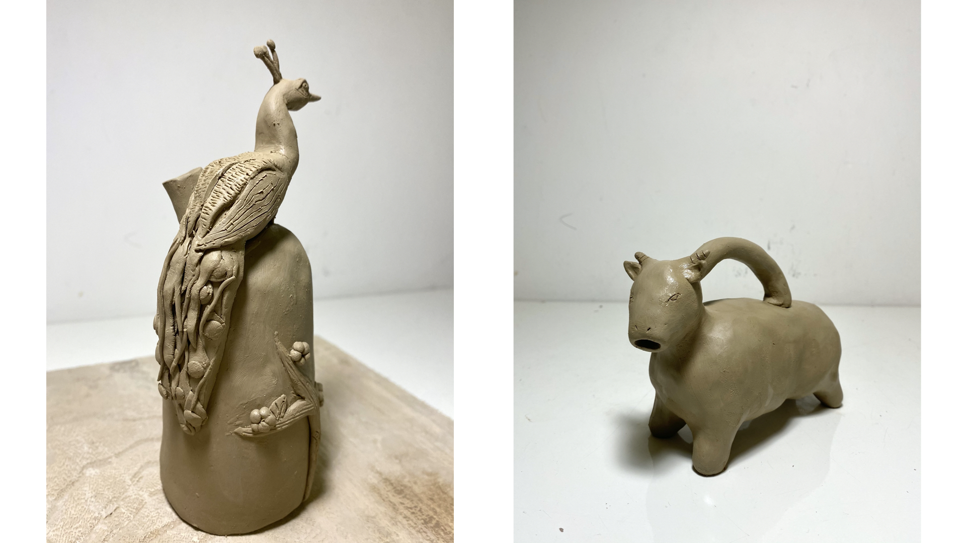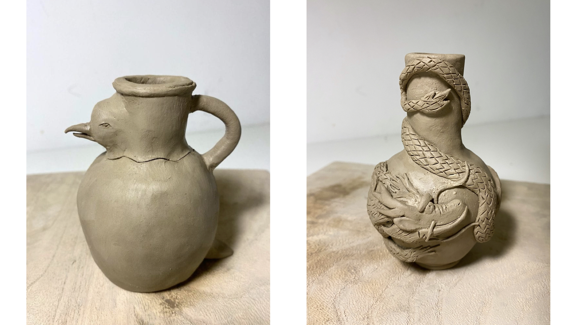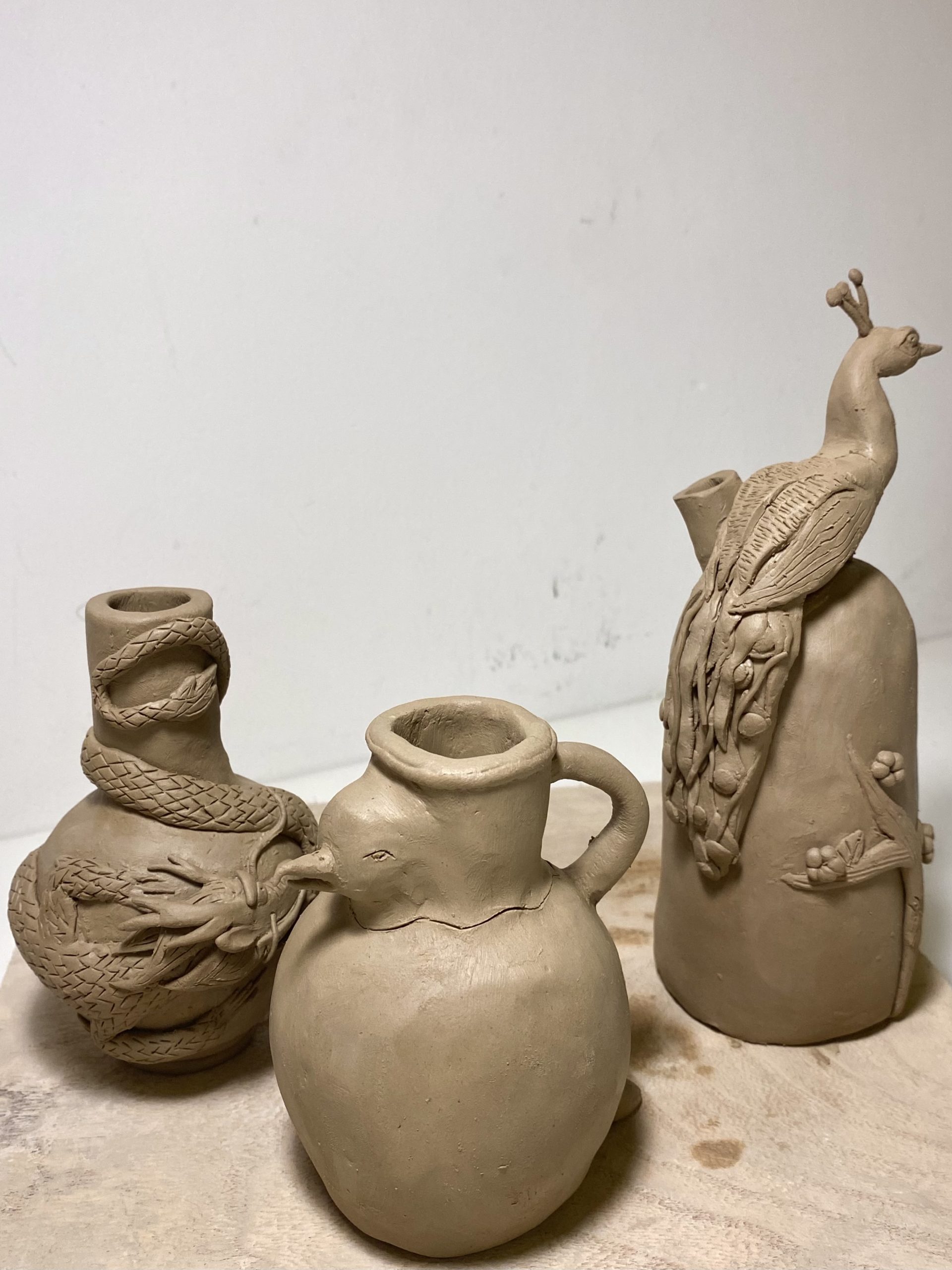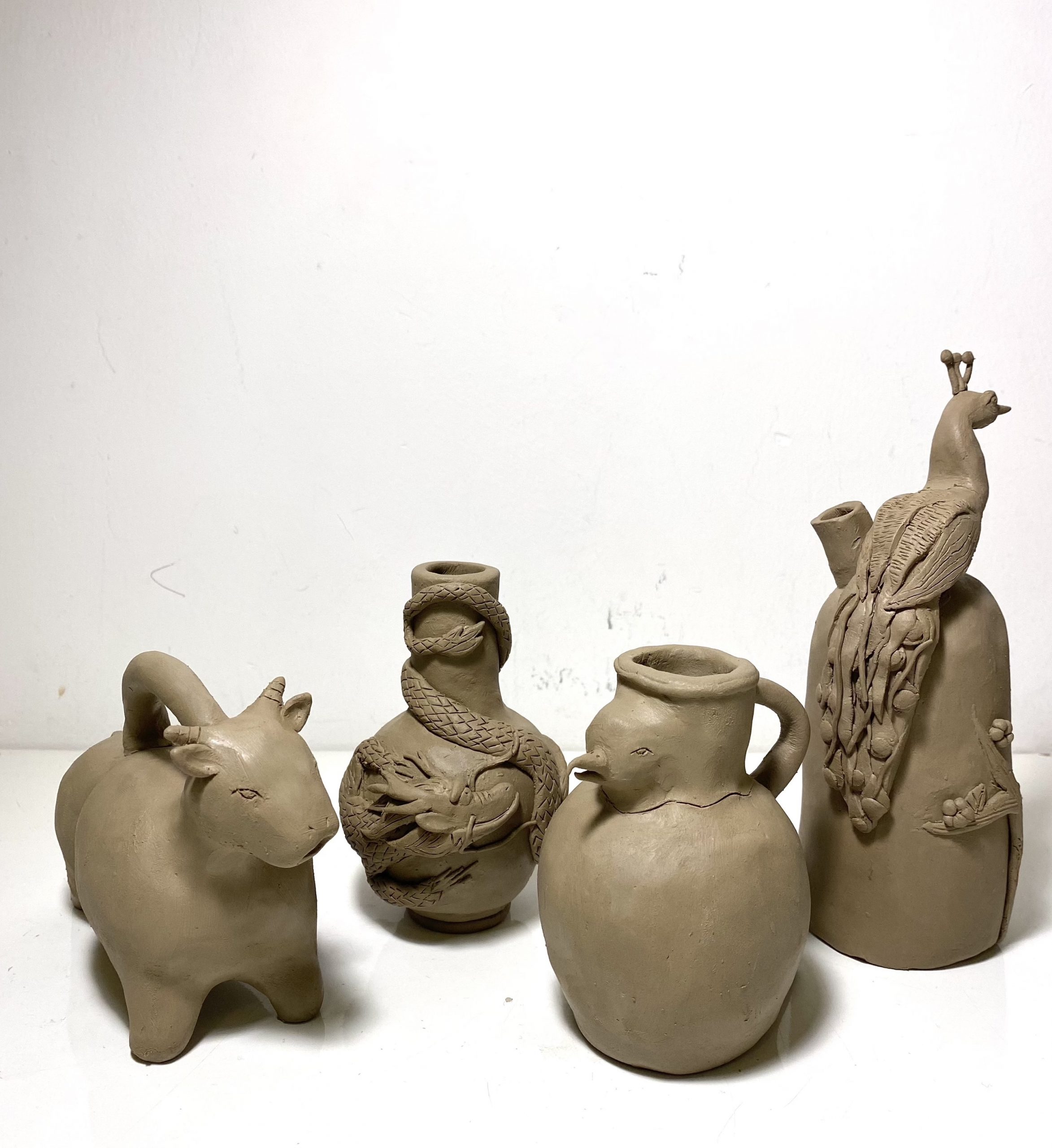 While examining the different kinds of containers, I was particularly attracted to the animal styled vessels that originated in ancient Asia. Inspired by the diverse embodiment and integration of animals and vessels, I based this project on creating containers in clay around this theme. As shown in the pieces I’ve created, I tried to combine the two qualities through different methods. On one hand, I attached the forms of animals directly to the vessels with the dragon and the peacock containers. Contrarily for the pigeon and the ox, I decided to directly integrate the bodies of the animals into the vessels.