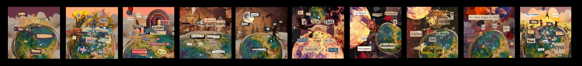 Prompt: We were supposed to use found images and words to create a series of images with poetry. They need to have a sequence and a story that connects them.