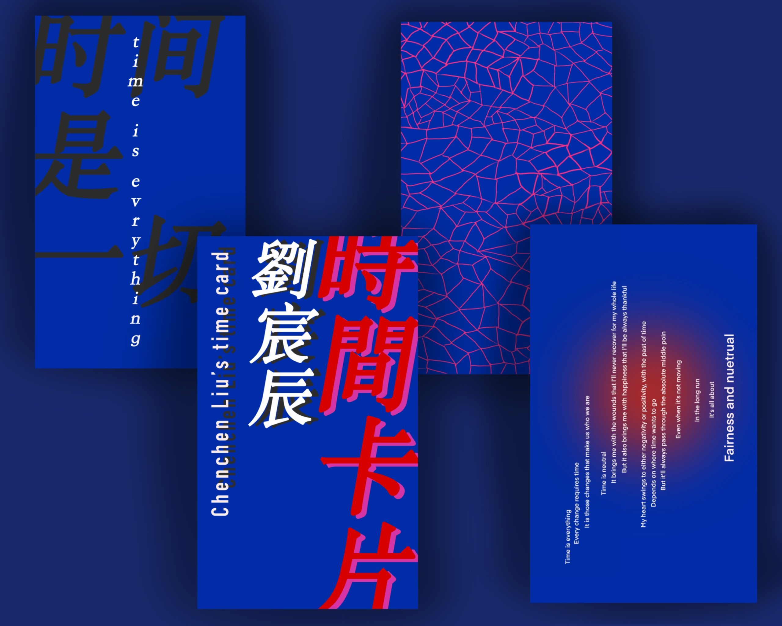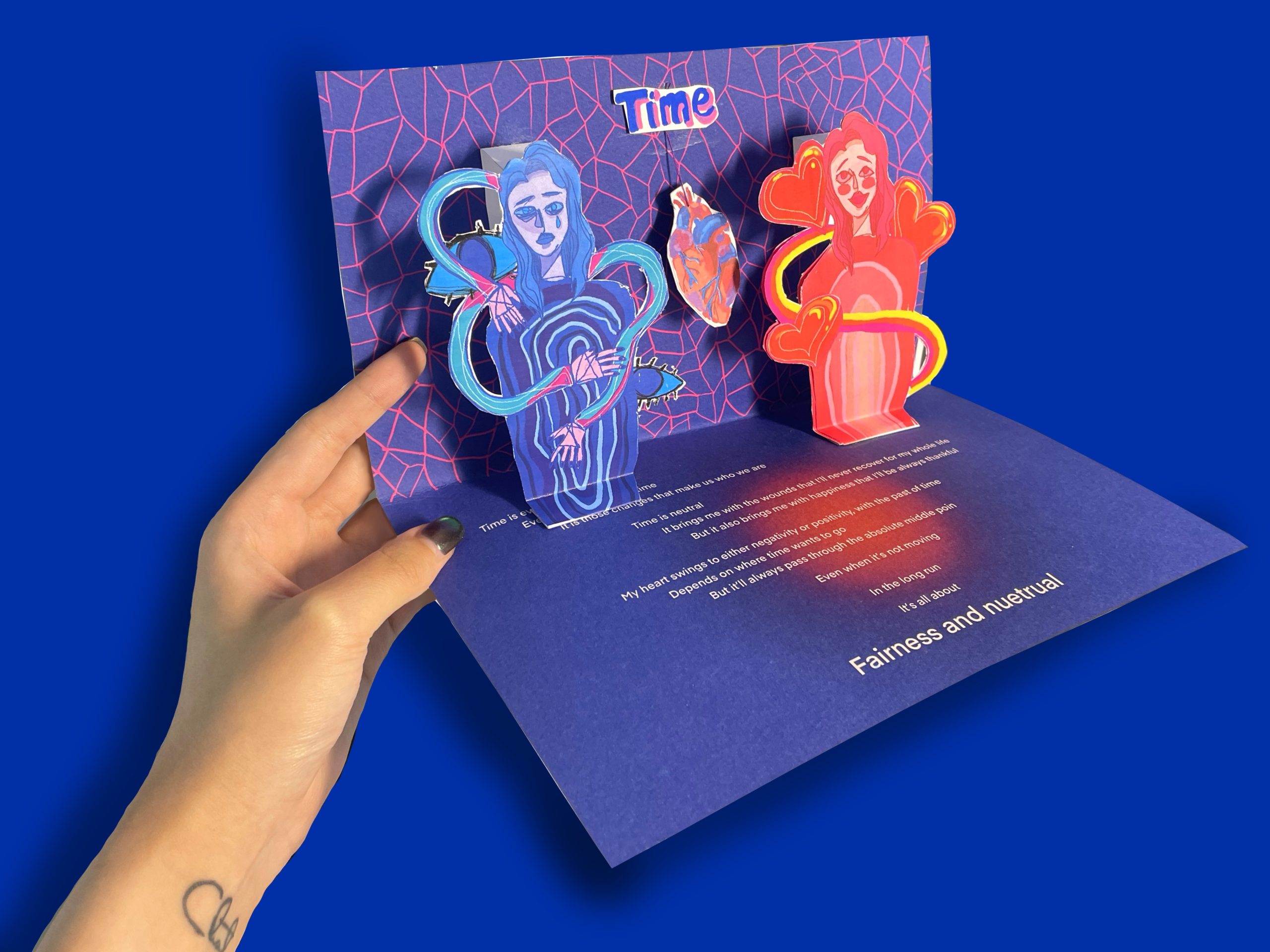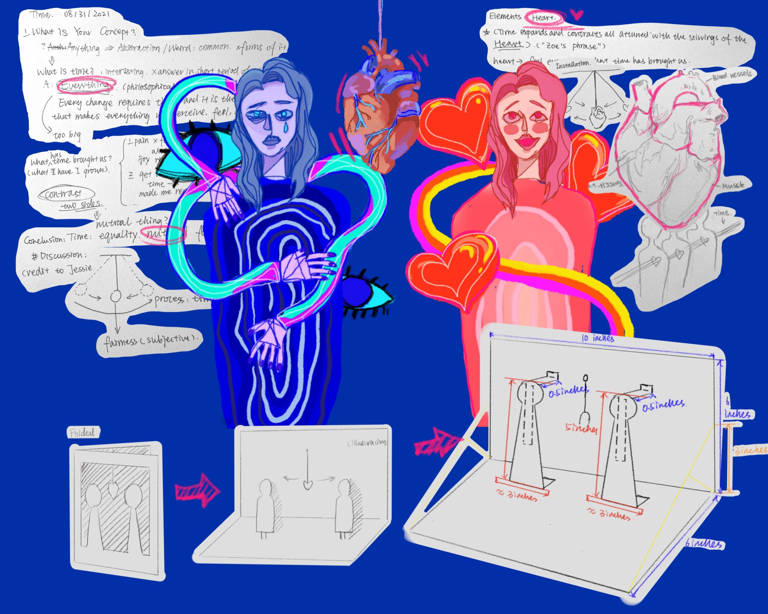 Then I focused more on how I can relate this concept more specically to myself. I added an element of human heart, because it is the heart that enables people to feel the past of time, emotions, and memories. And then I added tow self portraits in different colors and emotions on the two sides of the heart. After nishing all the illustrations and cover designs, I printed the card at the Design Lab. And I’m very happy with the final outcome.