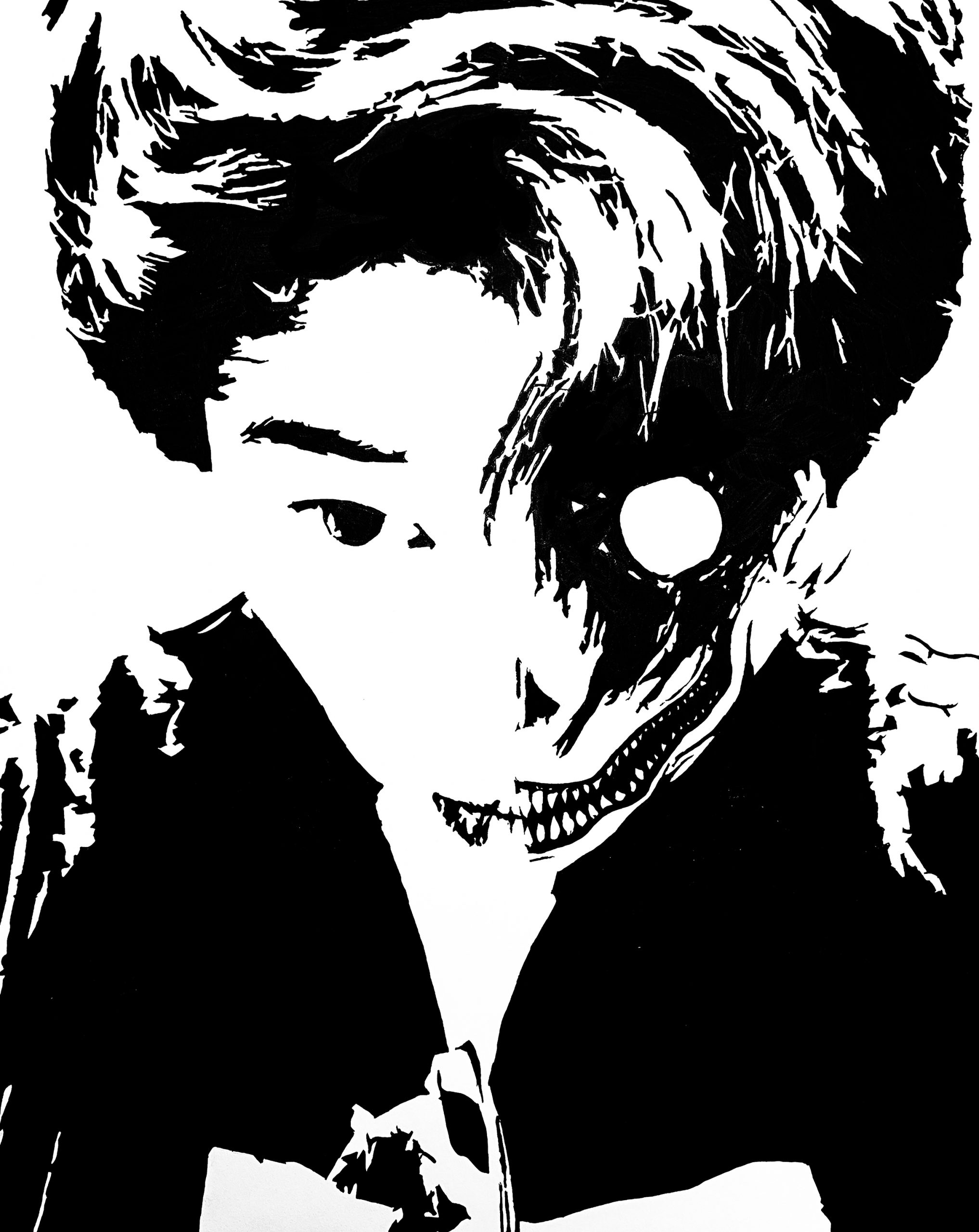 The piece is a self-portrait, which expresses my internal perspective and emotions in a personal interpretation of the ‘hardest part of being still’. I have bipolar II depressive and traumatic stress disorders, and my piece depicts the repression of my internal trauma and turmoil. I chose ink as the medium to provide a stark contrast between its darkness and the light of the canvas. I sought to utilize negative space to portray my face as an allusion to the practiced façade which masks the dissonance of my internal suffering as represented by the left half of the face.