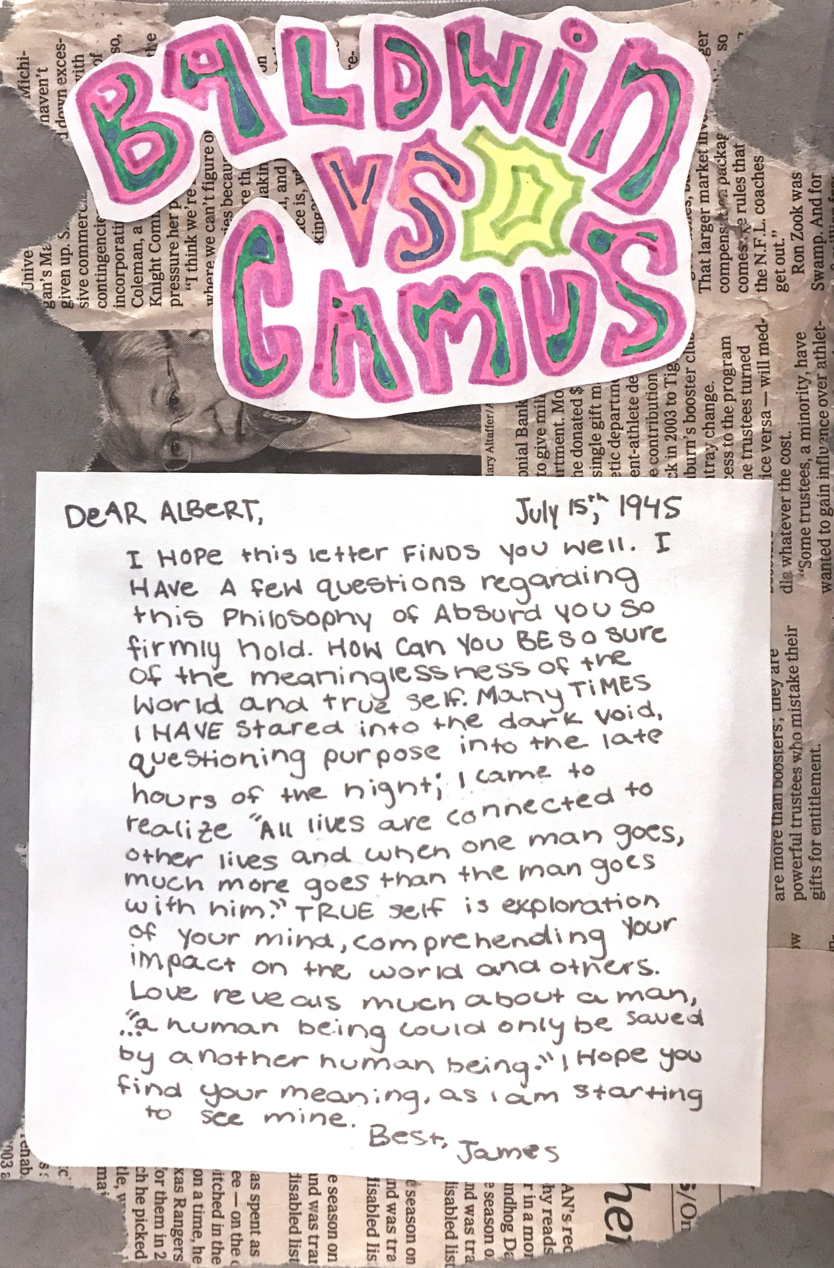 I decided to add an ending letter after reading an essay of James Baldwin’s that he wrote at 4 am. It was a stream of consciousness where he examined the meaning of life, and did settle upon a few. It started out bleak and quite similar to Albert Camus philosophy of the absurd, but transformed into a beautiful sentiment. These two would have an in depth conversation about the true purpose life and if it even exists, and I wanted to translate this through my letter. They seem to understand each other in a way, though Baldwin carries vastly differing views of life’s significance.