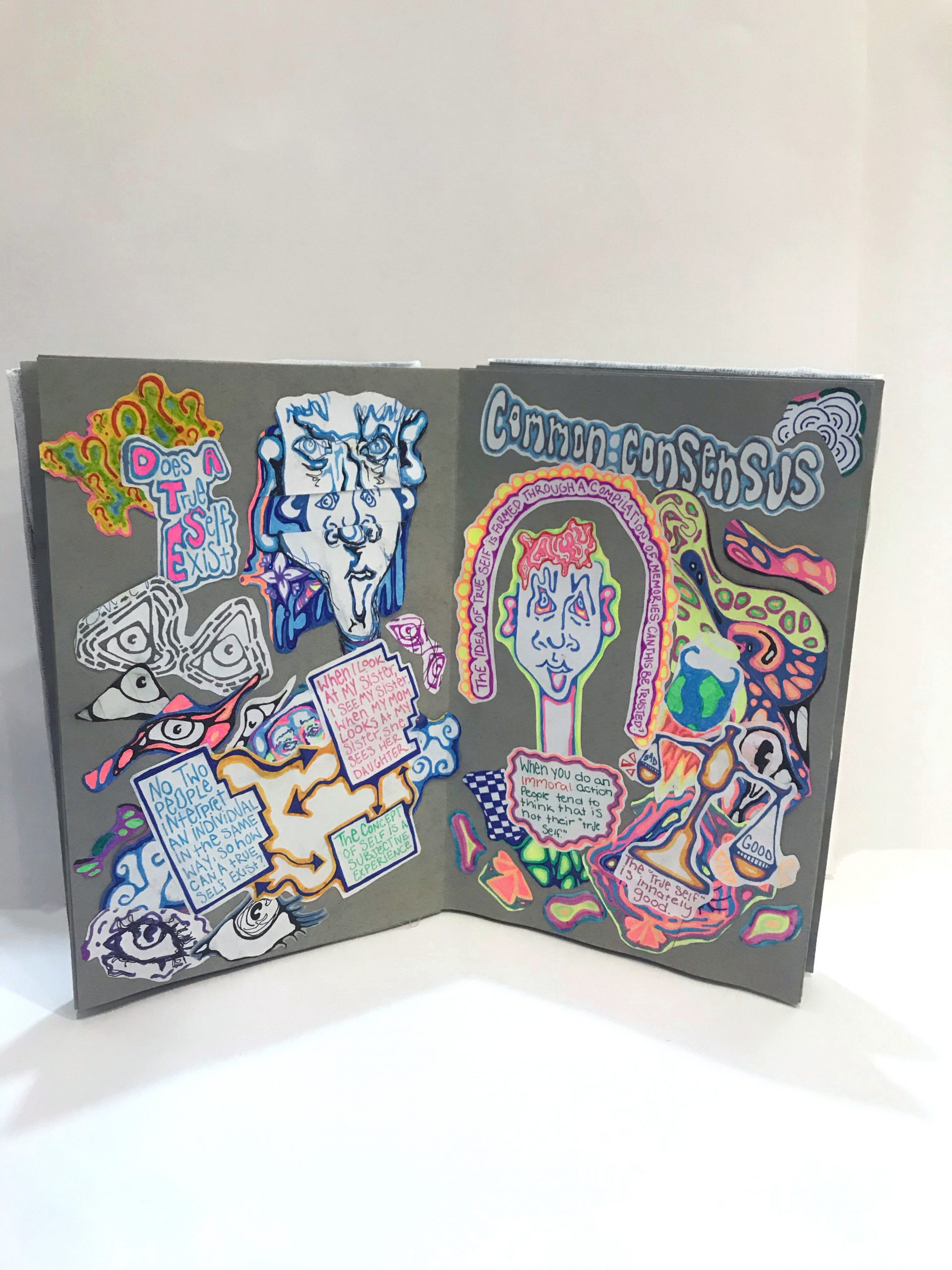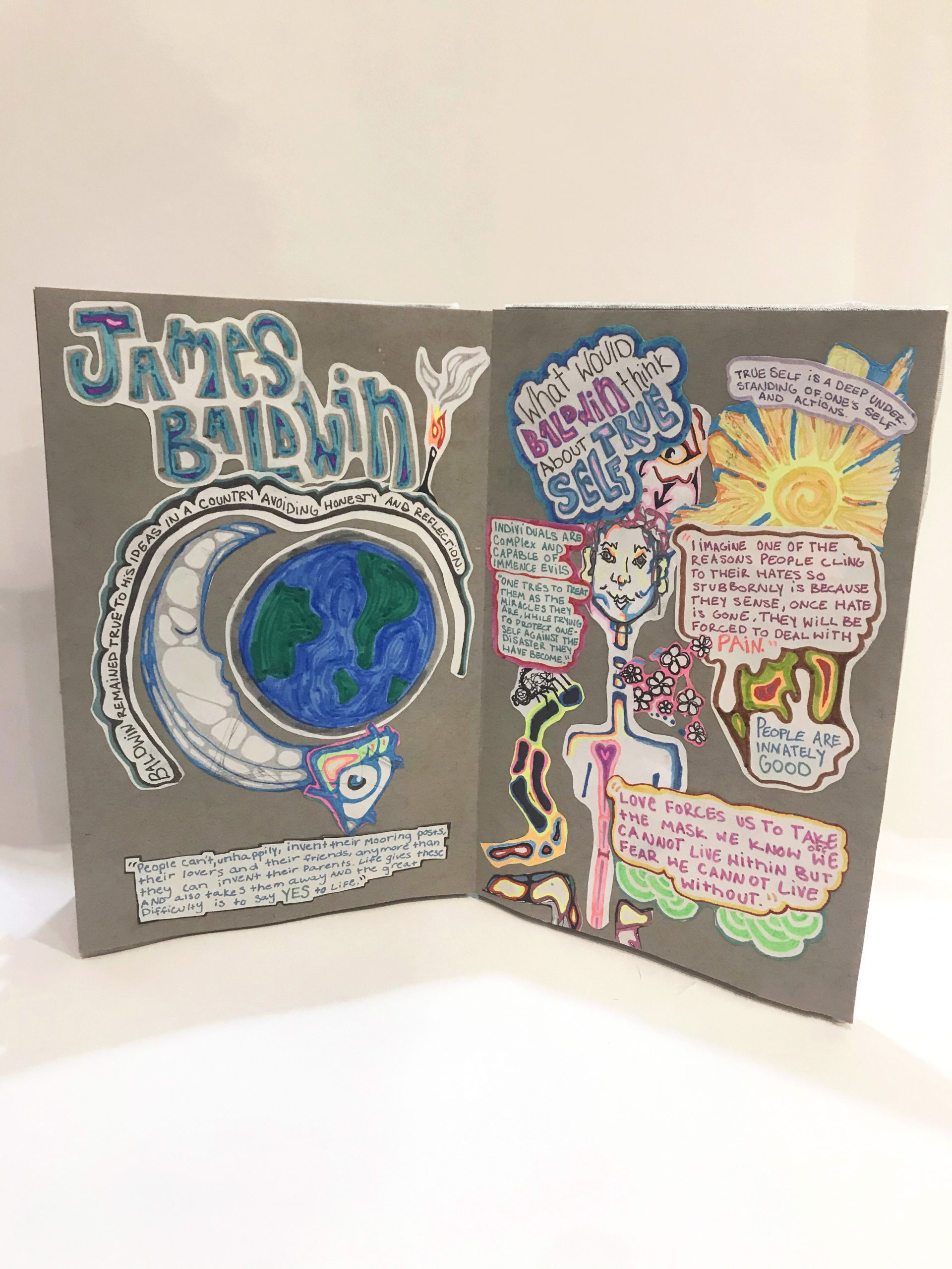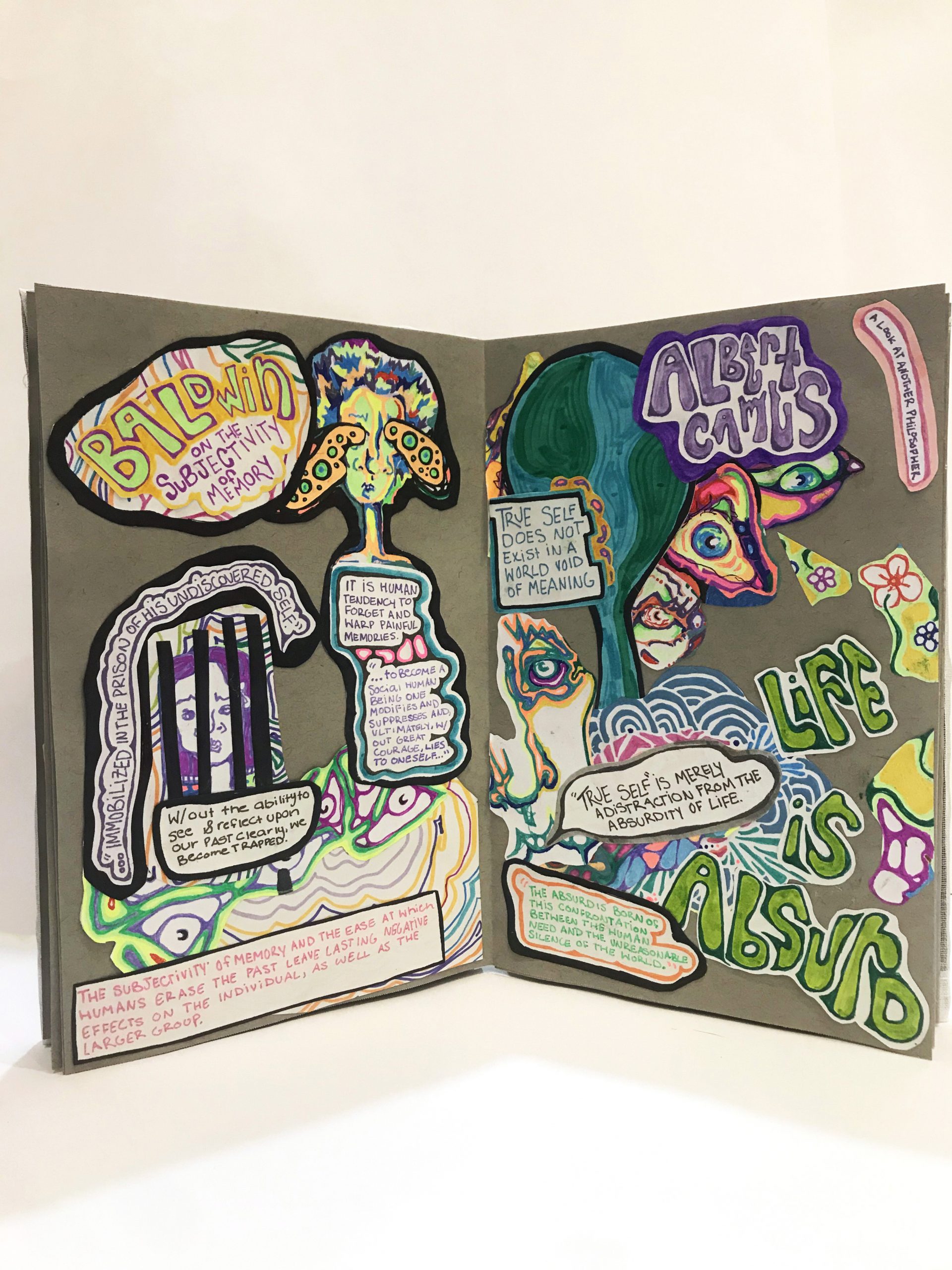 When presented with this open-ended prompt to create a book incorporating both seminar and studio topics, my mind immediately went to James Baldwin. I was fascinated by his ideas surrounding the artist’s role in society as well as his view of memory and how humanity chooses to ignore and rewrite painful history. While reading his essay, “The Creative Process”, I began making connections to my favorite philosopher and writer, Albert Camus. I thought it would be intriguing to pretend like Baldwin and Camus were reading my seminar essay and responding to ideas I formed surrounding memory and true self. The more research I did on both of these philosophers, the more I started to see the similarities and differences between how they saw the world. Philosophy is a truly unique field as no one can be wrong in their concepts, it all just depends on how one’s outlook; I kept a running theme of eyes on each page in order to illustrate this.