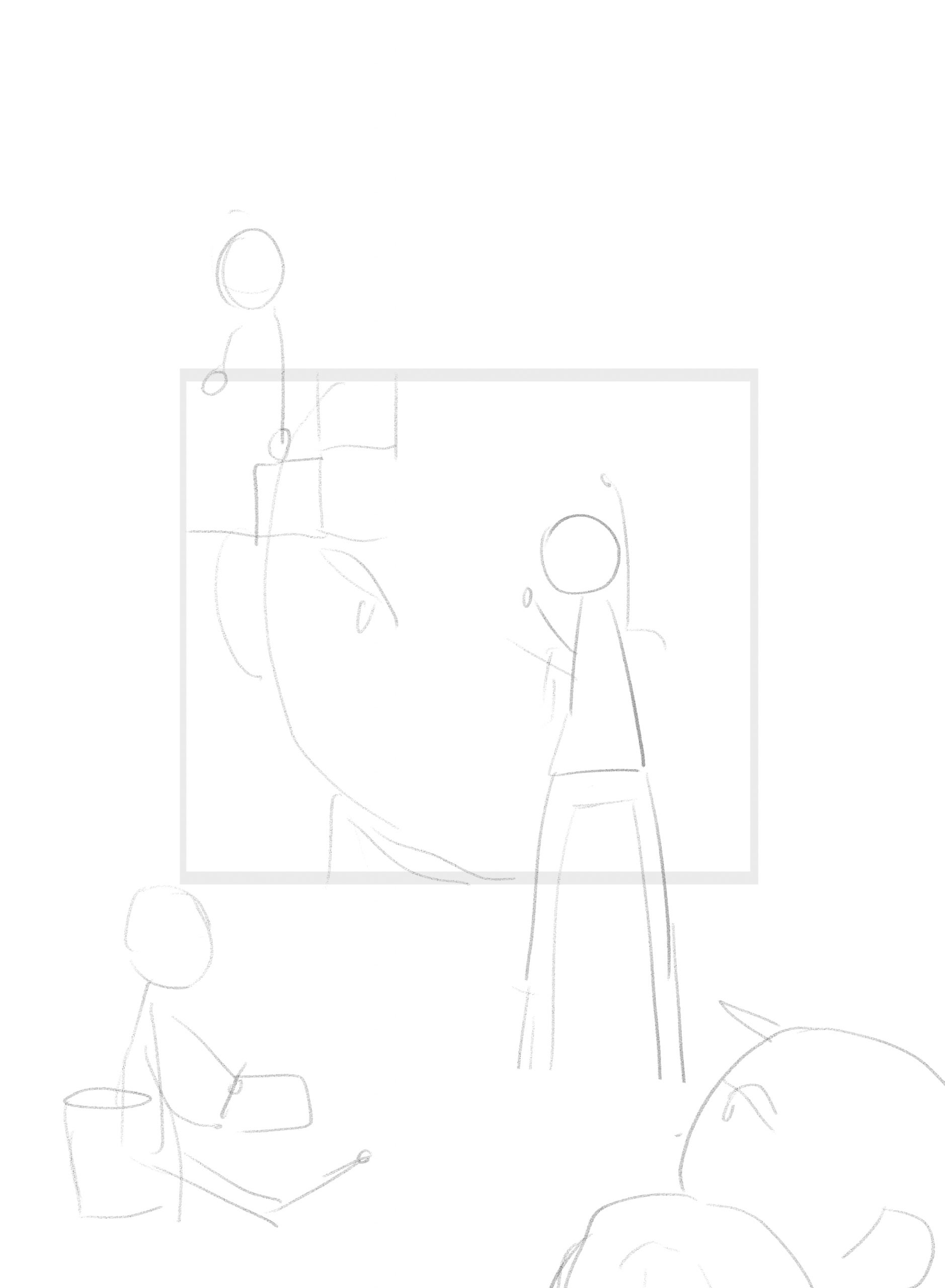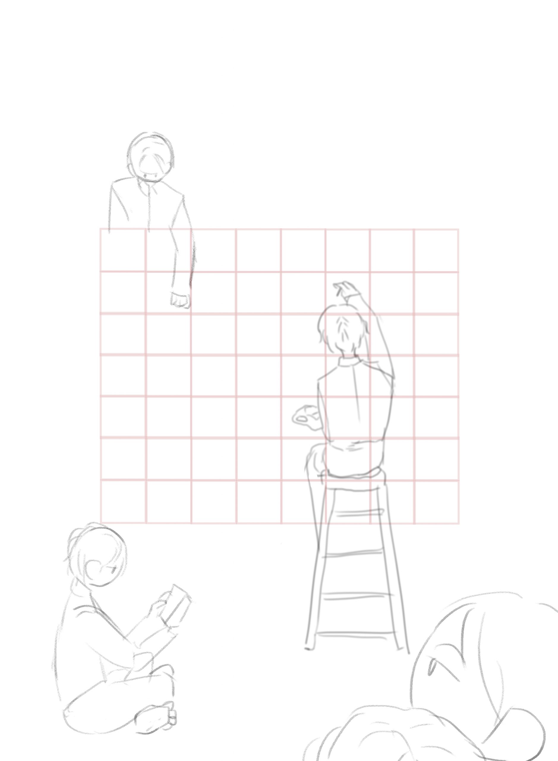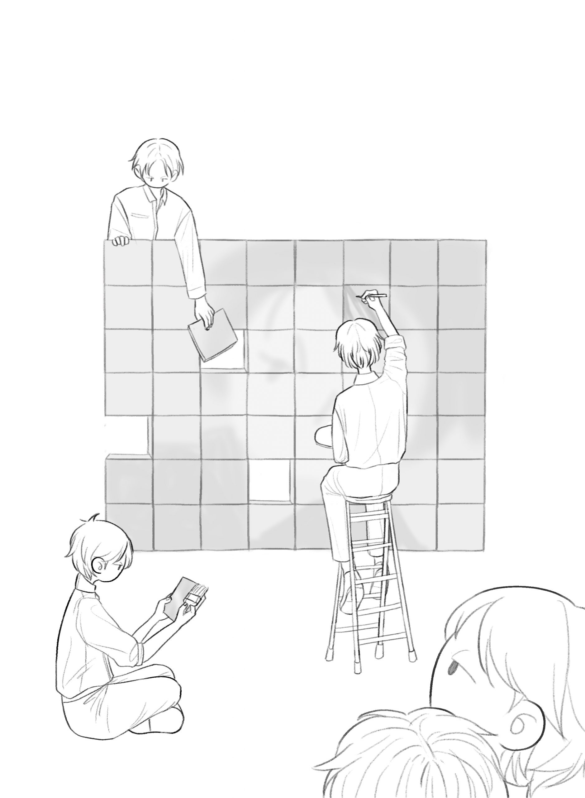 This digital drawing of five characters of myself depicts the process of revising and editing. The character sitting on the floor represents a first draft or a sketch. The one sitting on the stool adds details to the painting to enhance clarity. The main inspiration for this character’s posture and the uniform was inspired by Norman Rockwell’s Triple Self-Portrait, as the drawing portrays me. Also, the character literally paints herself. Another character taking a brick out of the mural indicates removing unnecessary parts of a work. The other two characters observing the entire process represent feedback from myself and others. Altogether, the characters express the continuous process of improving writing.