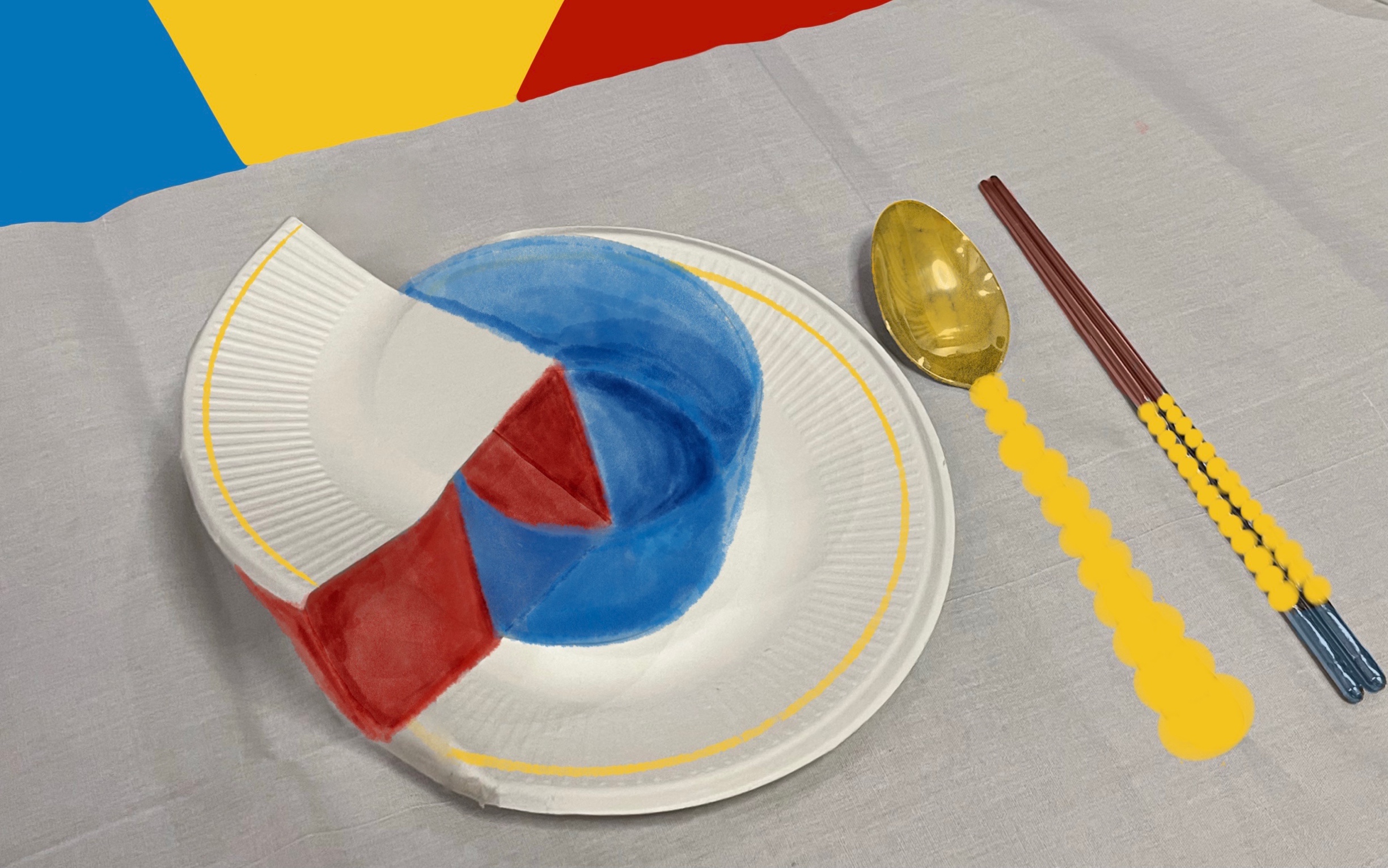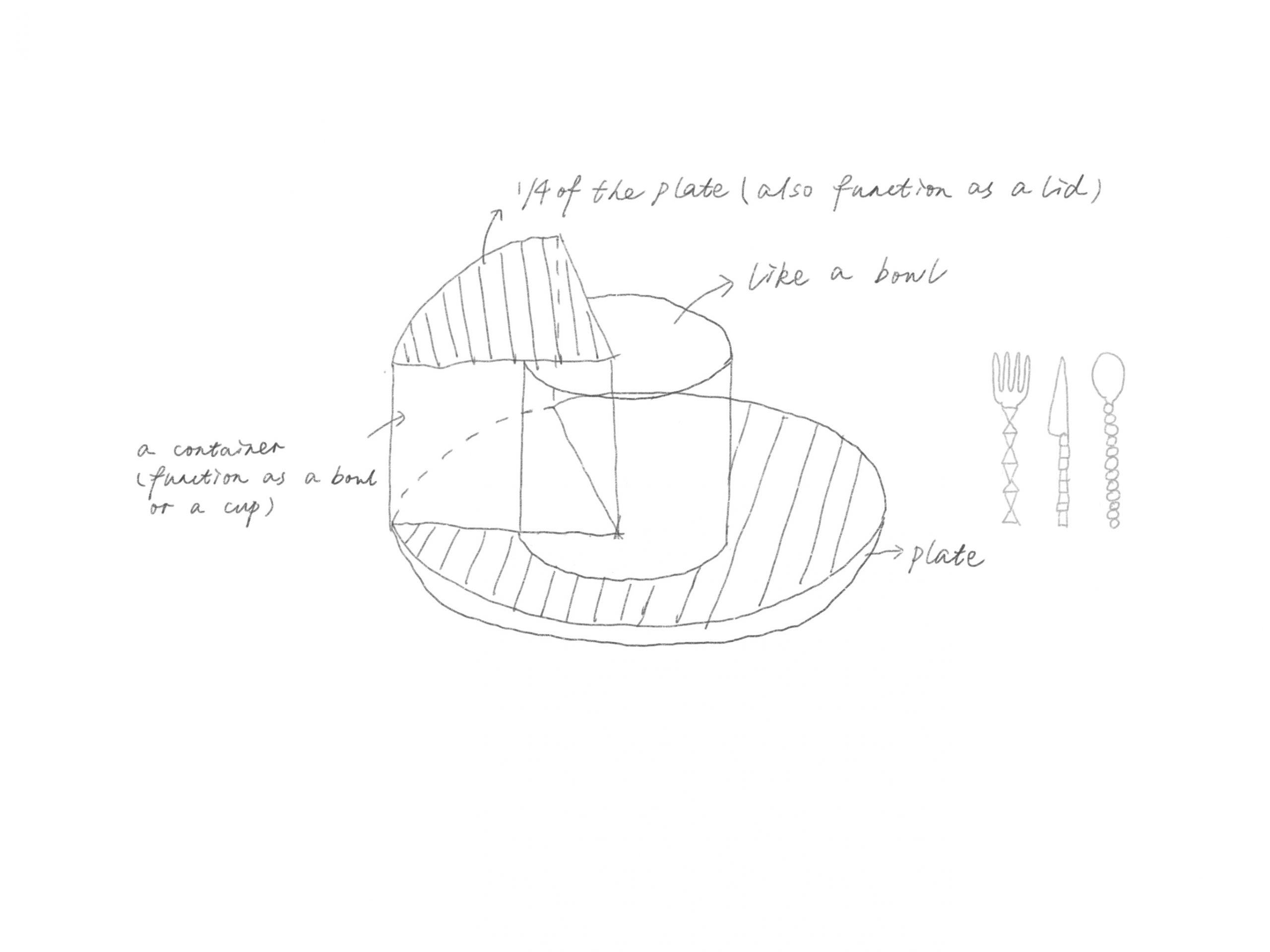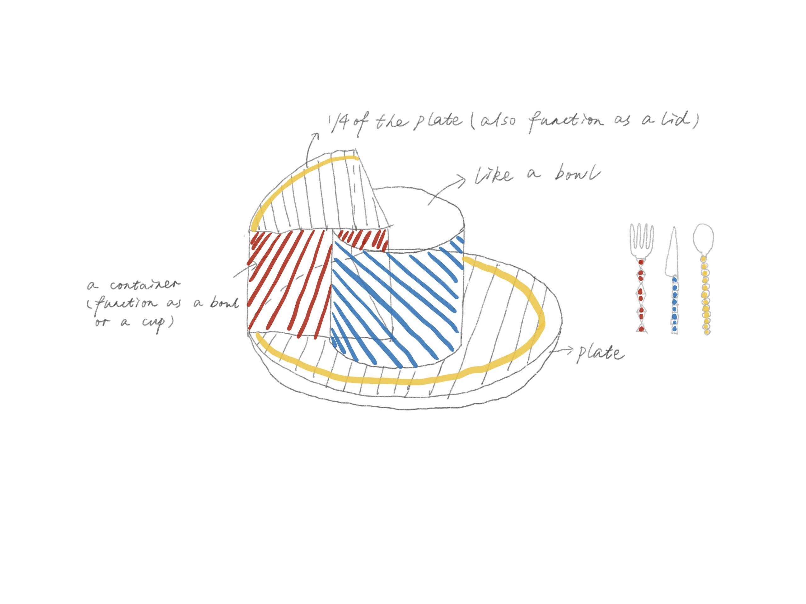 First, I made two sketches, marked the functions and colors, then I used paper plate and plastic for simple assembly. The most typical features of Bauhaus style are the use of red, yellow and blue, the use of geometric figures, and pragmatism. So in my works, I paid more attention to the functional design, and I used red, yellow and blue three colors simply as the appearance design. My design is to move a quarter of the plate to the top, and then use the plate as the cover, and put a similar cup or bowl under it, which can be used to hold drinks or soup. The plate serves as a lid to store the temperature well. A cup or bowl is also embedded in the middle of the plate. The two devices have a high degree of freedom and can be used differently according to different foods. At the same time, both devices can be taken out, and the plate can be put back in its original position. Instead of knife and fork, I chose chopsticks. Spoons and chopsticks are highly used in my life. I mainly design spoons and chopsticks in red, yellow and blue. The yellow ball part is made of some soft materials such as rubber, which makes eating more comfortable.