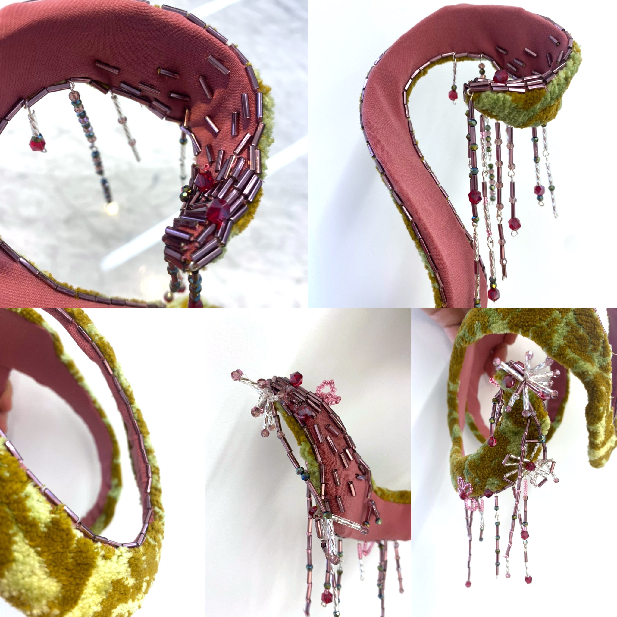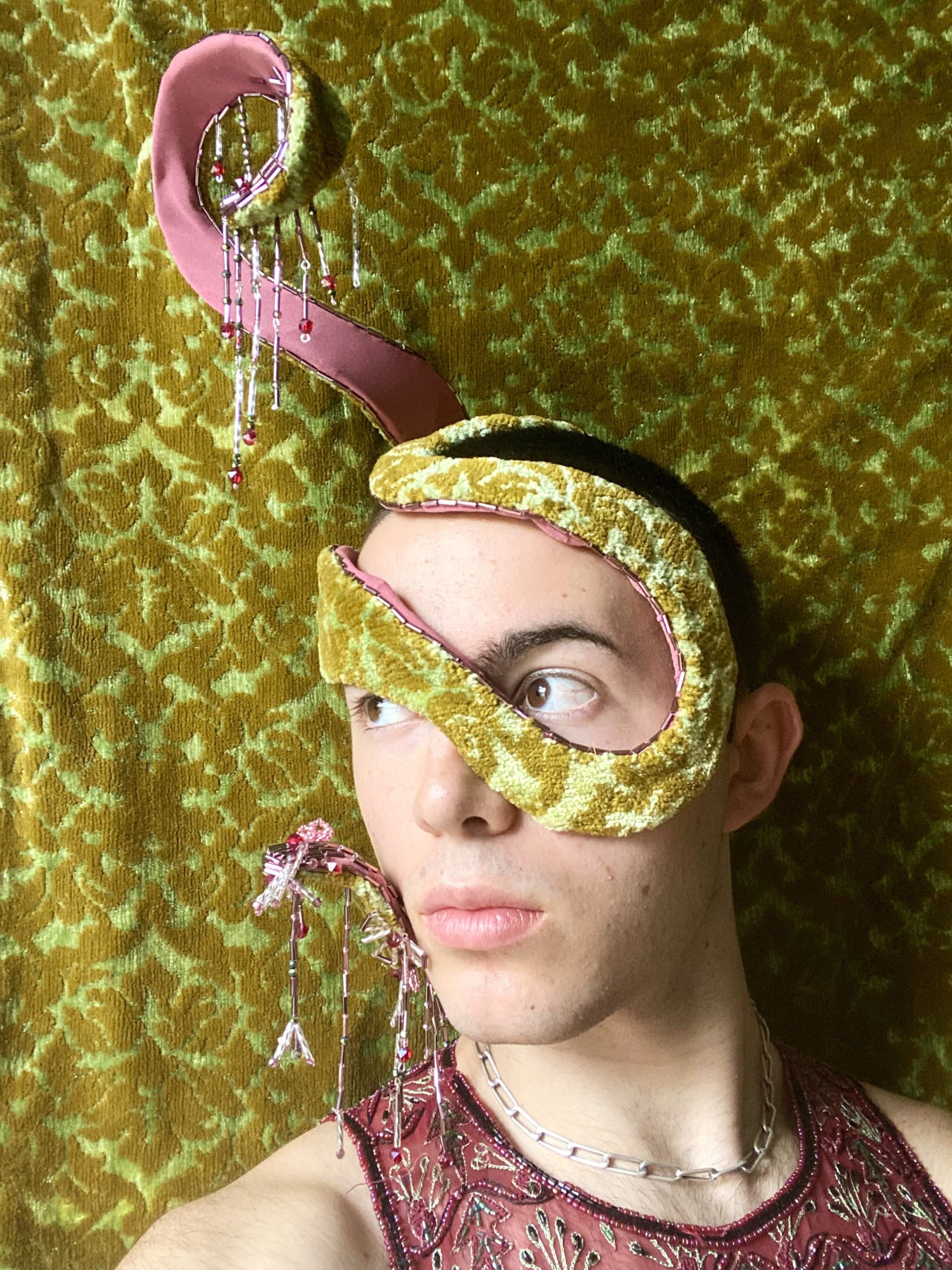 Medium: Fascinator made of vintage upholstery fabric, spandex, steel wire, and glass beads.