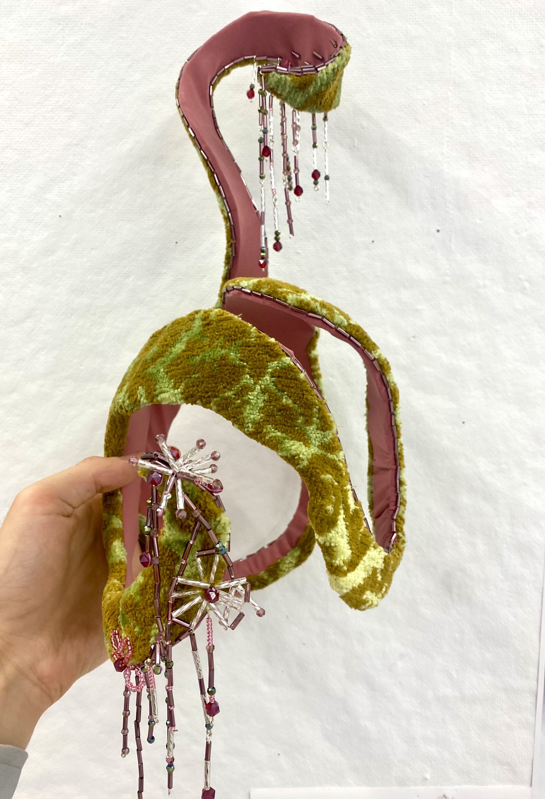 Though this piece was created to go along with a character I created in Integrative Seminar 1, that did not at all dictate its design. I have always loved hats and fascinators and have made wire-based pieces in the past. When I found out we were going to be making masks based on fictional characters, I decided to have my character be a milliner which would give me almost total freedom to create any sort of headpiece I wanted. When designing something as complicated and technical as a fascinator I really don’t like going into it with any sort of creative constraints, so for me, this approach was perfect. Over the past year, I have been experimenting with structured pieces that appear to have been generated in a completely organic way, with undulating lines and sensual curves. I continued that theme with this piece. Originally the hat was going to be red vinyl but I found that it revealed too much of the wireframe underneath. I had some green vintage couch fabric under my bed from a trip to the flea market and that was when the hat took on a more fantastical element. From there I decided the hat should walk the line between a snake and carnivorous vine: stunning but possessive. Ironically the end result did actually embody many parts of the narrative I created for the character, which was a lovely surprise.