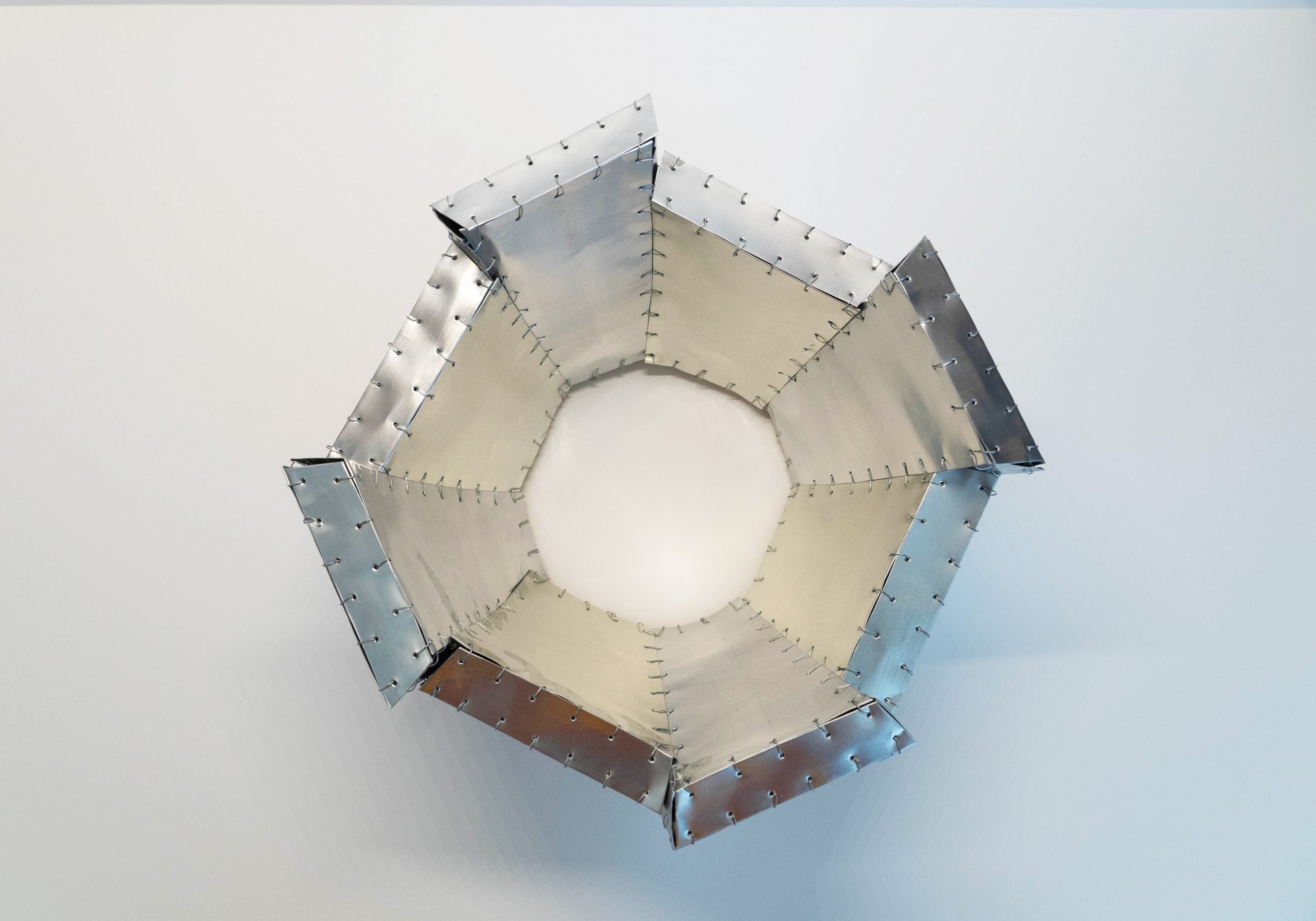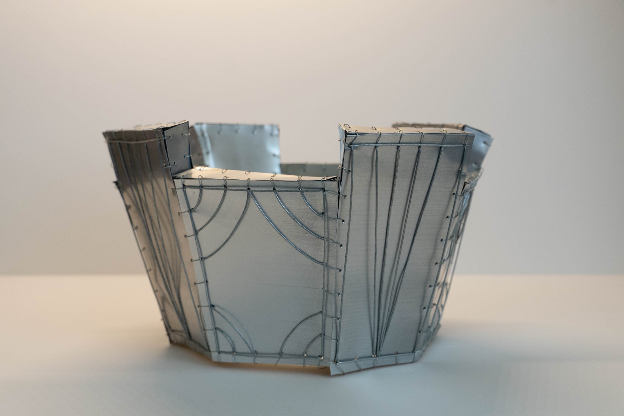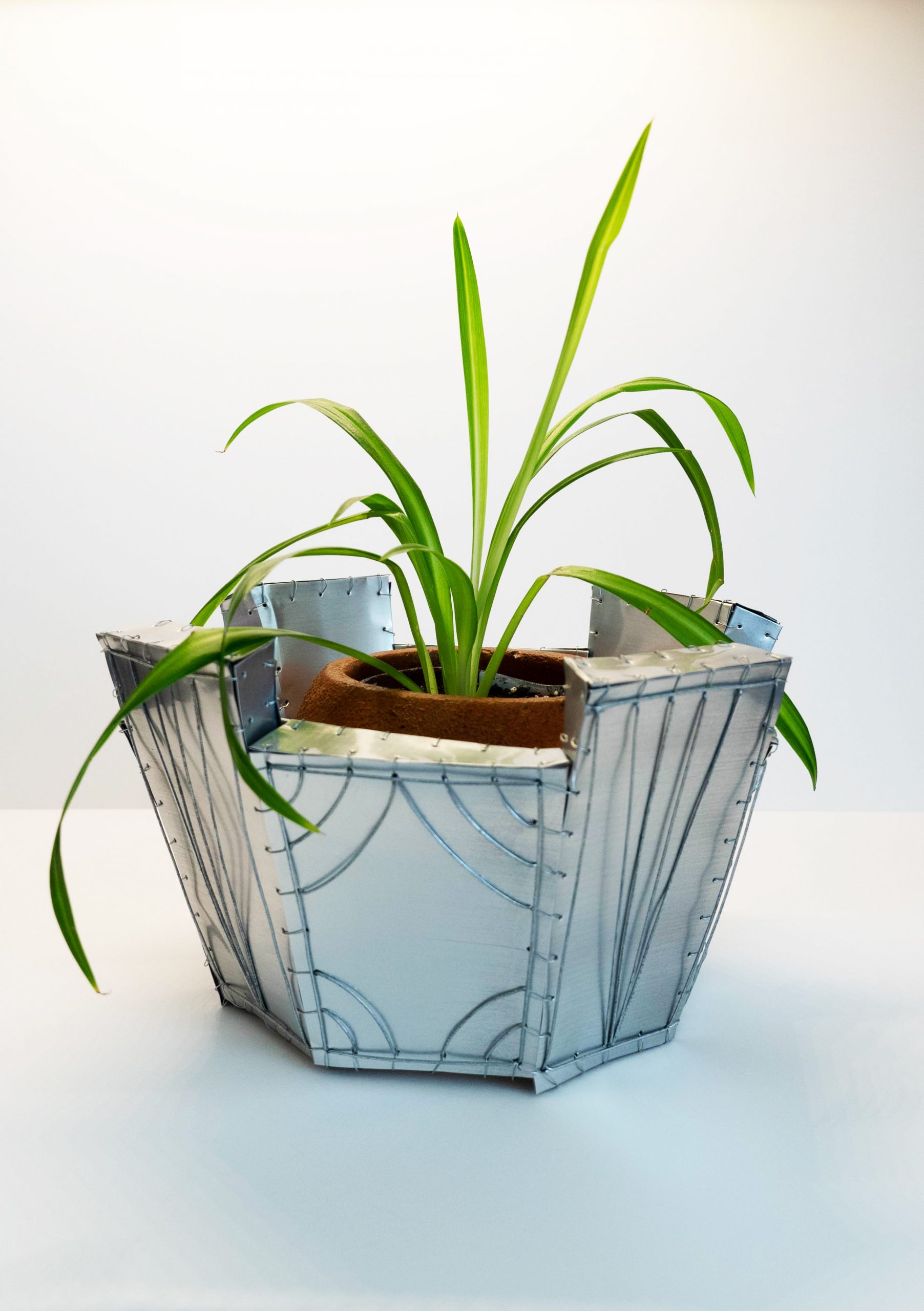 For this first assignment of the semester, I brought in one of my plants, a spider plant named Saint Nigel, that I carried with me from Idaho to New York. I felt that it represented me through my passion for environmentalism and a little piece of my home. When choosing an art movement to design with, I chose Art Deco, which has an aesthetic far from anything I had done before. I loved the concept of creating a facade of elegance and regality and using very geometric, straight lines to contain a very organic object that almost explodes out of the top. In my research, I saw a lot of shapes with cascading layers, use of parallelograms, metal, intricate and bold embellishments, and statement pieces that inspired the design. I started with a linear model, using wire, to construct the outline that would eventually become the shape of the final, and I began to add embellishments. I then moved on to a planar model made out of reused paper and a volumetric model out of recycled foam core. The final model combined elements of the linear and planar iterations. Seeing a lot of silver and metal used in art deco architecture and aligning with my environmental theme, I collected empty soda cans from the recycle bins in my dorm hall as the main material. I cut, folded, and punctured the material to allow me to sew pieces together with wire. A thicker wire was used to add the detailing that really makes the piece art deco inspired, and creates the intended facade for my plant, Saint Nigel.